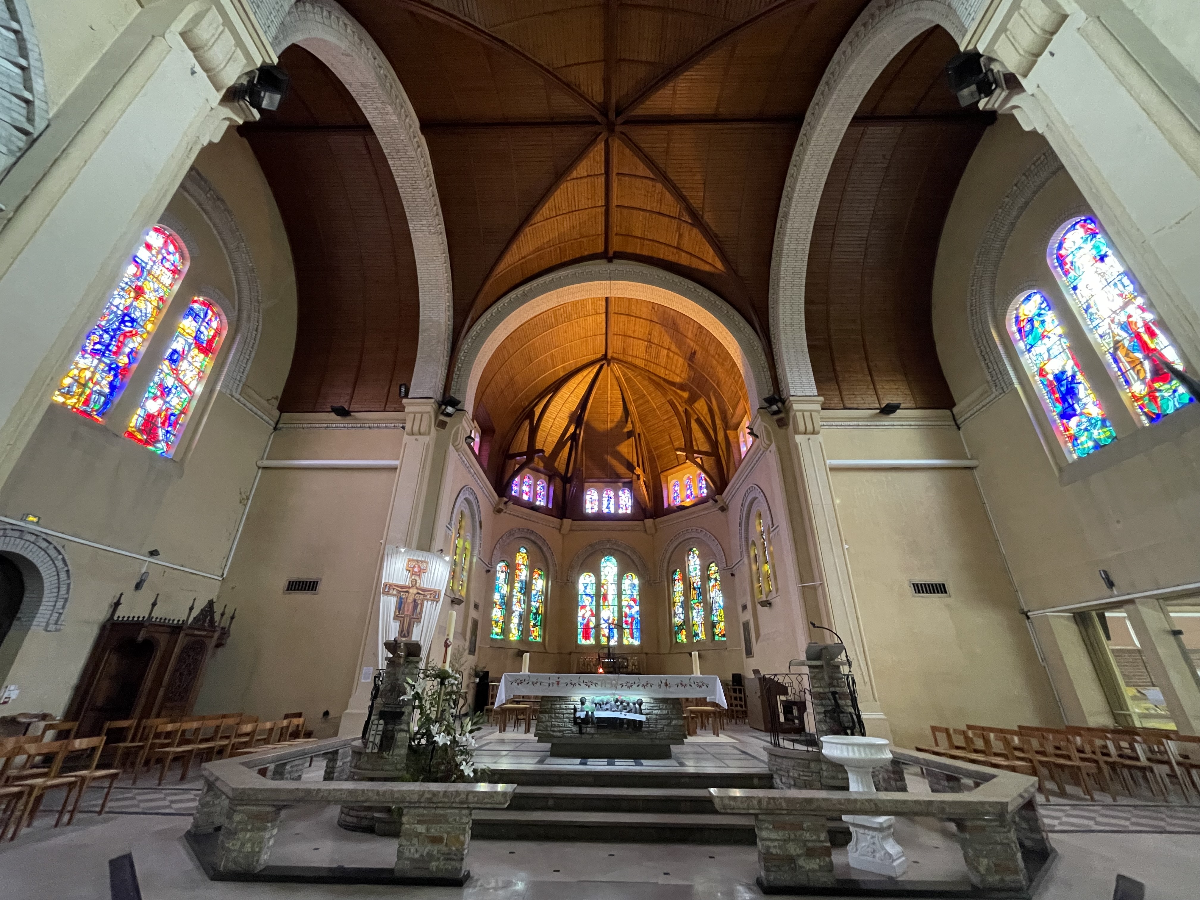 Très belle voûte en berceau , toute en bois . Vitraux du XXème aux couleurs chatoyantes . Église très lumineuse .