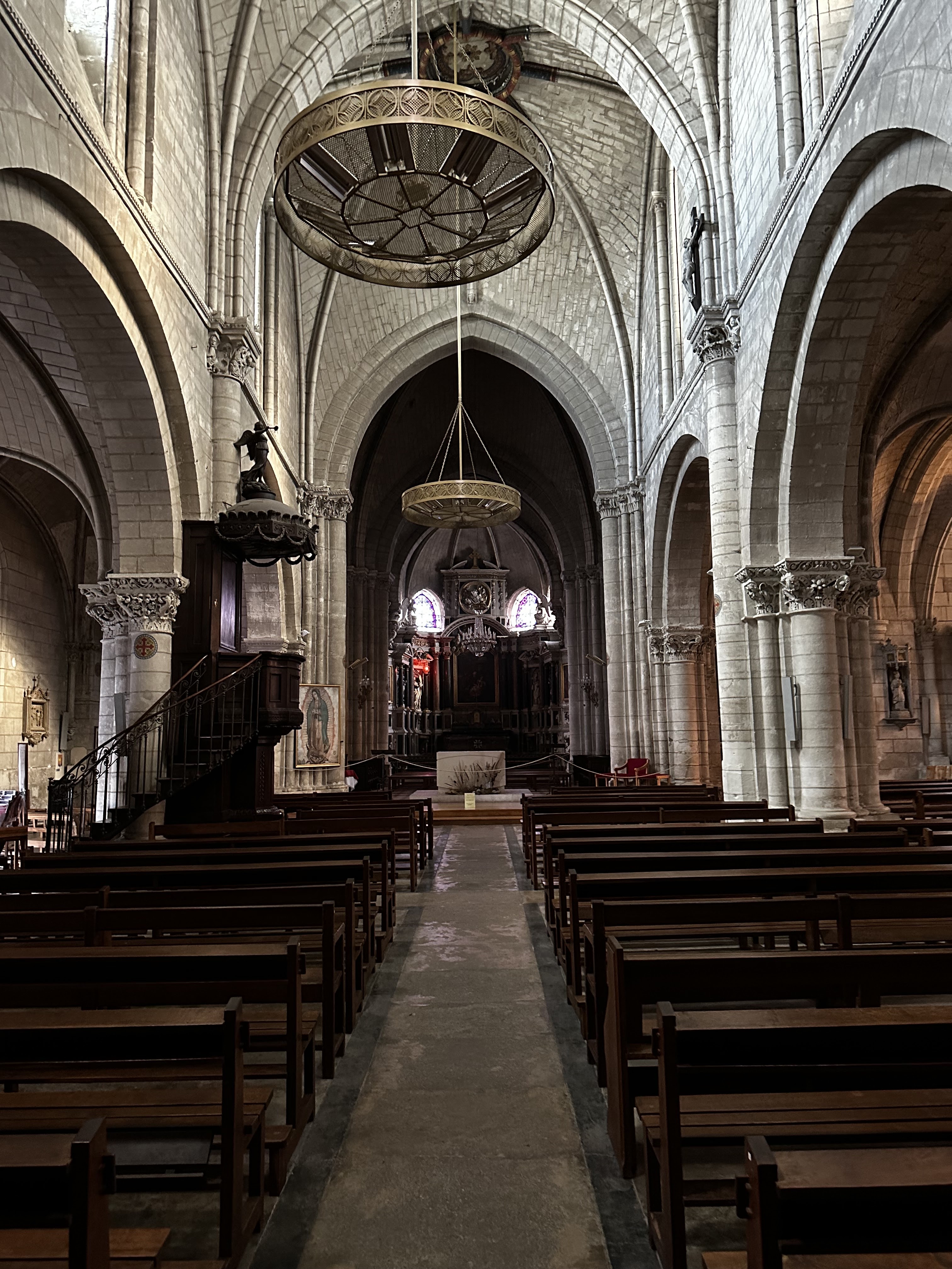 Très bel édifice à l’opposé du château et à l’écart sur une hauteur. Un ensemble simple et pénétrant de pierres et de voûtes. On se laisse facilement envoûter par son chœur et ses allées un peu sombre et sobres. Des vitraux très travaillés et des ornements rares mais très fouillés.