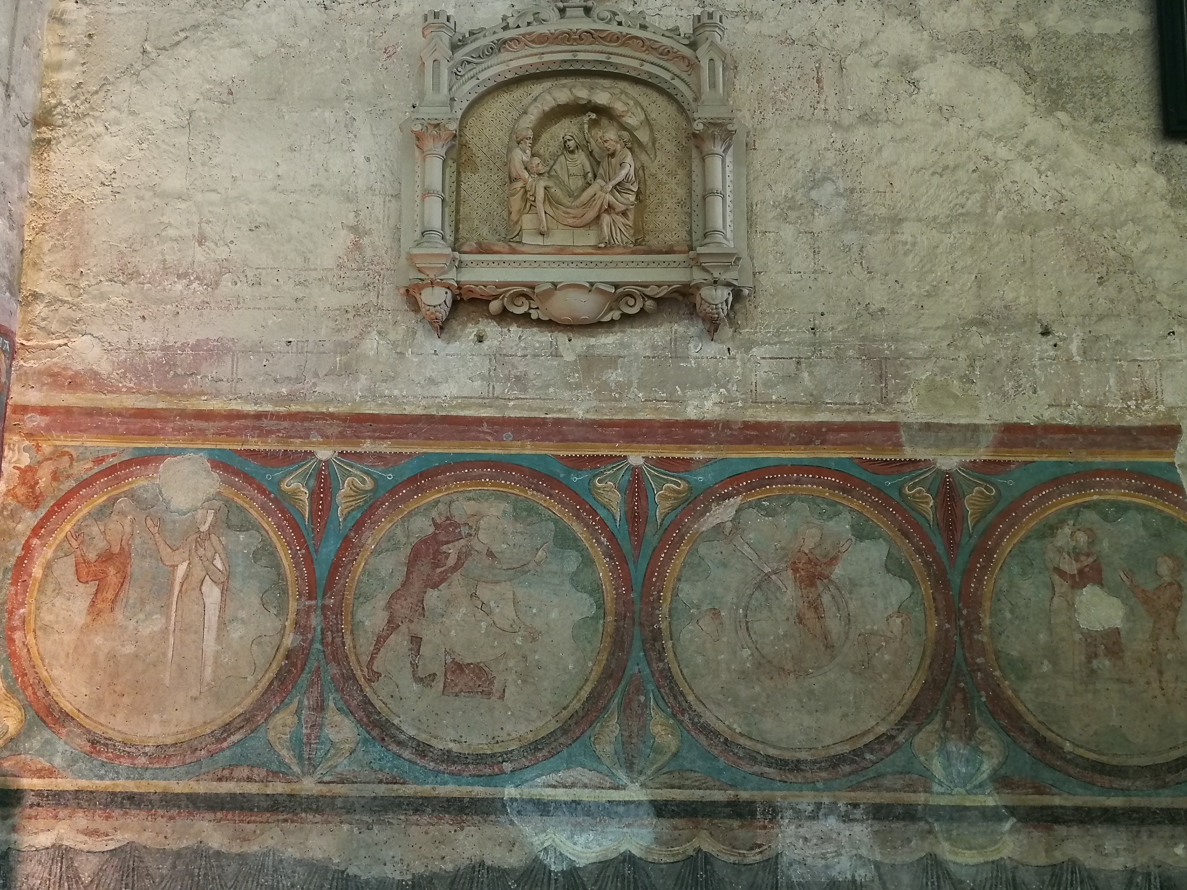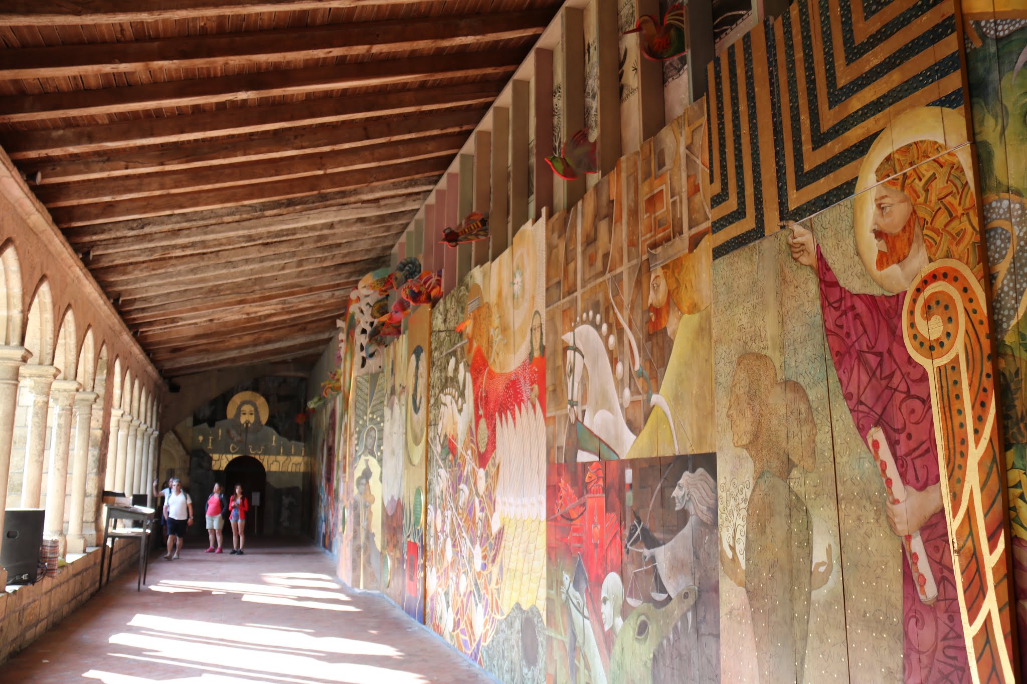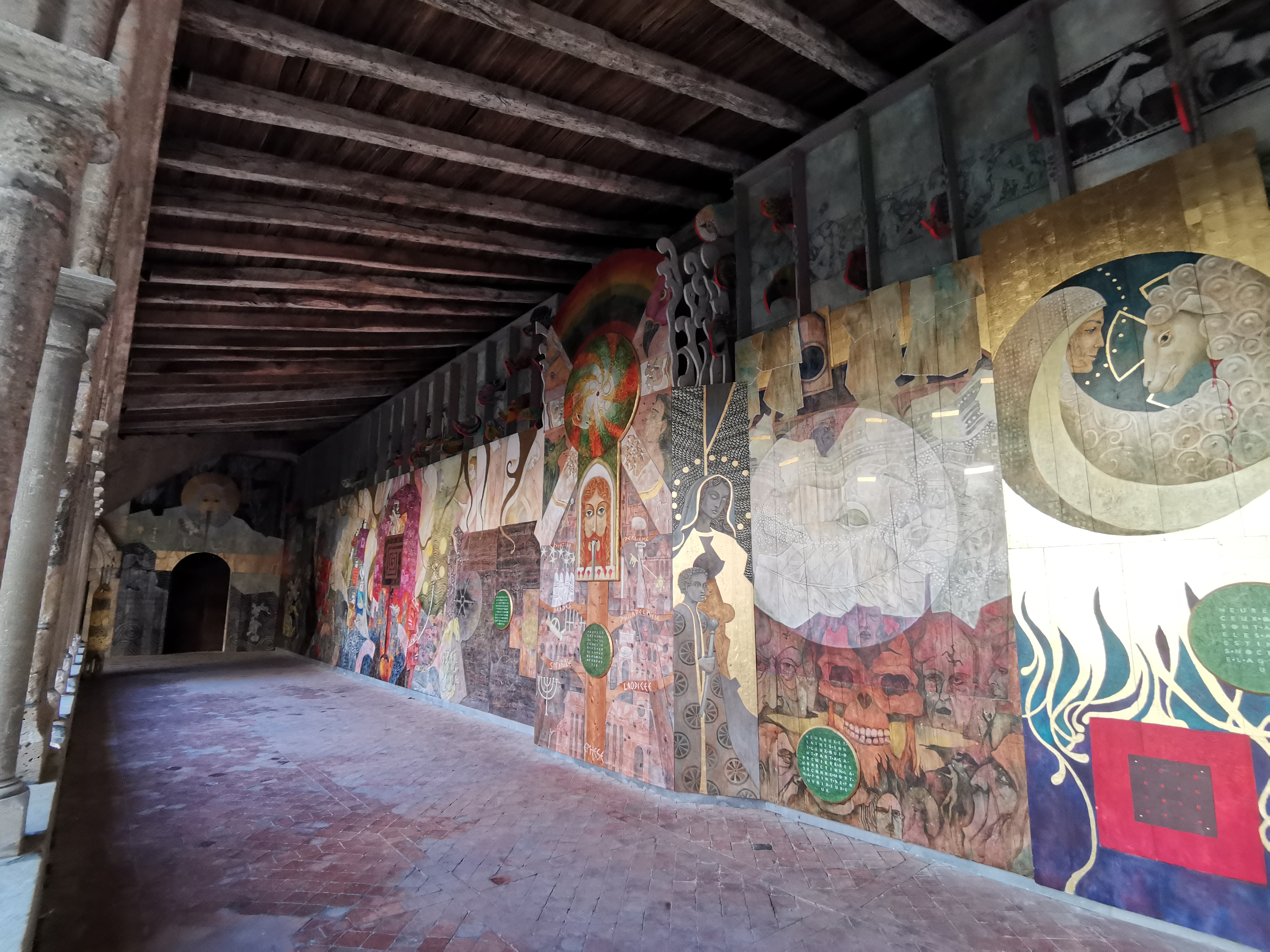 L’église est en travaux de restauration. Très beau cloître avec des peintures murales pleines de couleurs