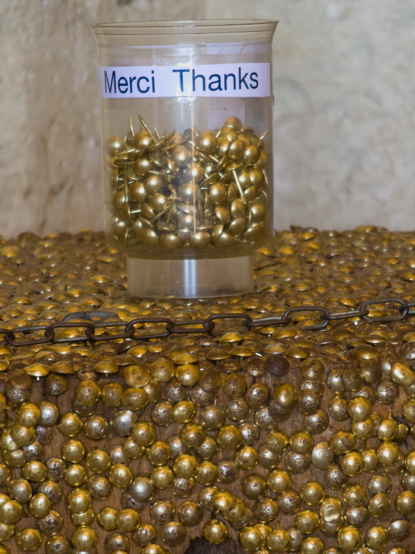 Entrée et accès gratuit au cloître. Petit clou à planter sur un tronc d'arbre en guise de souvenir de son passage, original.
