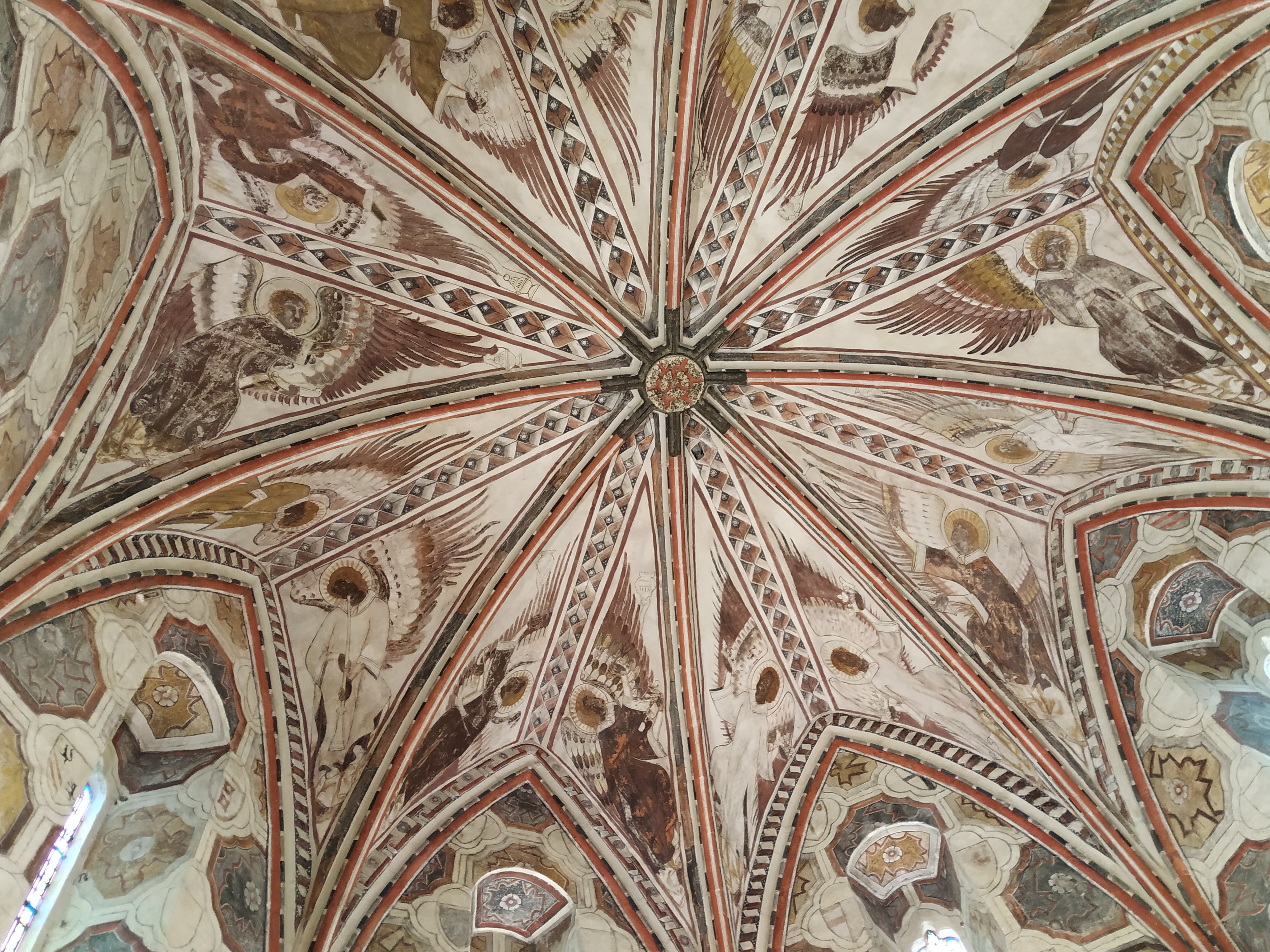 J aime bien visiter les églises et châteaux et autres monuments. Belles rosaces et peintures de la sacristie