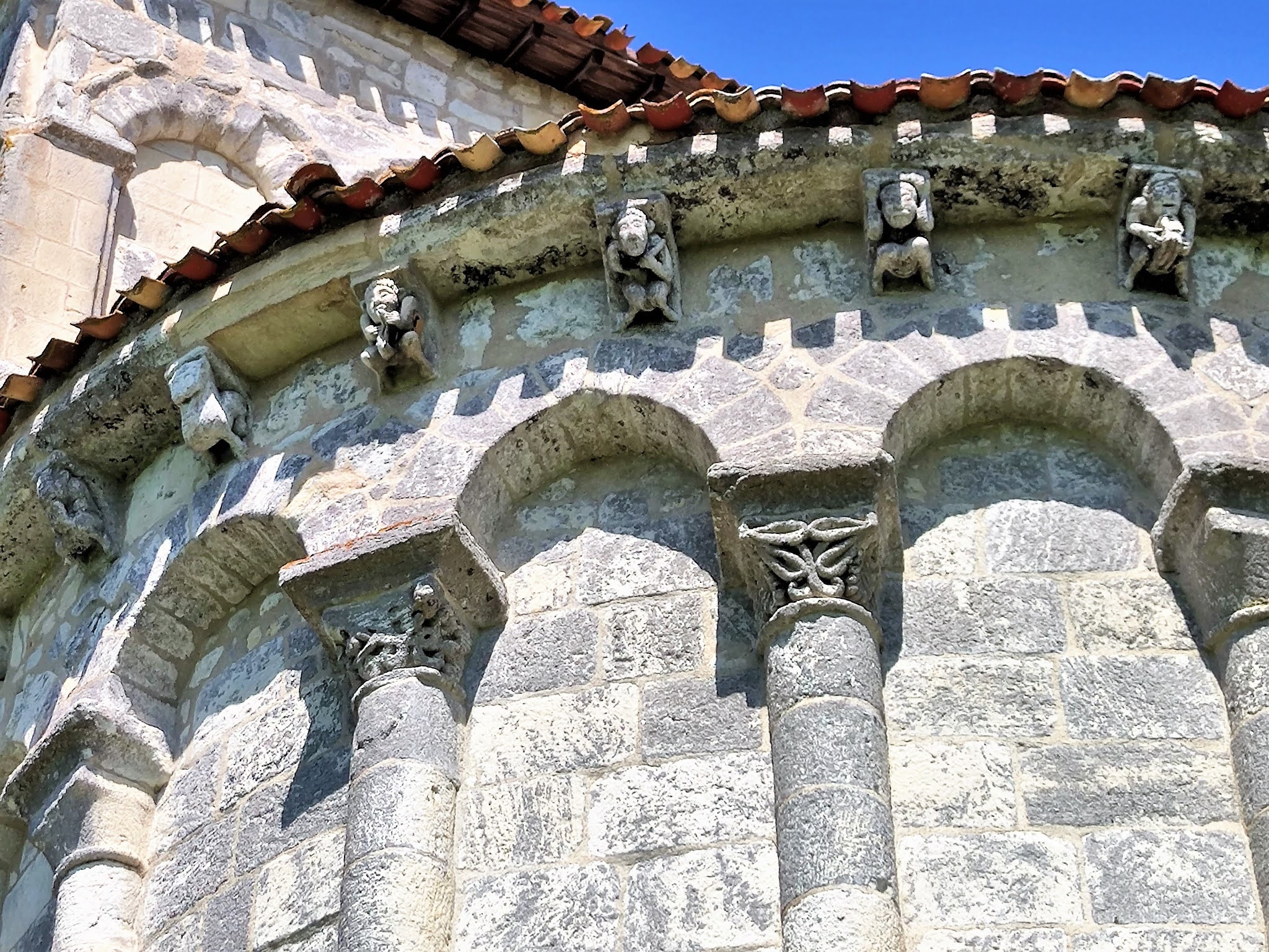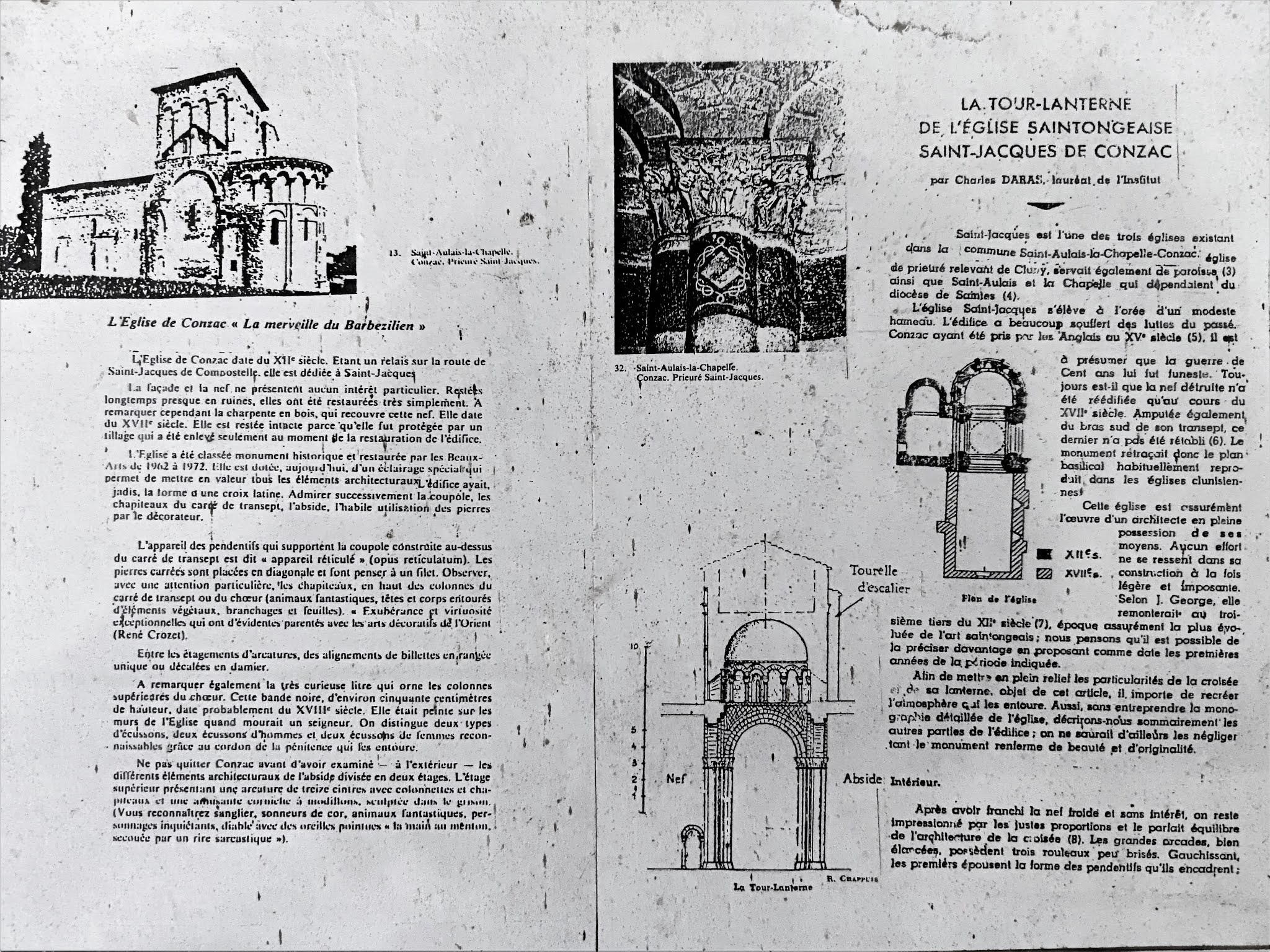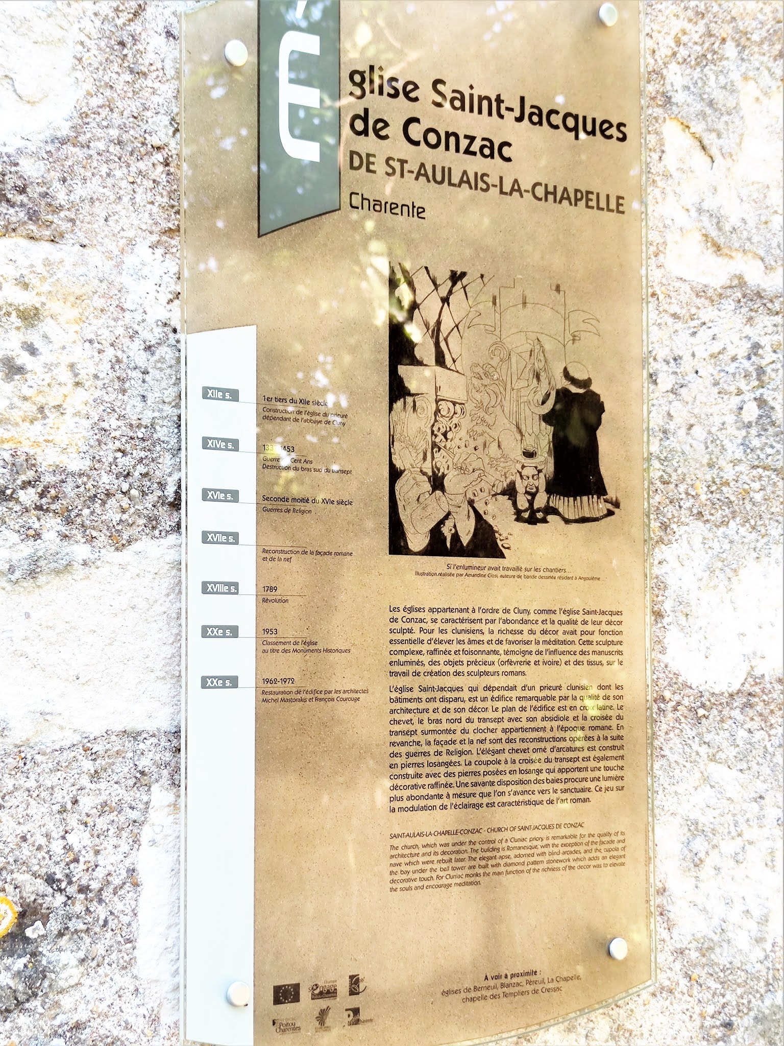 Il est surprenant de découvrir une si belle église dans un endroit si peu peuplé. Construite au 12ème siècle, cette ancienne prieurale fut amputée du croisillon Sud durant la guerre de cent ans, alors que le village de Conzac, pris par les Anglais, était détruit à jamais. La façade Ouest et la nef, reconstruites au 17ème siècle, sont d'une grande simplicité. Les conflits religieux du 16ème siècle les avaient détruites. La visite s'avère incontournable lorsque l'on découvre le transept, l'unique croisillon au Nord et le chœur. L'imposante tour lanterne qui occupe la croisée, les chapiteaux richement sculptés, les arcatures élégantes, les pendentifs de la coupole et les murs de l'abside construits de pierres disposées en losanges, sont autant d'éléments remarquables. Un grand raffinement, teinté de magnificence, se dégage de ce travail architectural qui confine au sublime. Pour les amateurs de ces superbes et authentiques monuments isolés, l'église Saint-Cybard de Plassac-Rouffiac, située à 15Kms les comblera.