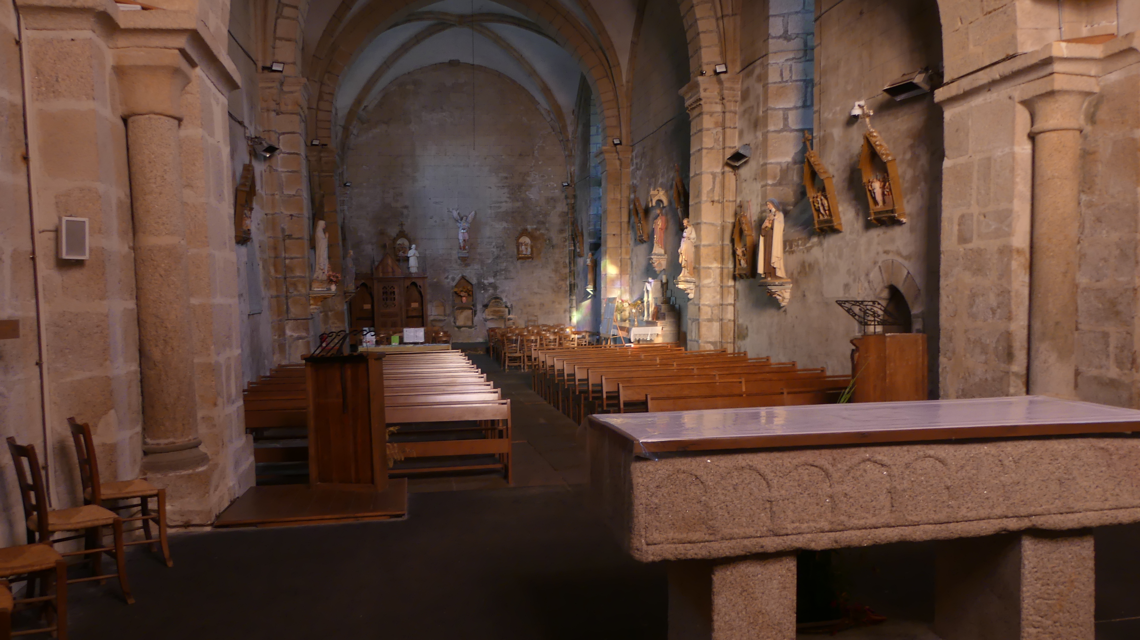 L'église a été construite au XIIe siècle, est classée au titre des monuments historiques depuis 1925. Sa particularité architecturale est que son clocher est placé sur le côté. Elle est dédiée à Saint-Pierre et à Sainte-Marie, d'où vous pouvez admirer de nombreuses statues et fresques qui ornent l'intérieur de l'église. l'oratoires est en granit, et sur sa droite se trouve un tableau de l'Assomption de la Vierge peint par Jacques Blanchard.