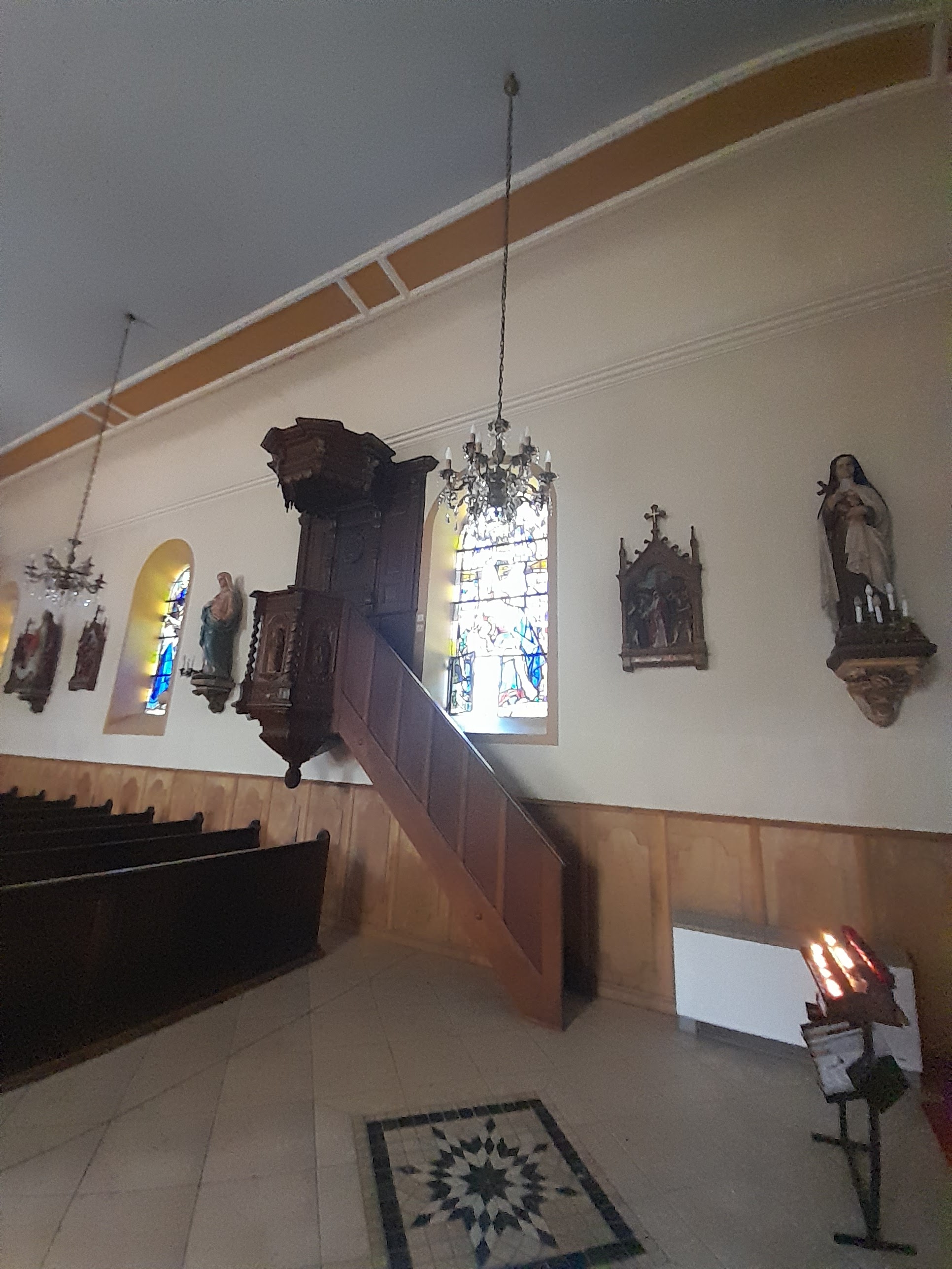 Église sans particularité, avec un tout petit parking qui sert beaucoup aux randonneurs ce qui énerve particulièrement un riverain irascible (le propriétaire de la maison bleue) car le parking touche son terrain !!!