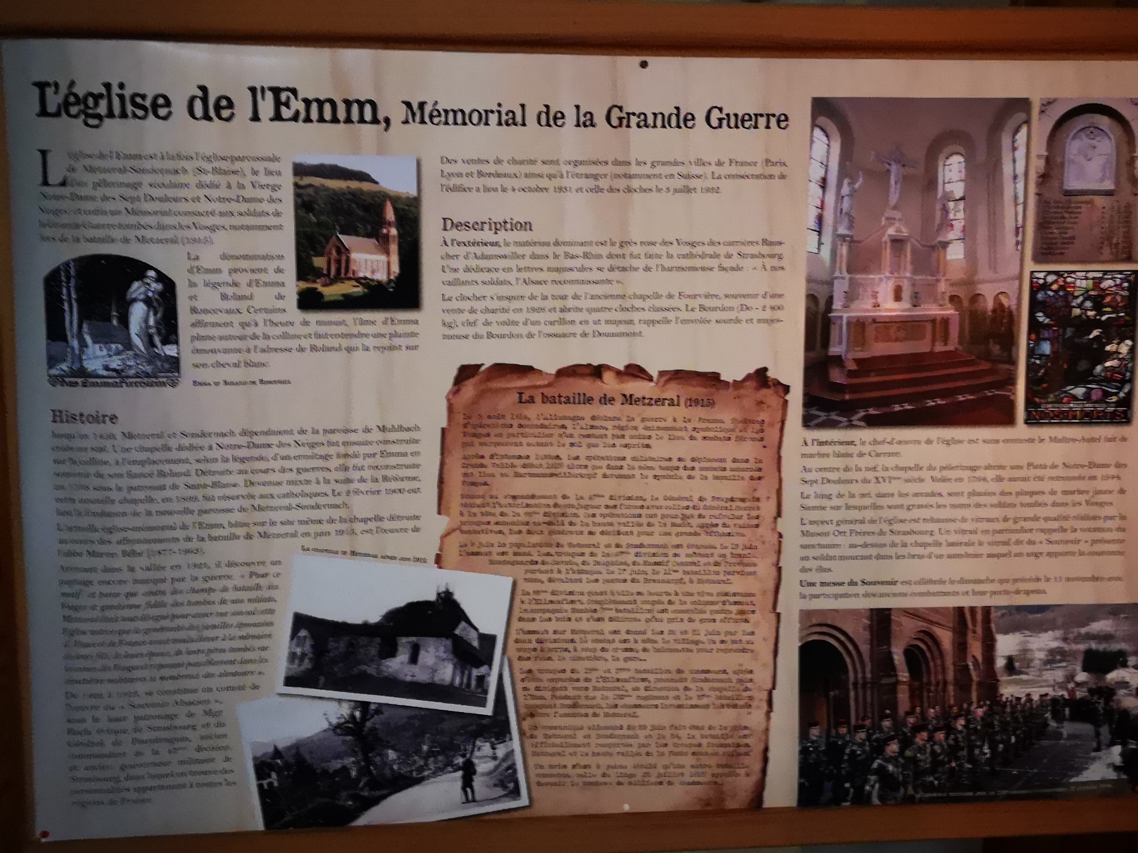 L’église de l’Emm est à la fois l’église paroissiale de Metzeral-Sondernach, le lieu d’un pèlerinage séculaire dédié à la Vierge et enfin un mémorial consacré aux soldats de la Grande Guerre tombés en Alsace et dans les Vosges.