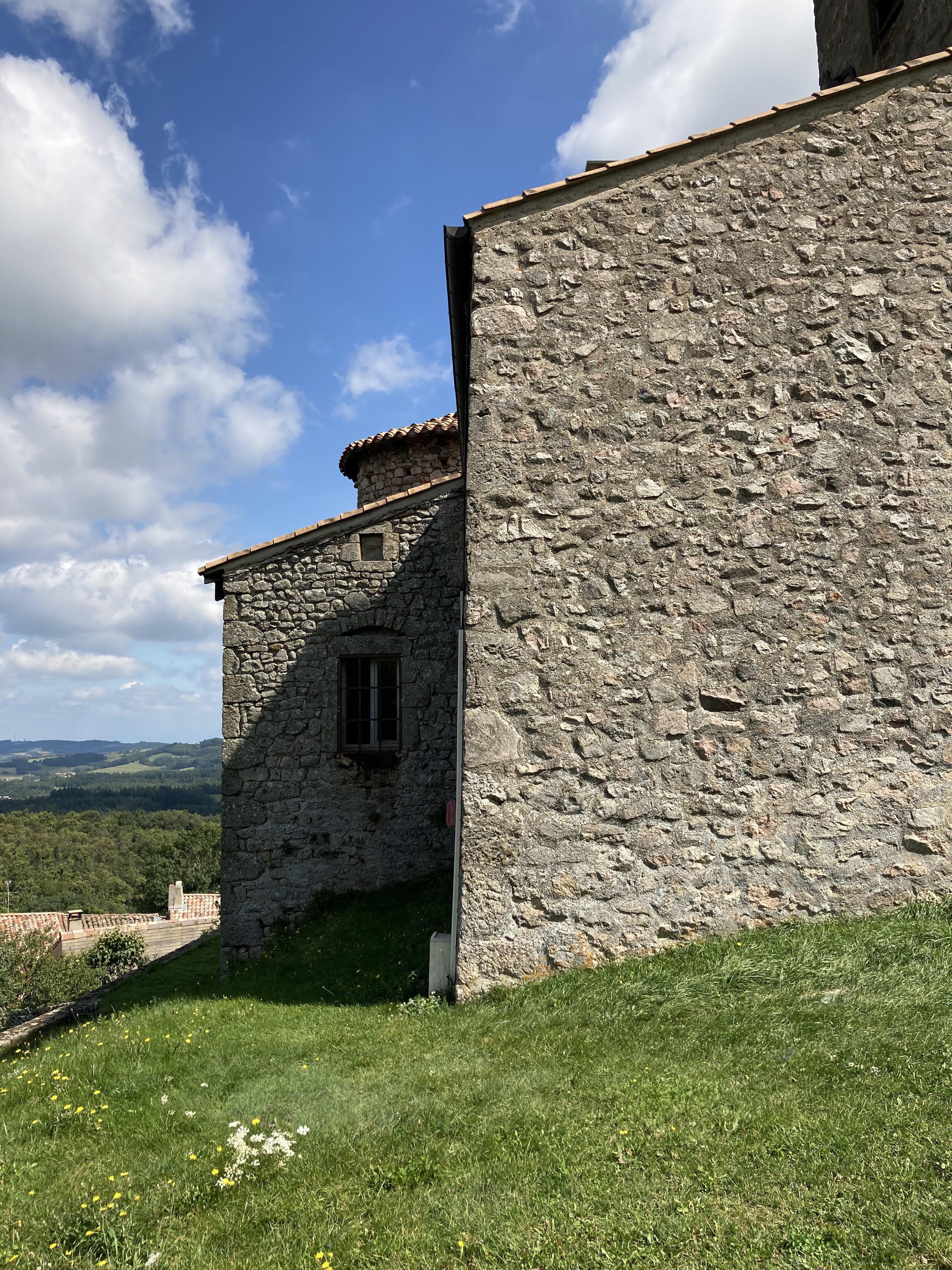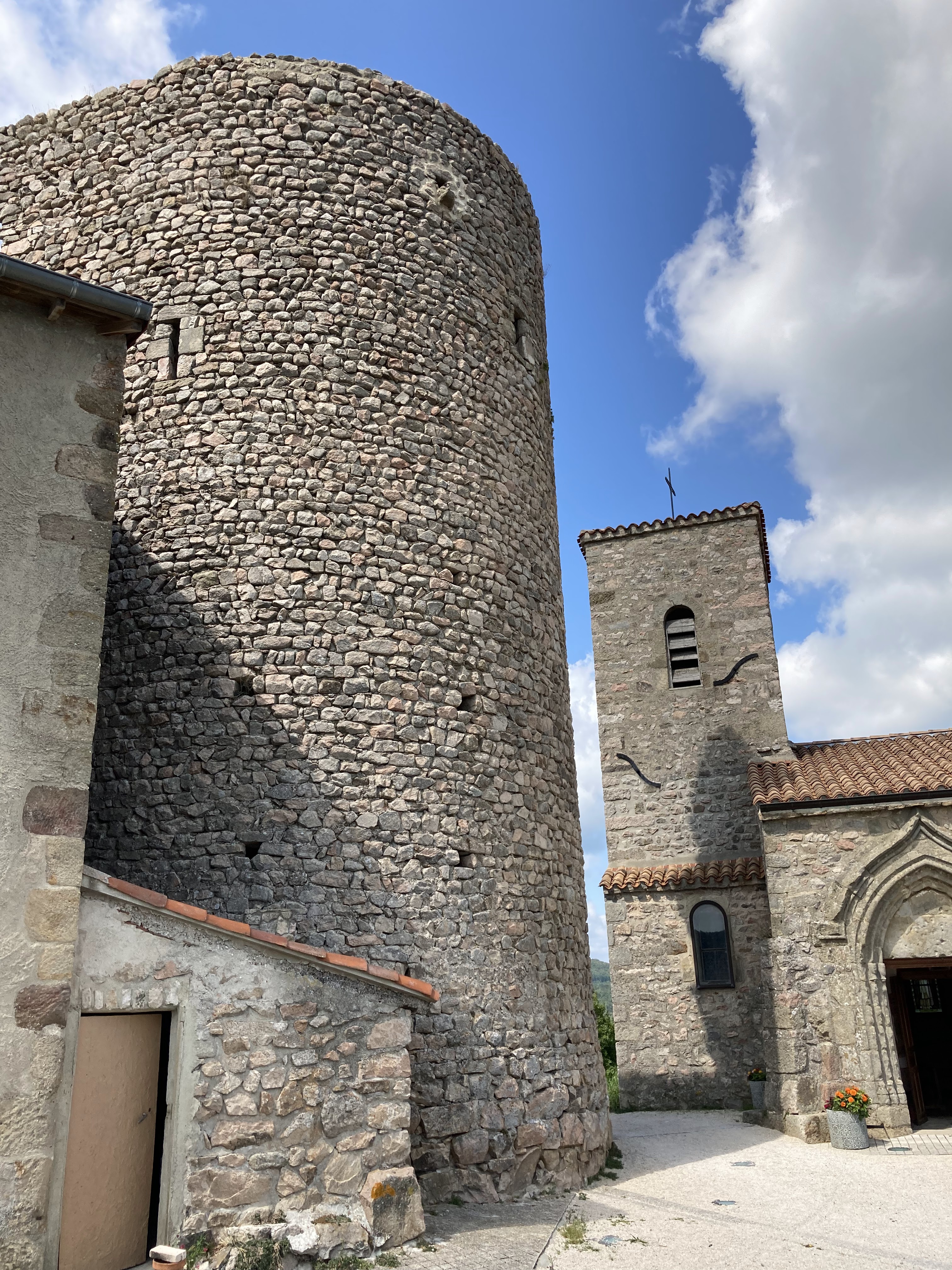 Jolie petite église à côté d'un château en ruine au sommet du village.