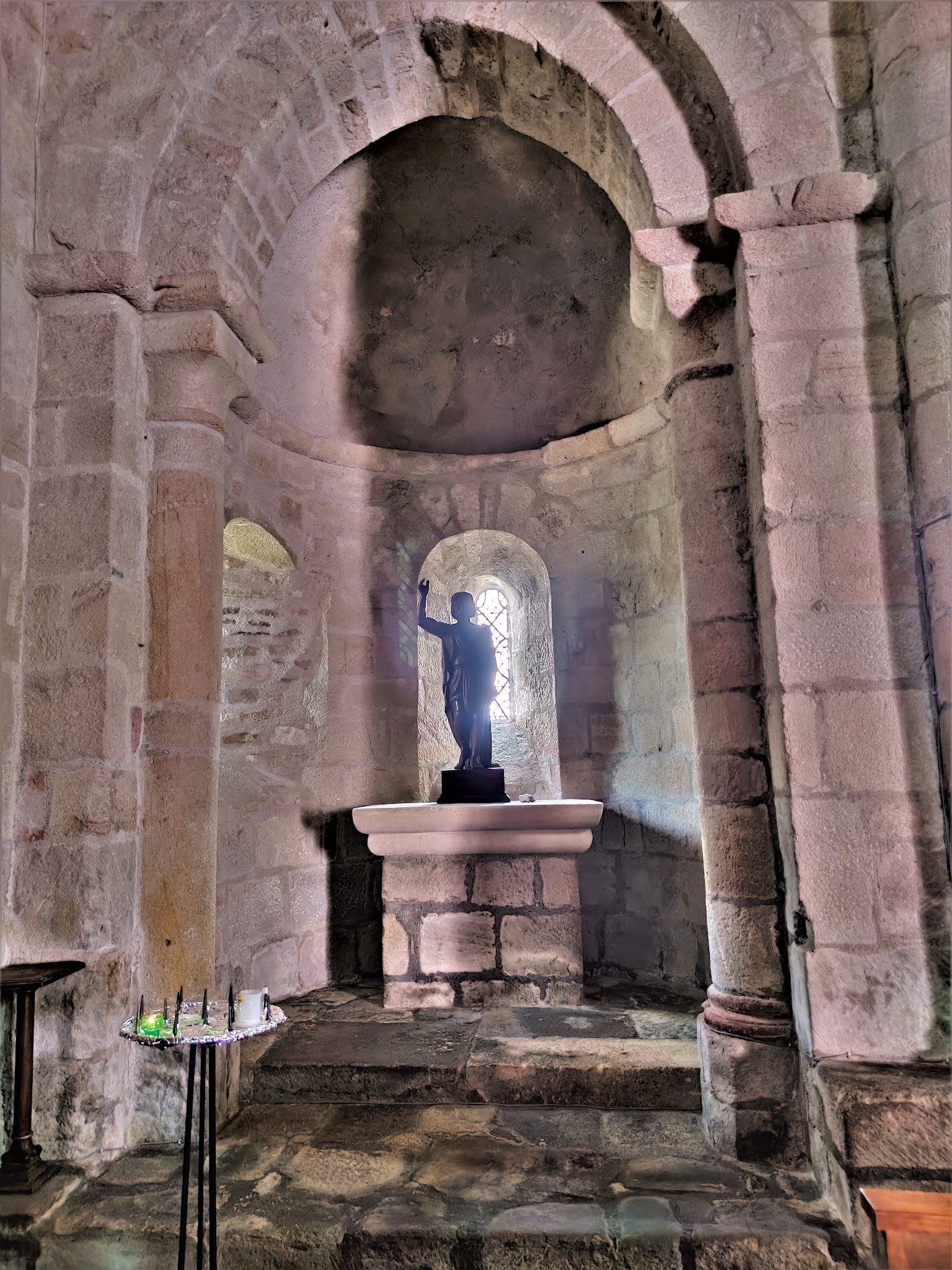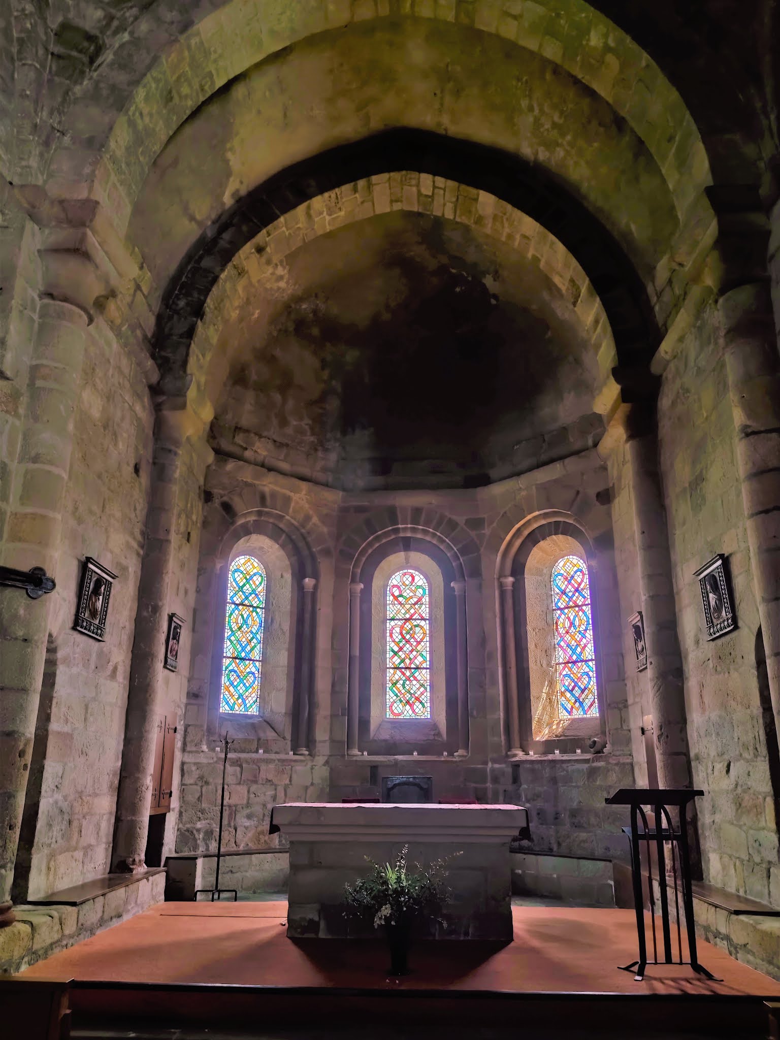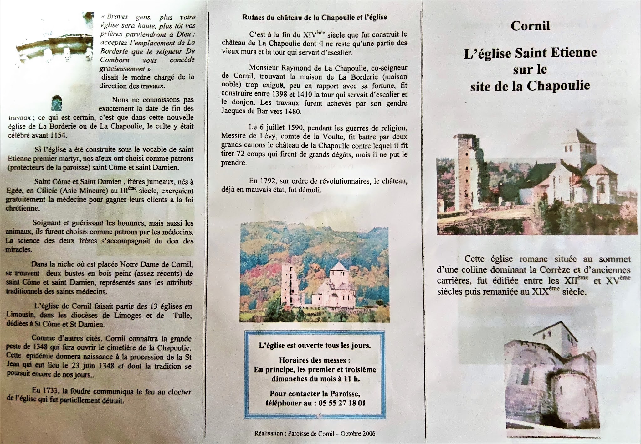La découverte de cette église parfaitement authentique m'a enchanté, de plus, le panorama de l'endroit est superbe. Eglise construite au tout début du 12ème siècle, la nef fut refaite au 15ème siècle, agrandie d'une chapelle au Sud-Est qui abrite la cuve baptismale. Les bras du transept, la croisée, le chœur et le chevet à trois absides, sont ceux de l'édifice primitif. La croisée voûtée en coupole à pendentif porte le clocher-tour carré. La nef est charpentée en berceau de lambris, le baptistère est voûté en croisée d'ogives, les croisillons et la travée du chœur en berceau ; le sanctuaire à 5 pans et les deux absidioles le sont en demi-coupoles. Cette église bientôt millénaire, en très bel état, voisine les ruines d'un des deux châteaux historiques de Cornil, place forte protestante. En 1590, les assauts des troupes de la Ligue Catholique eurent raison de Cornil et de ses châteaux. Ces derniers devinrent carrières de pierres à la révolution. Cette église, témoin de l'histoire de Cornil, a été préservée de la destruction d'un fameux patrimoine. Etape dans la découverte des richesses bâties de la région, la visite de cette église parfaitement authentique m'a enchanté. Le panorama de l'endroit est superbe.