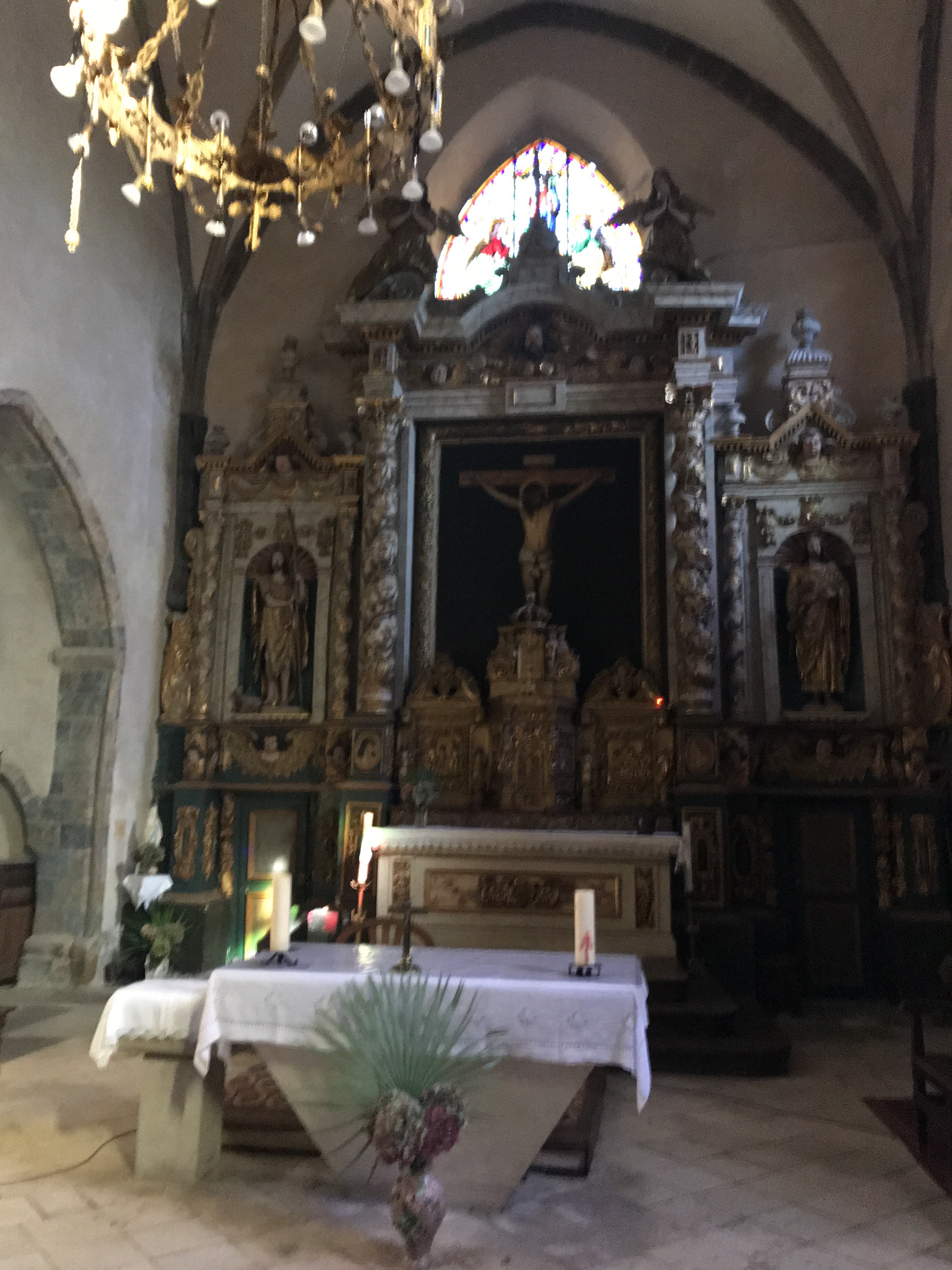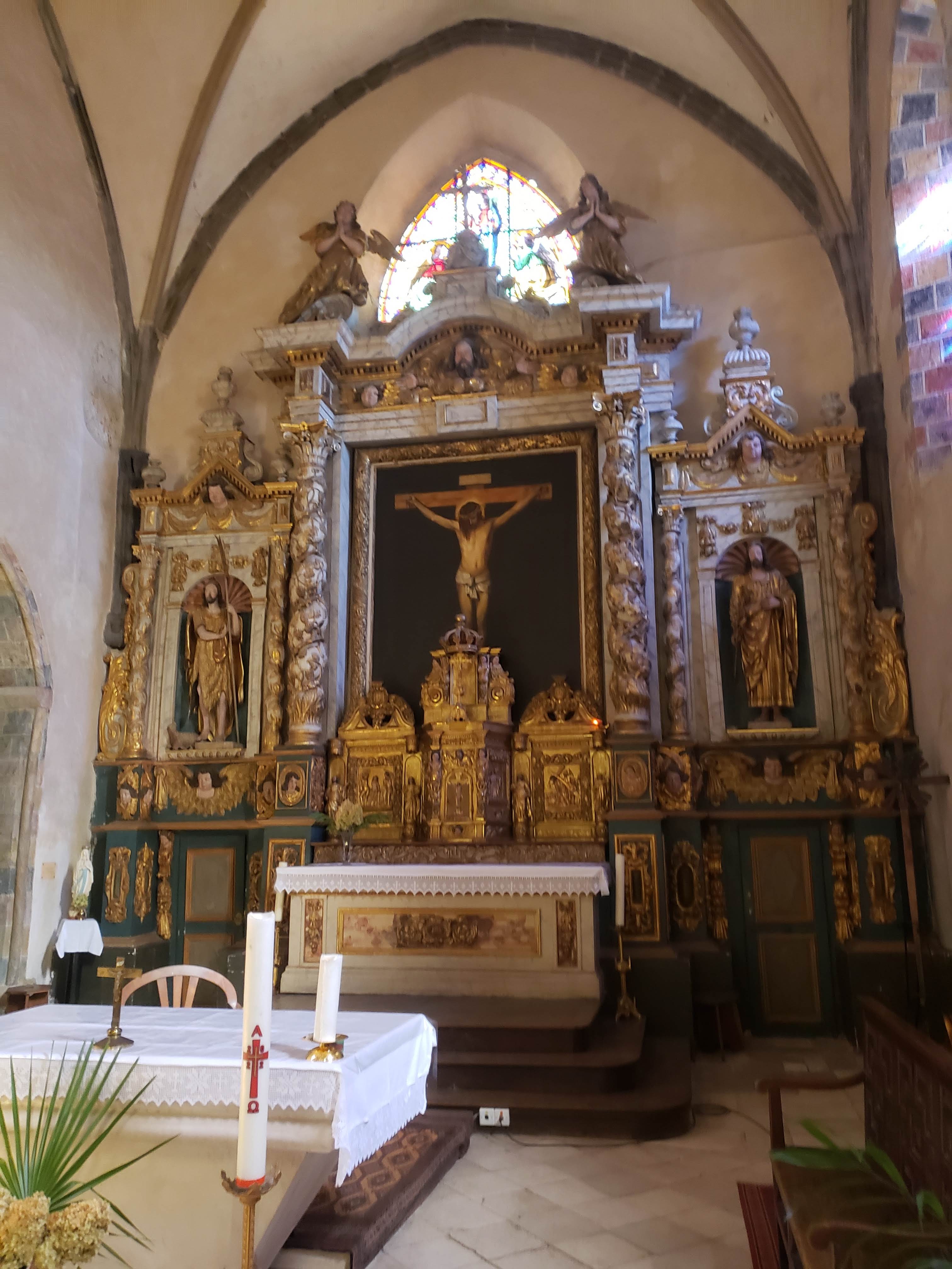 Très belle église avec un clocher fortifié très beau retable à côté la tour Cesar