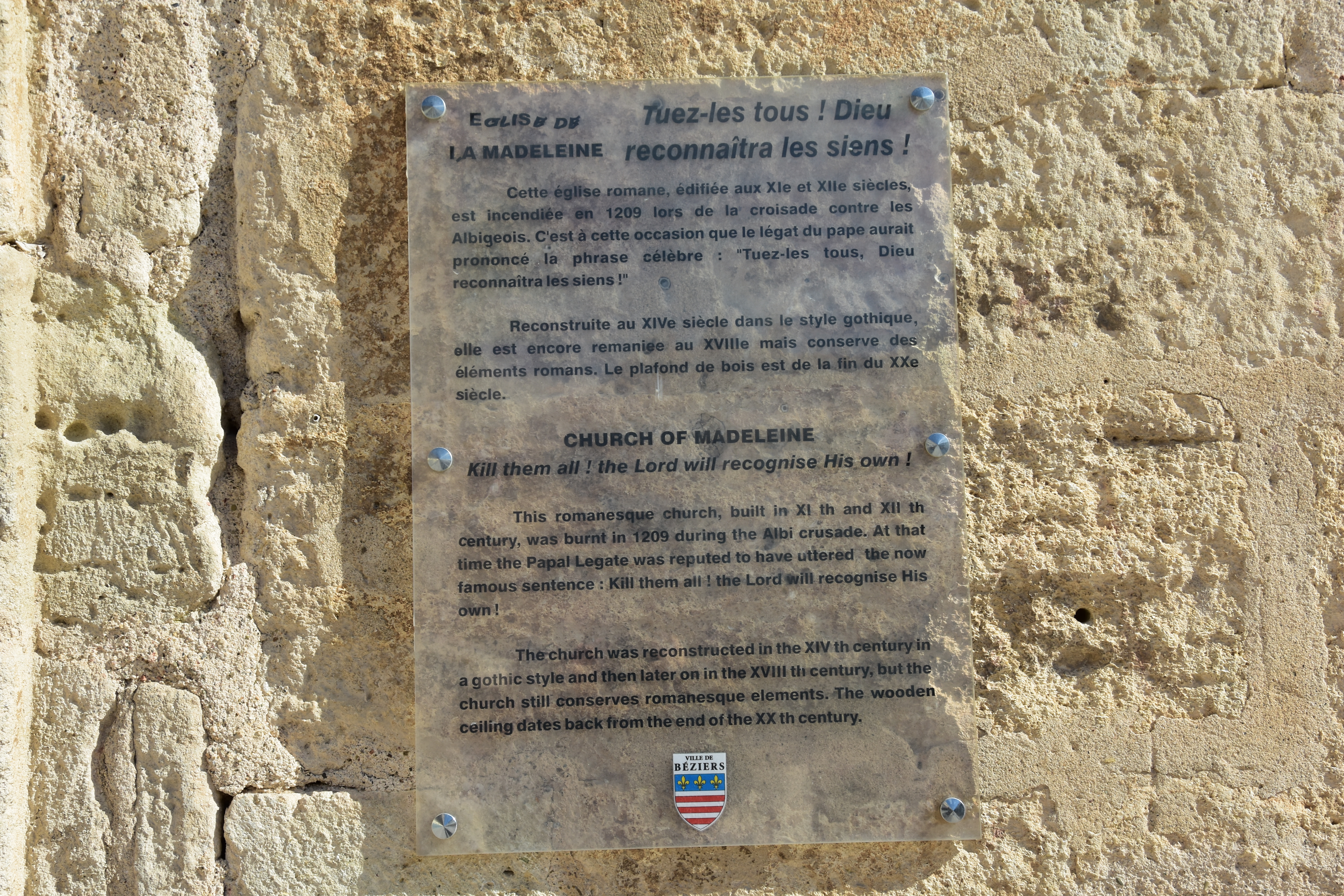 ❝ Église romane où des centaines de Biterrois furent assassinés par les Croisés de Simon de Montfort en 1209 ❞
