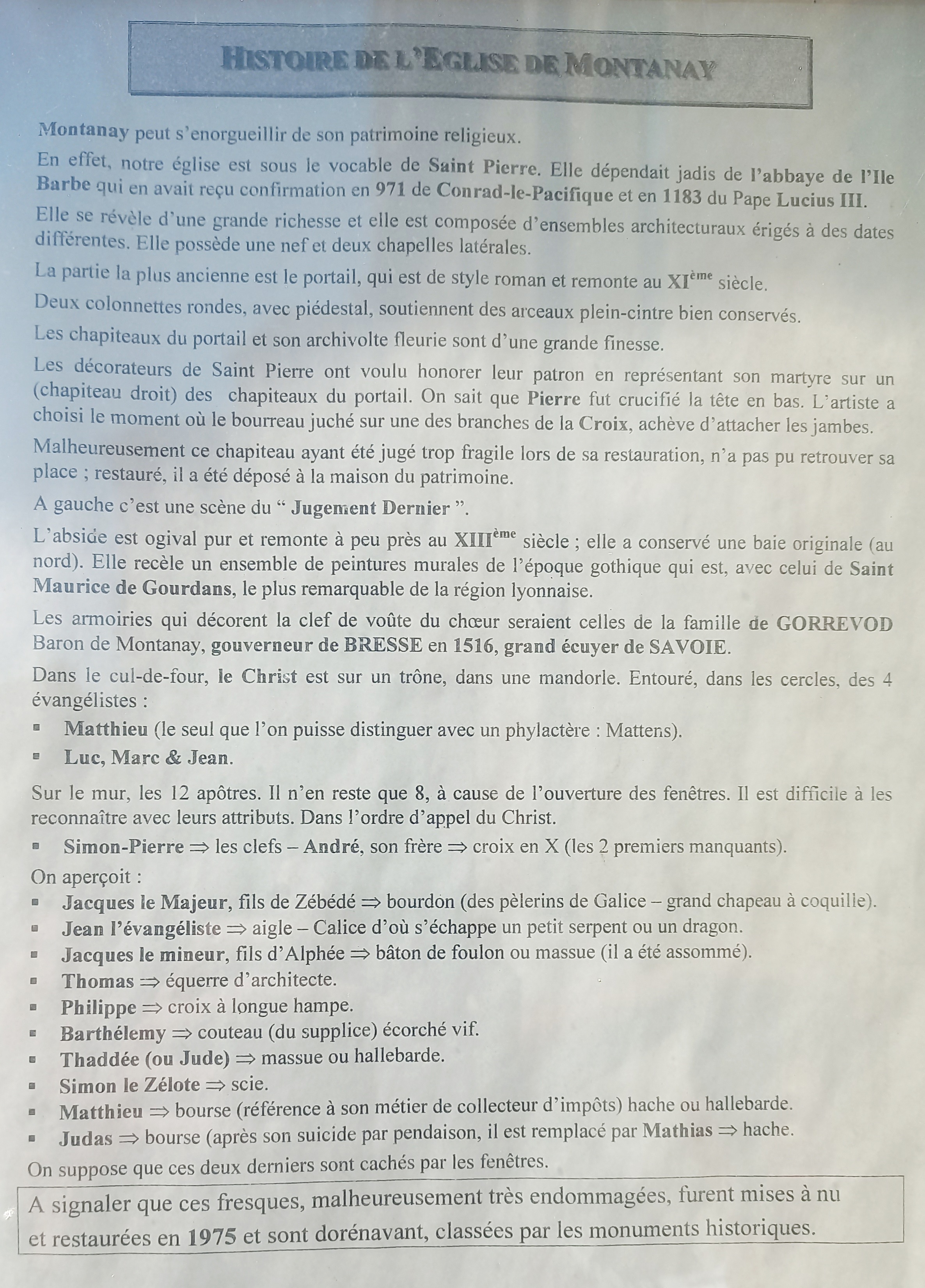 L’église Saint-Pierre De style roman, mais bâtie, transformée, ou reconstruite à différentes époques, son plan très simple est le même que celui de toutes les églises romanes du plateau de la Dombes. La partie la plus ancienne de l’église, est son porche de style byzantin, datant du IXème siècle. A l’intérieur, on remarquera le Chemin de croix, la poutre de gloire en fer forgé à la jonction de la nef et du chœur, un blason ornant la croisée du transept et identifié comme étant celui de la famille de Gorrevod, baron de Montanay, gouverneur de Bresse en 1516. Des peintures murales remontant à l’époque gothique (fin du XVème siècle) ornent l’abside. Elles sont classées par les monuments historiques depuis 1978.