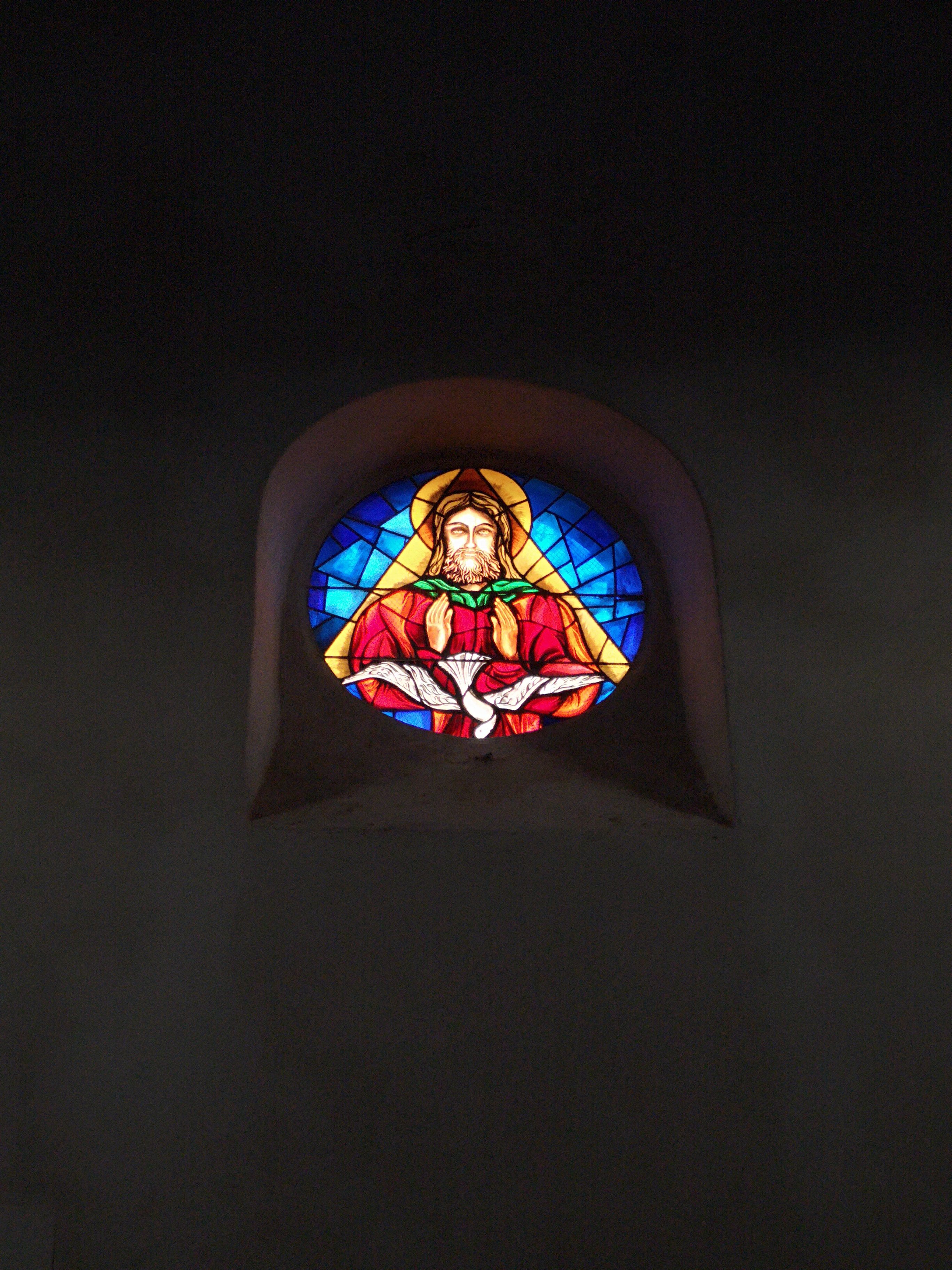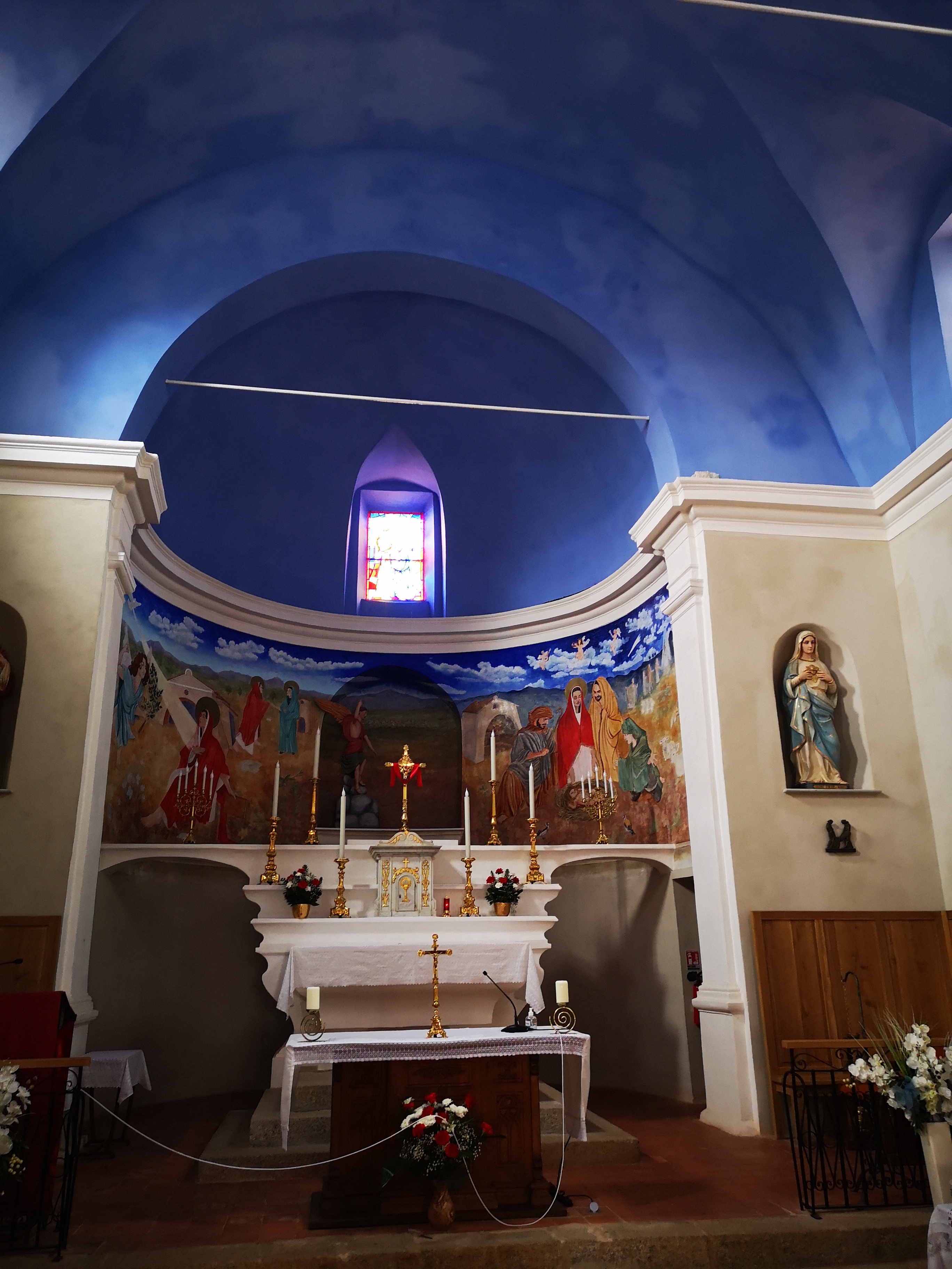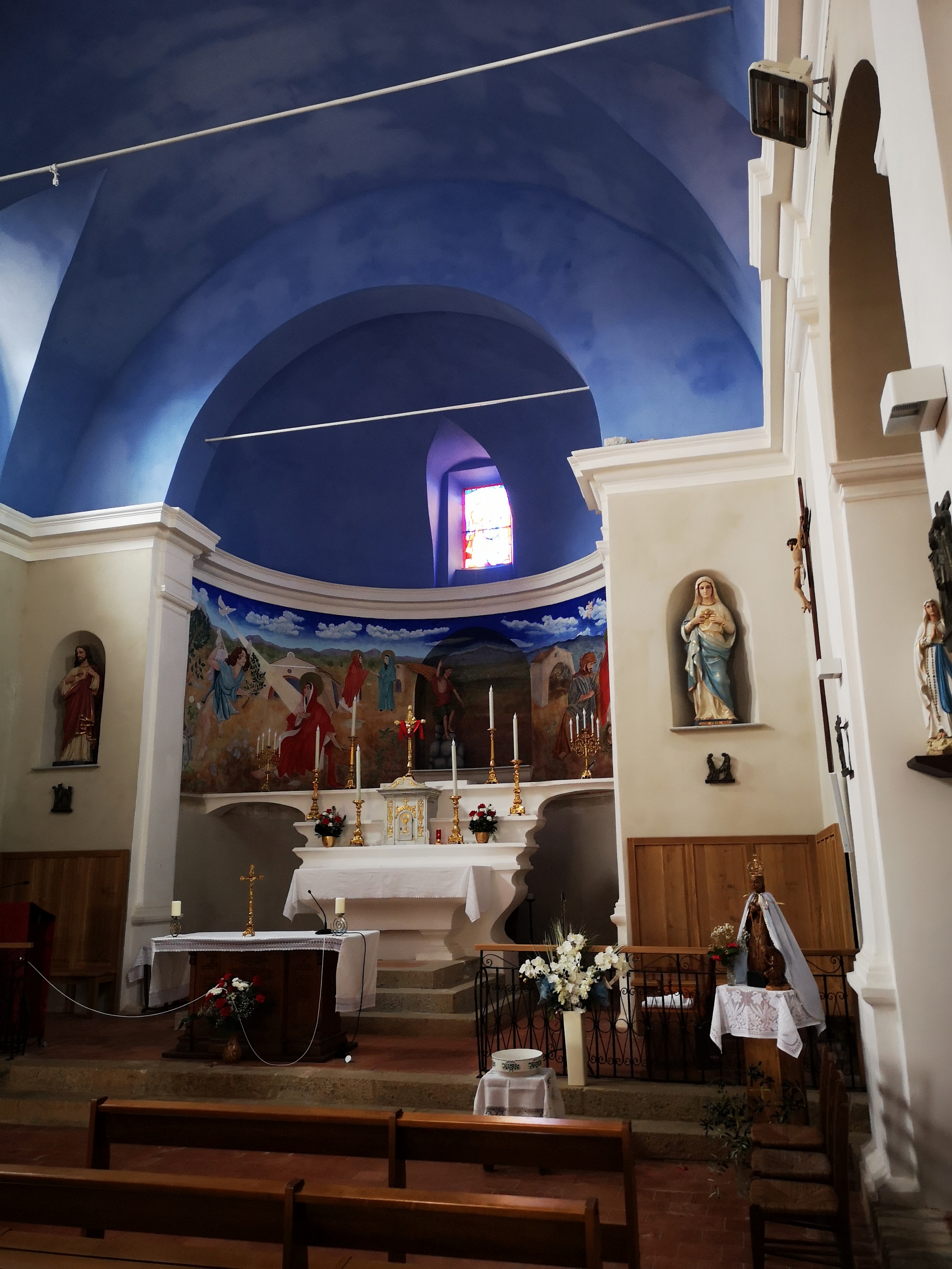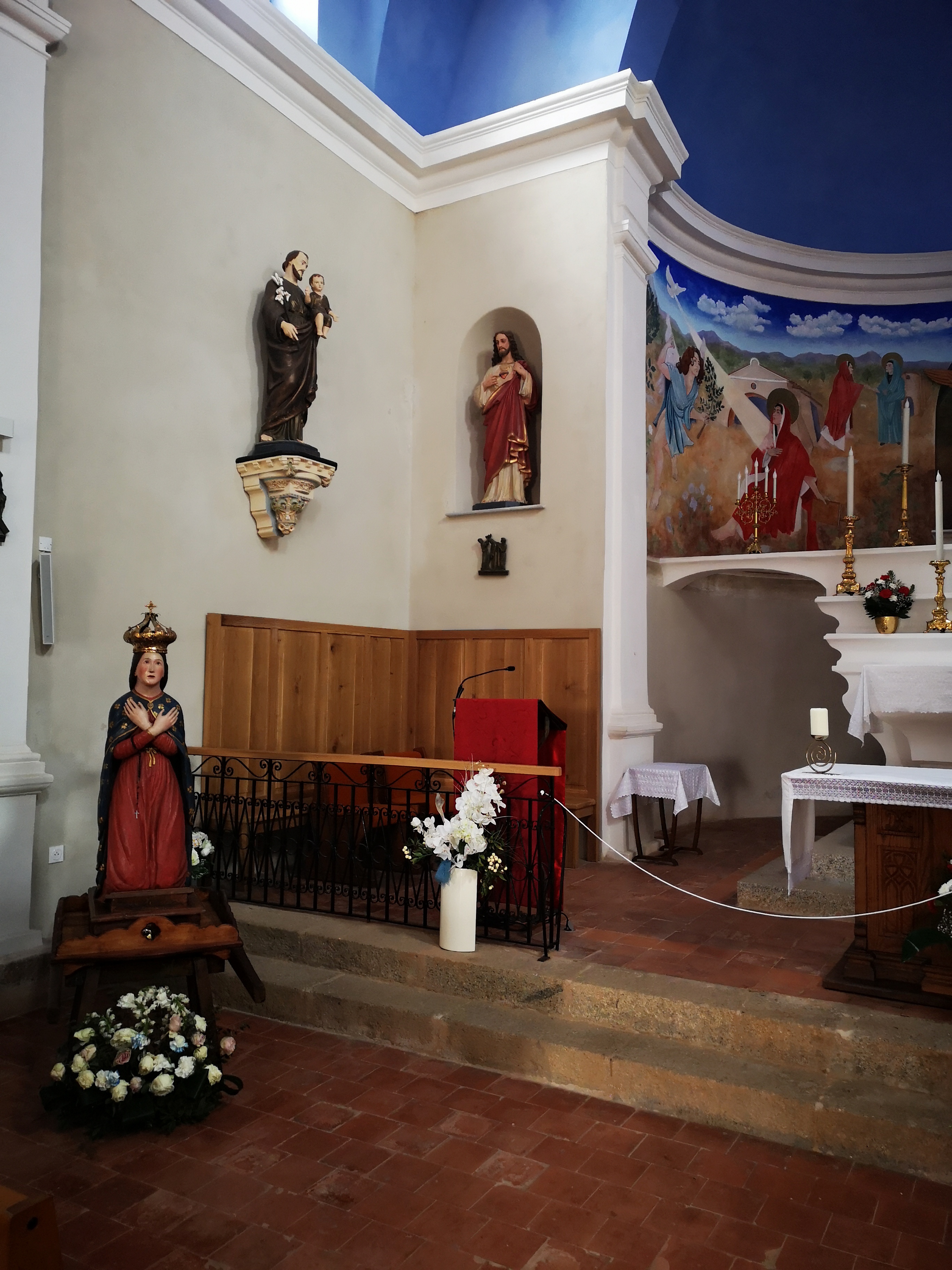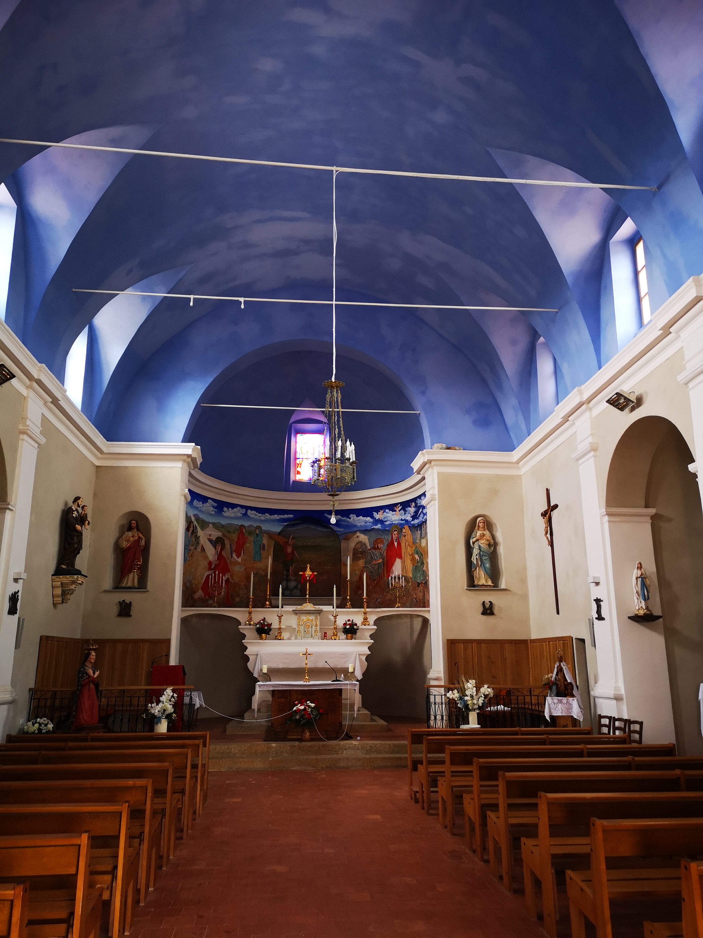 L'église du village en pierre de taille de type romane. Un plafond d'un bleu illuminant les lieux. Nombreuses statues iconiques de part et d'autres. Luminons à deux euros.