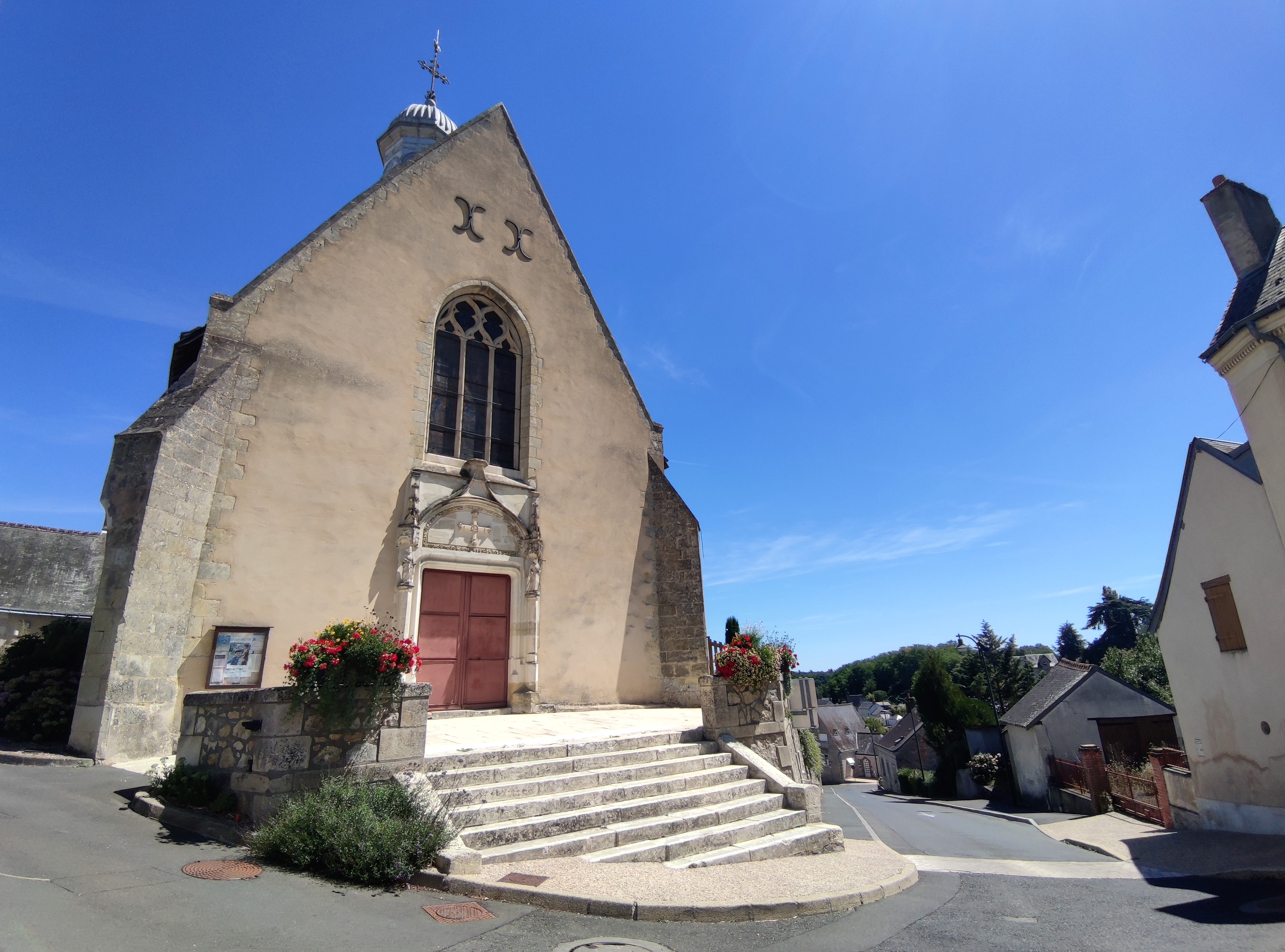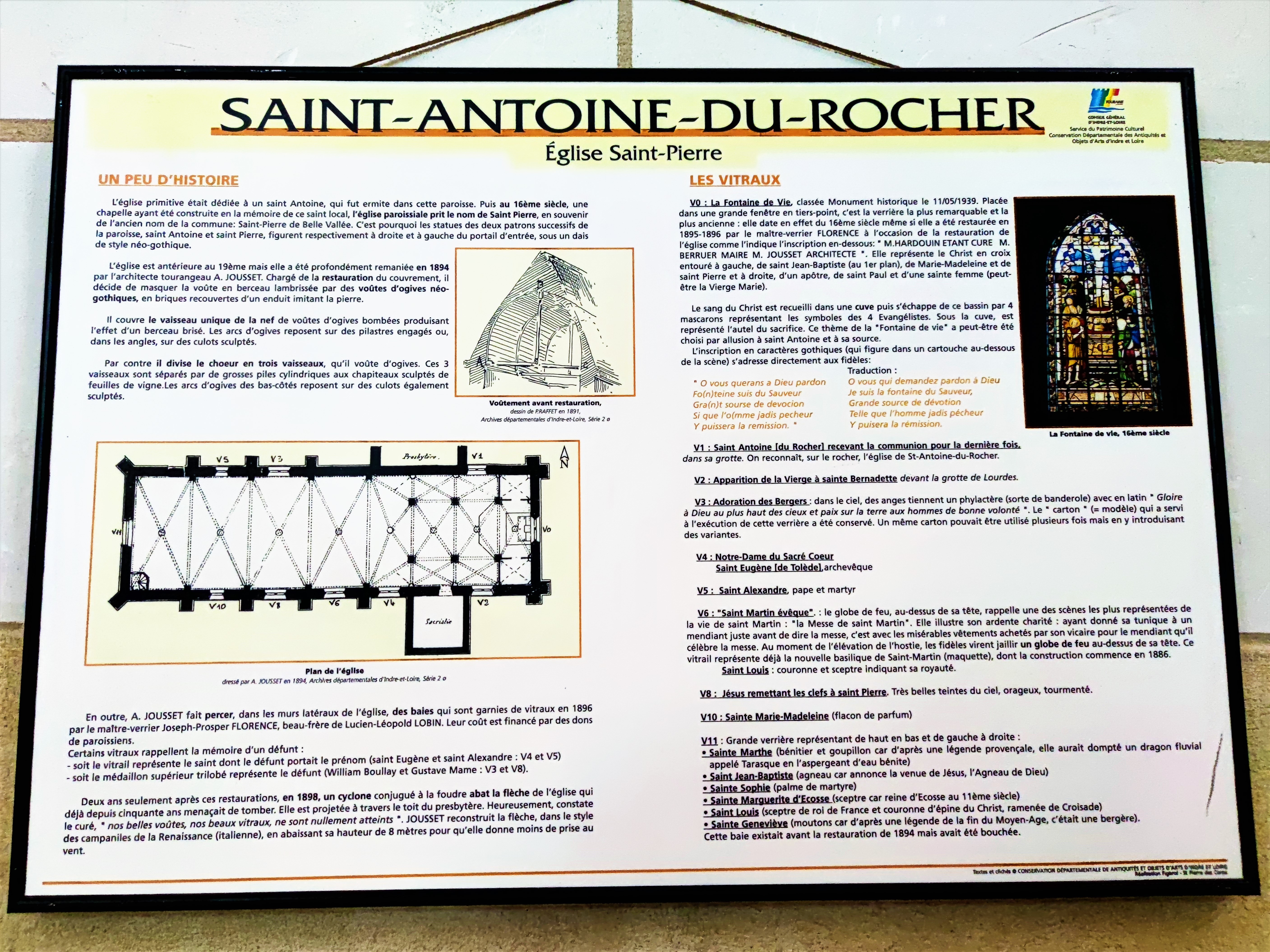 Restaurée et bien entretenue, cette charmante église mérite d'être découverte, elle héberge de belles choses. Saint-Antoine-du-Rocher s'appelait primitivement Saint Pierre de Belle Vallée, paroisse dont l'existence est confirmée depuis le 6ème siècle. L'église du 11ème fut certainement construite sur un lieu de culte plus ancien datant de l'époque mérovingienne, le titulaire était Saint-Antoine, un ermite ayant vécu là. Restaurée, voir reconstruite au 15ème et 16ème, Saint-Antoine avait alors sa chapelle, le titulaire de l'église devint Saint-Pierre. Deux statues de ces Saints encadrent le haut du portail. Fortement transformée au 19ème, la voûte en briques de cette époque ne manque pas d'élégance, comme le chœur aménagé alors en 3 vaisseaux. De nombreux vitraux offrent un bel éclairage, ils sont l'œuvre, au 19ème, d'un maître vitrailliste tourangeau JP Florence qui restaura le vitrail du chœur, La Fontaine de Vie daté du 16ème et classé depuis 1939. Restaurée et bien entretenue, cette charmante église mérite d'être découverte, elle héberge de belles choses.