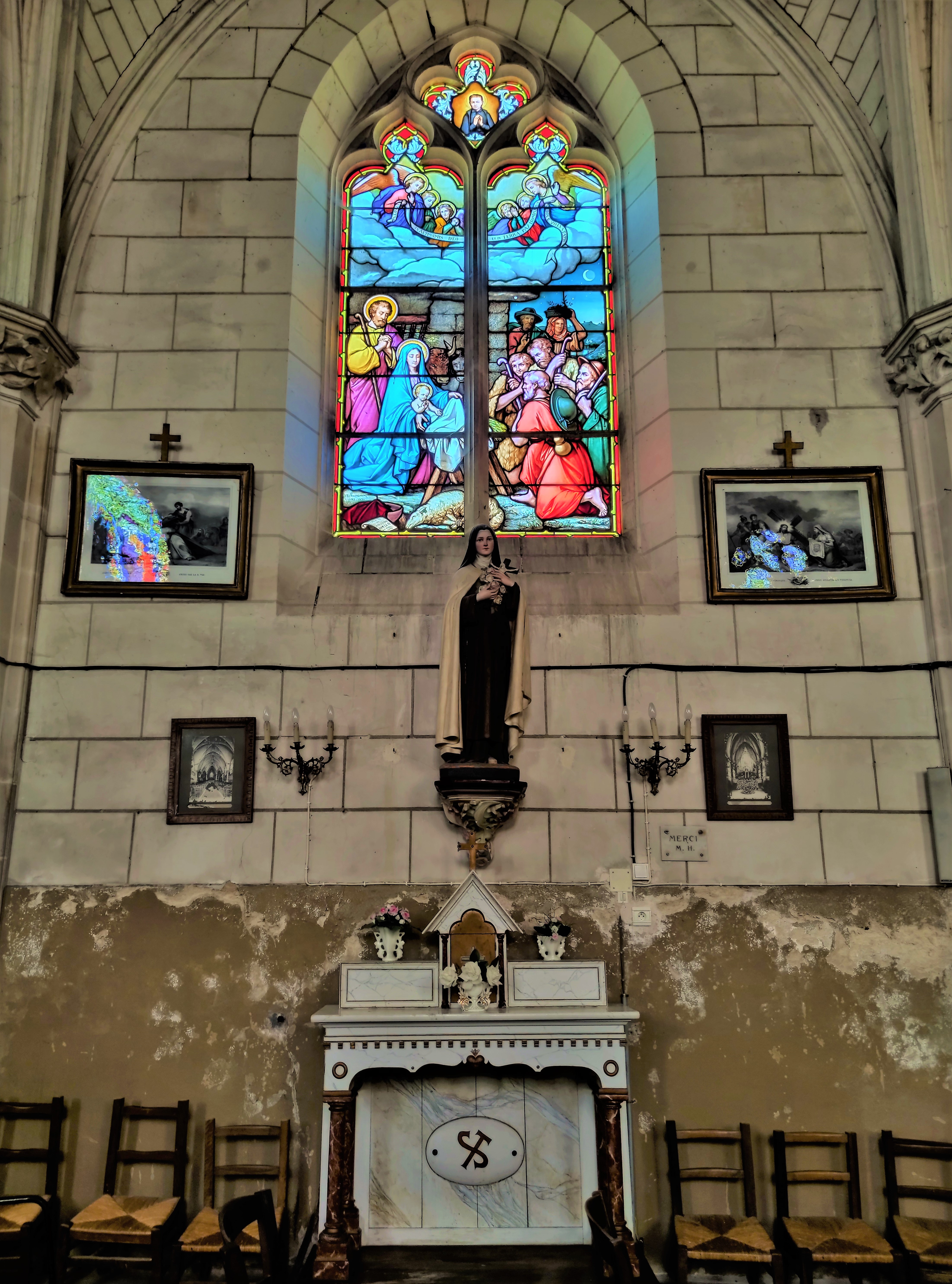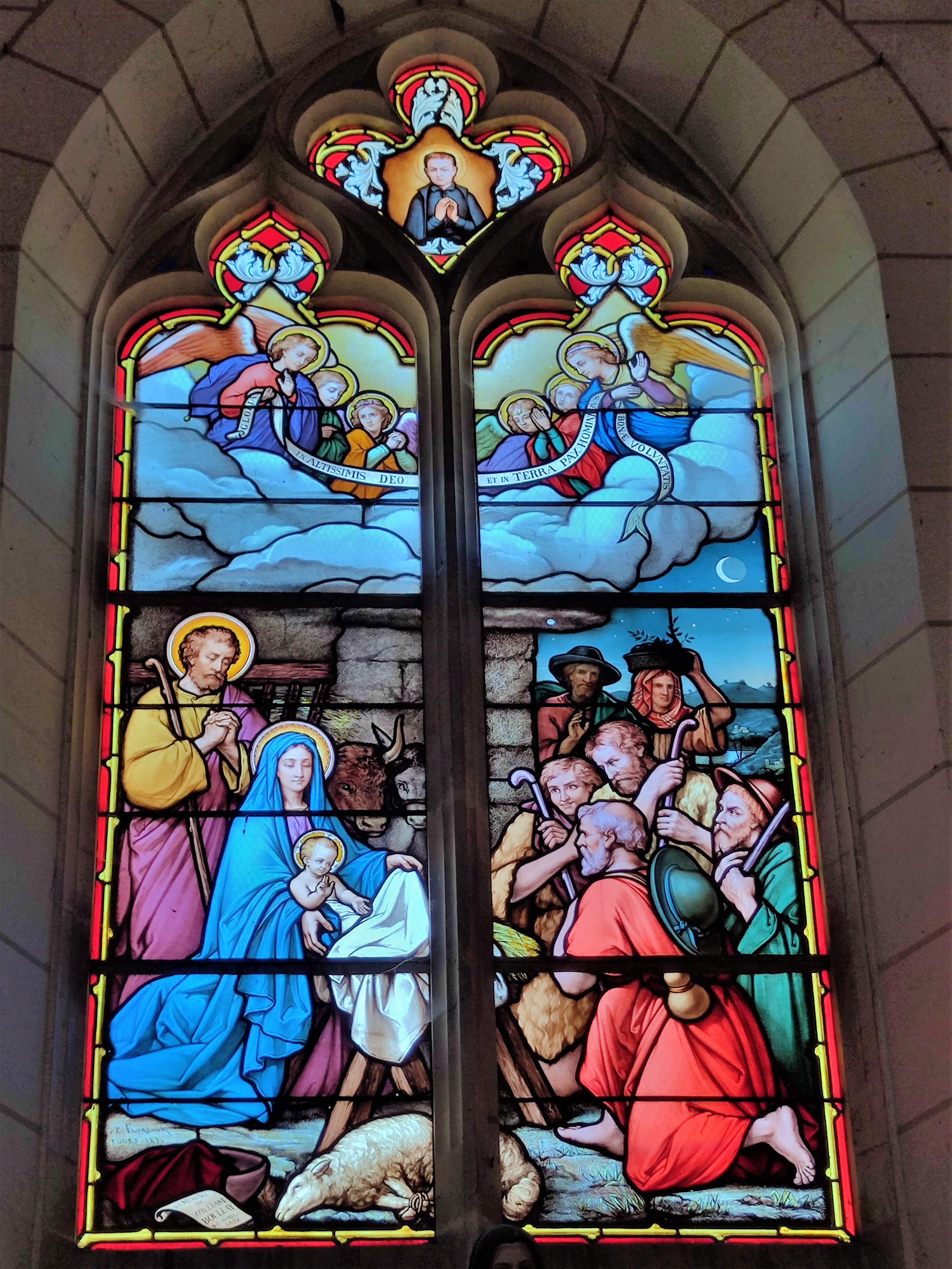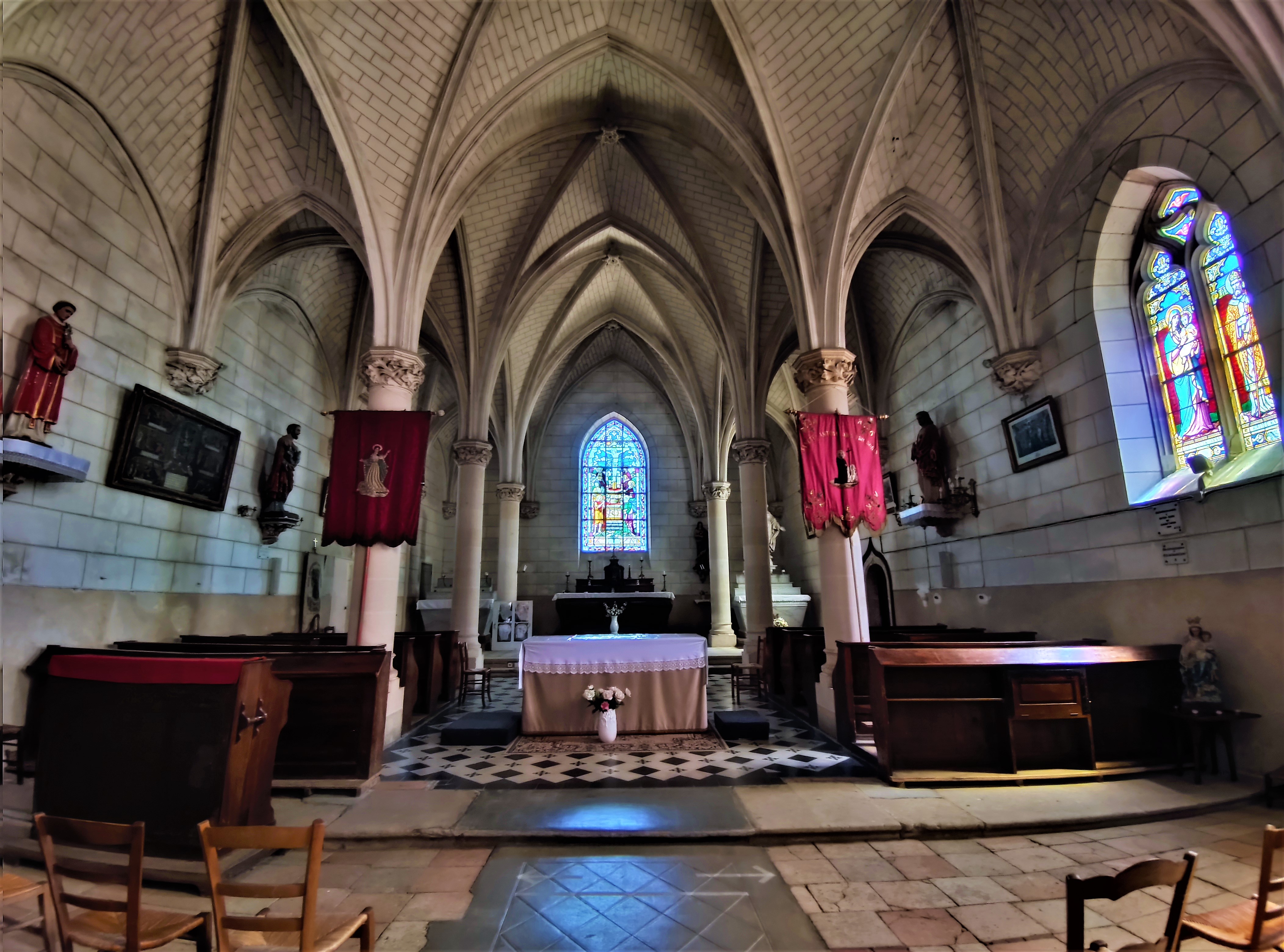 Vitraux et statues remarquables dans cette église rurale dédiée à l'ermite Saint Antoine du Rocher.