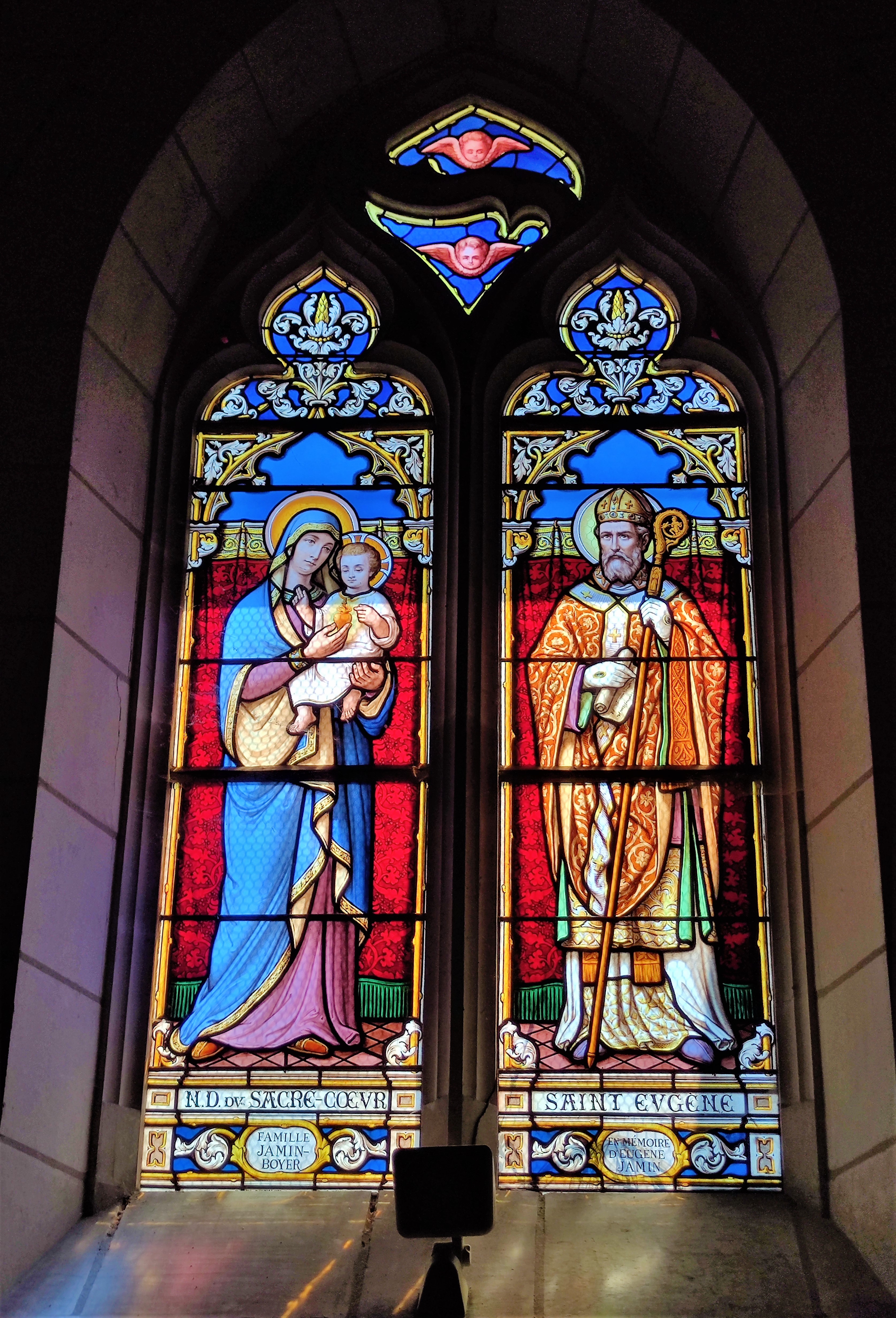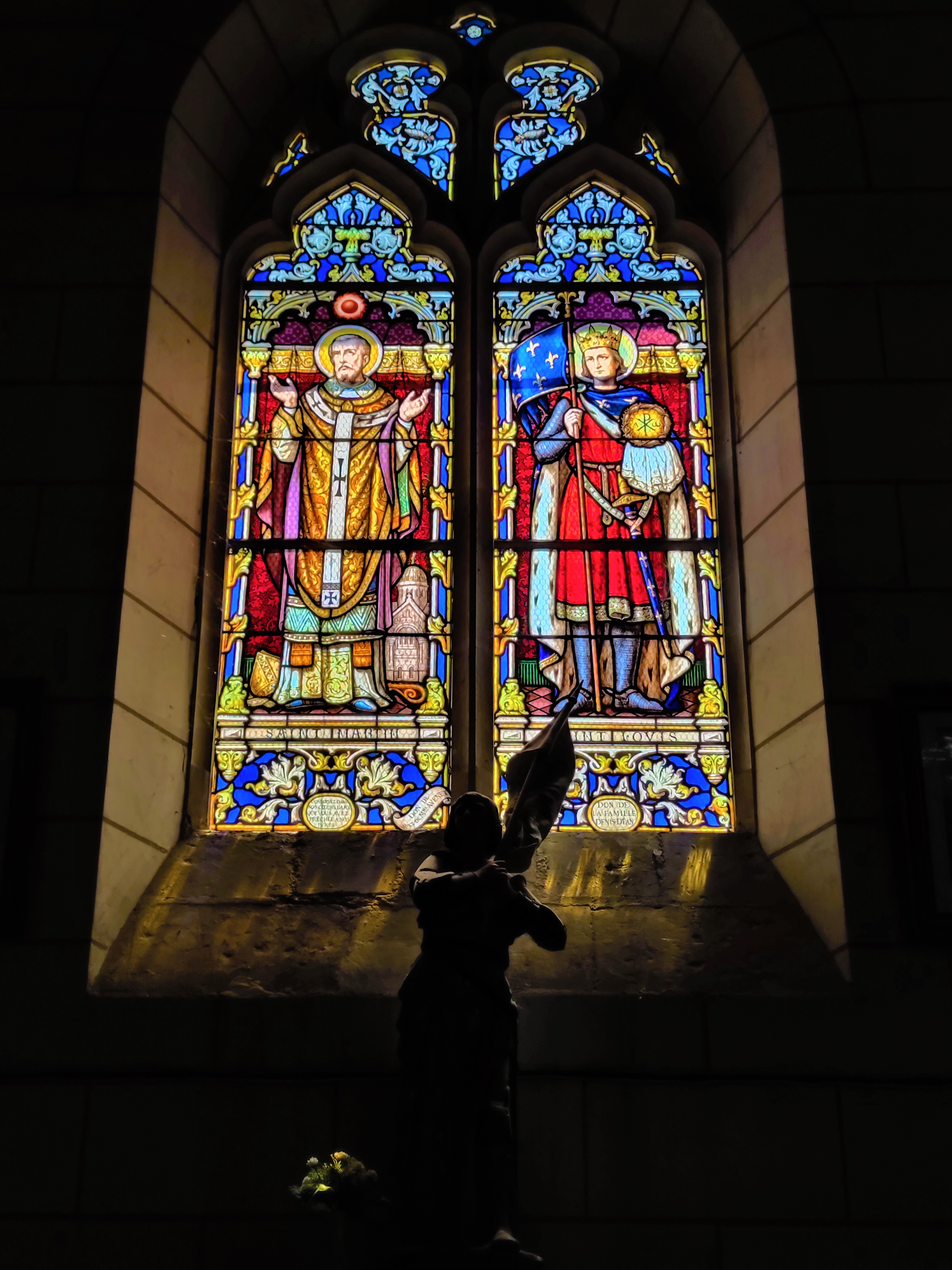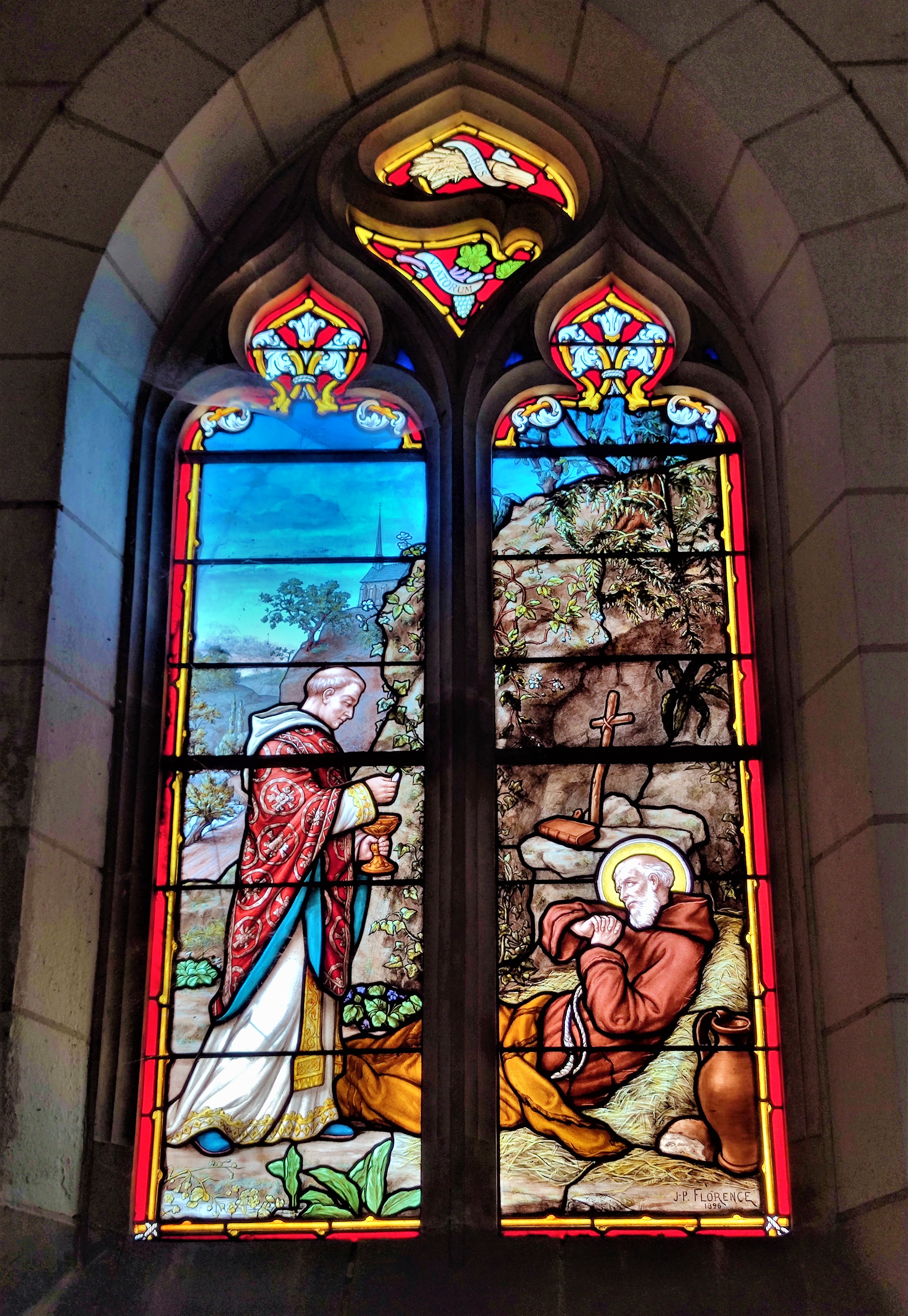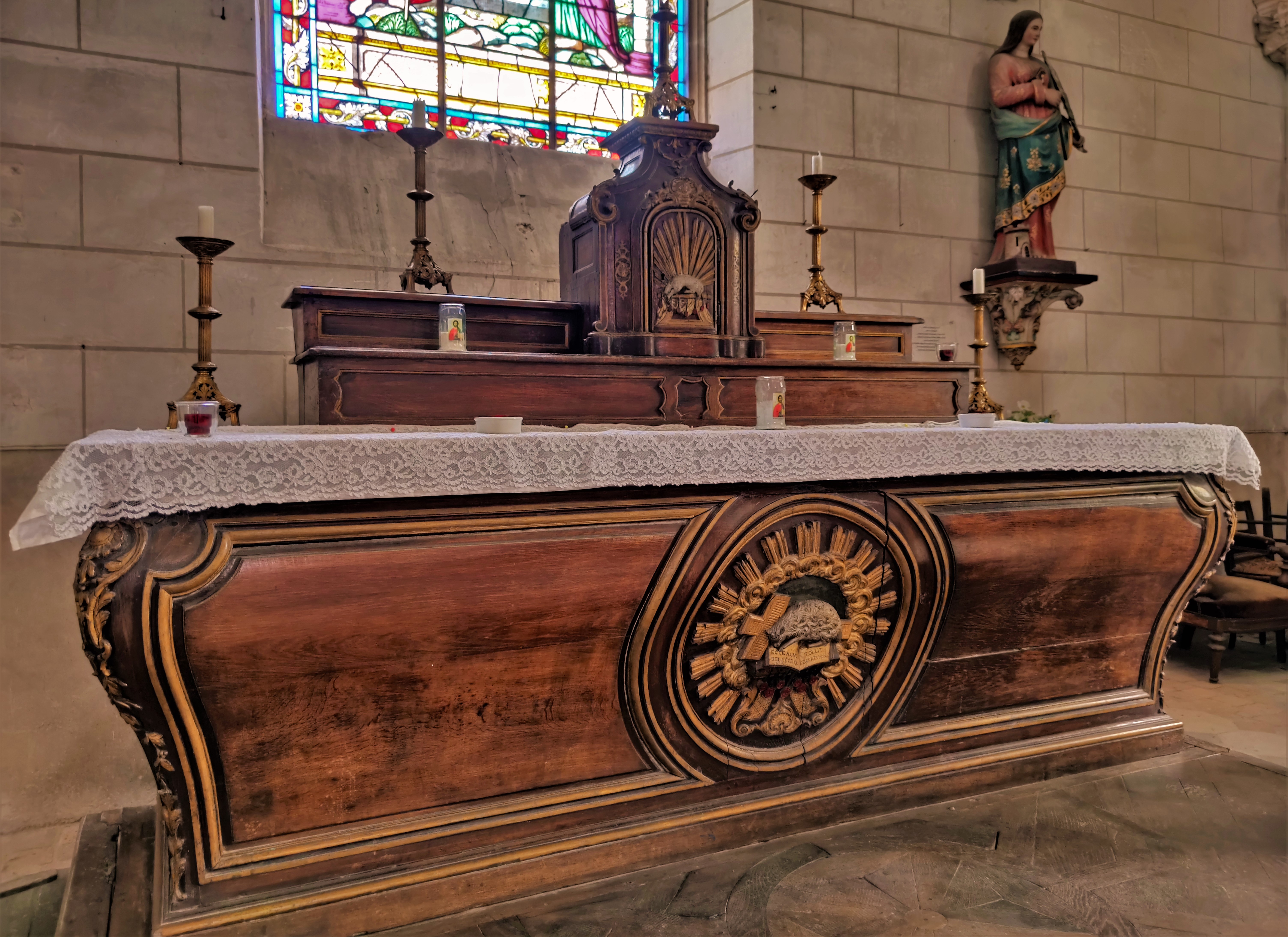 Vitraux et statues remarquables dans cette église rurale dédiée à l'ermite Saint Antoine du Rocher.