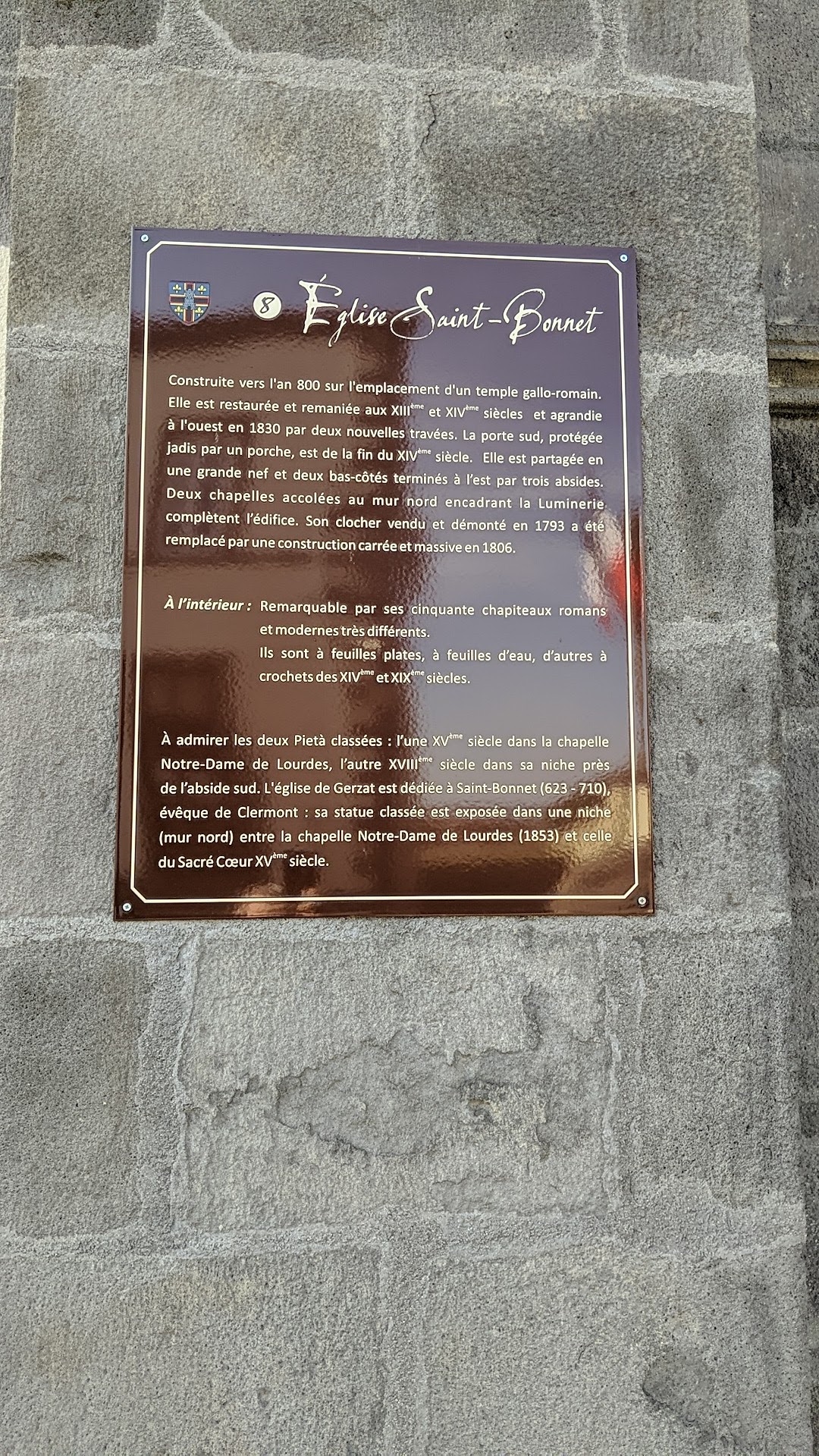 L’église de Gerzat a été construite vers 800 et est dédiée à St Bonnet (623-710) qui fut évêque de Clermont. Des archives indiscutables permettent de situer, dans la seconde moitié du XIIIème siècle, la restauration de la partie Est de l’église (environ 1270-1280). Elle peut compter parmi les églises d’Auvergne les plus intéressantes. L’ensemble de l’architecture du bâtiment s’apparente au début de l’art roman, avec ses trois absides voûtées et l’absence de transept. Elle est surmontée d’un massif clocher carré coiffé d’un toit pyramidal. Elle est partagée en une grande nef et deux bas-côtés terminés à l’Est par les trois absides.