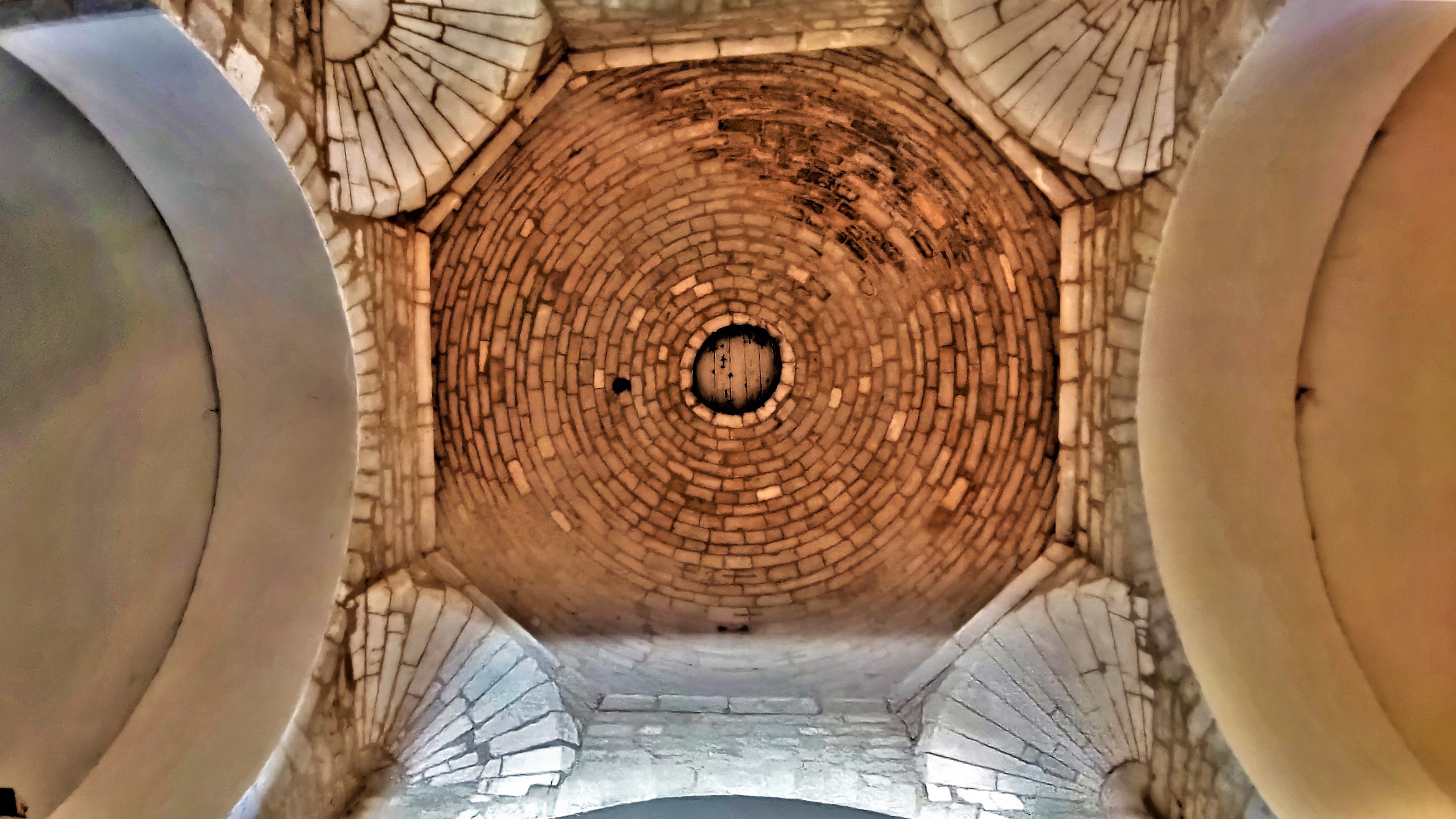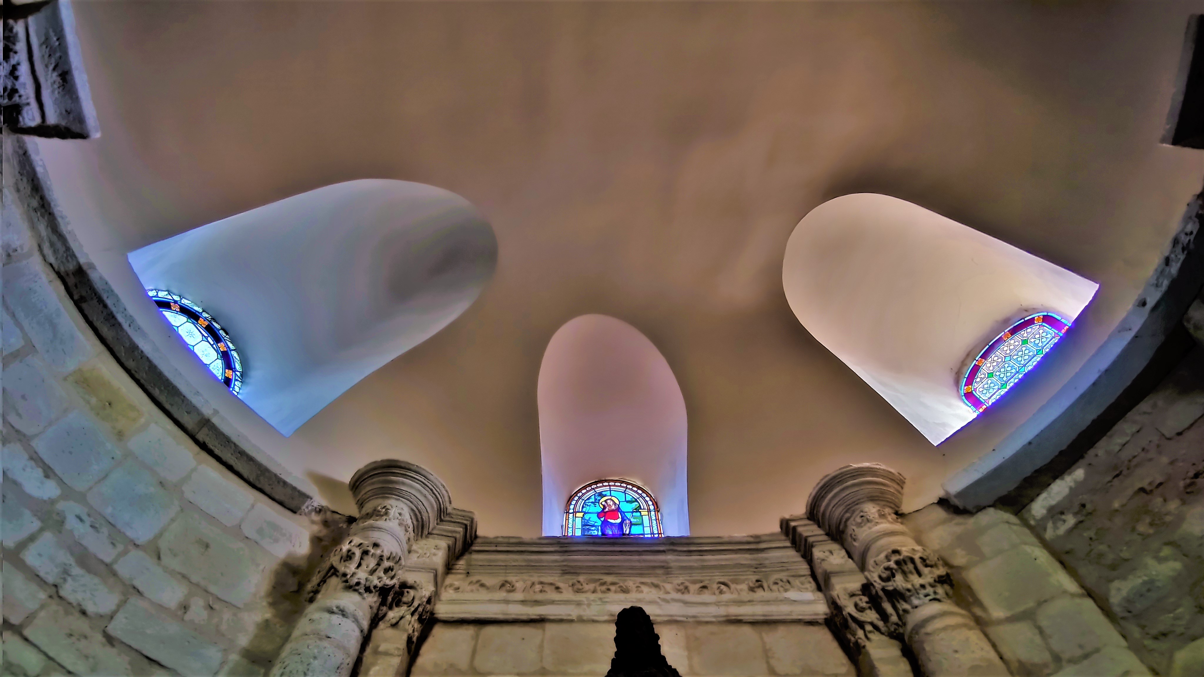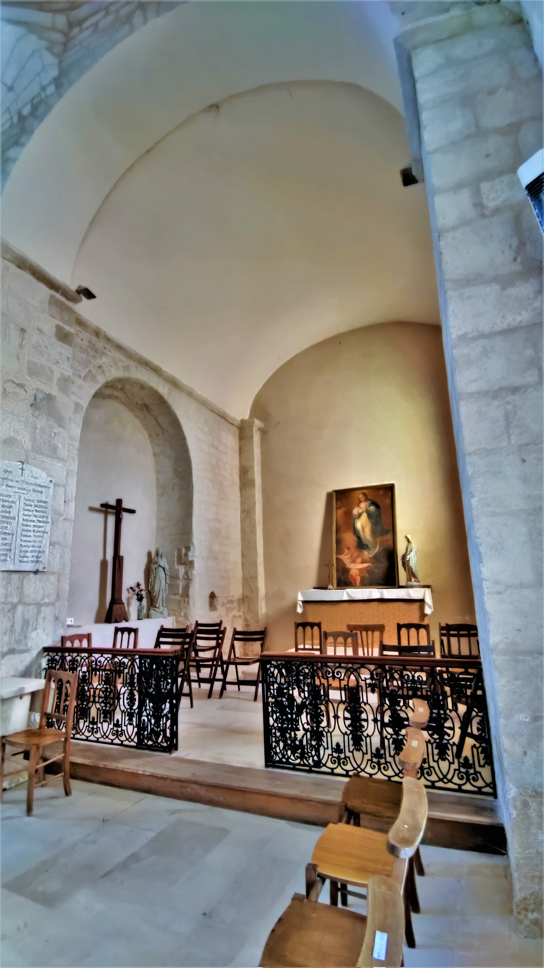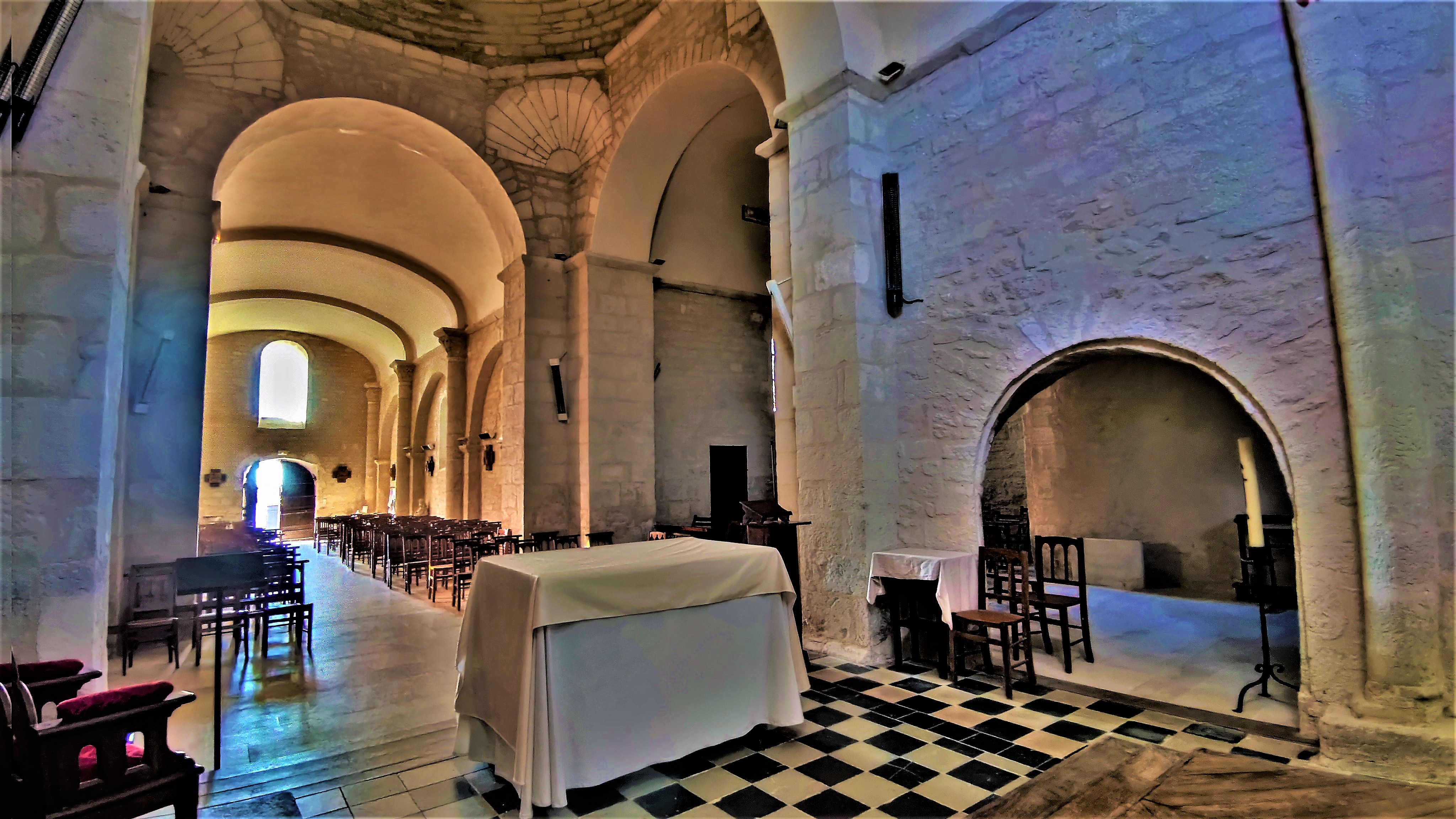 Vue du Nord, le clocher carré est massif et imposant, il témoigne des origines de l'édifice, 11è ou 12è. Ce clocher repose sur le carré du transept couvert d'une coupole sur trompe datée du 12è. L'église fut reconstruite en grande partie au 17è, après sa destruction pendant les guerres de religions. De nombreux réemplois dans la maçonnerie ont permis de préserver l'esprit roman de l'église primitive. Les arcatures et les baies en plein cintre de la nef apportent une certaine élégance. Les colonnes et chapiteaux sculptés ont été préservés. La voûte en berceau de pierres qu'ils supportaient s'étant effondrée, les matériaux ont servi à rehausser le sol. Au 19è, on reconstruisit une voûte de briques en anse de panier. Cette dernière est en cohérence avec celle refaite dans l'abside, sorte de demi-coupole qui s'élève au-dessus du sanctuaire, le mur Est faisant office de retable. La travée du chœur, ouverte au Nord sur une chapelle, est voûtée de briques en plein cintre comme les croisillons.