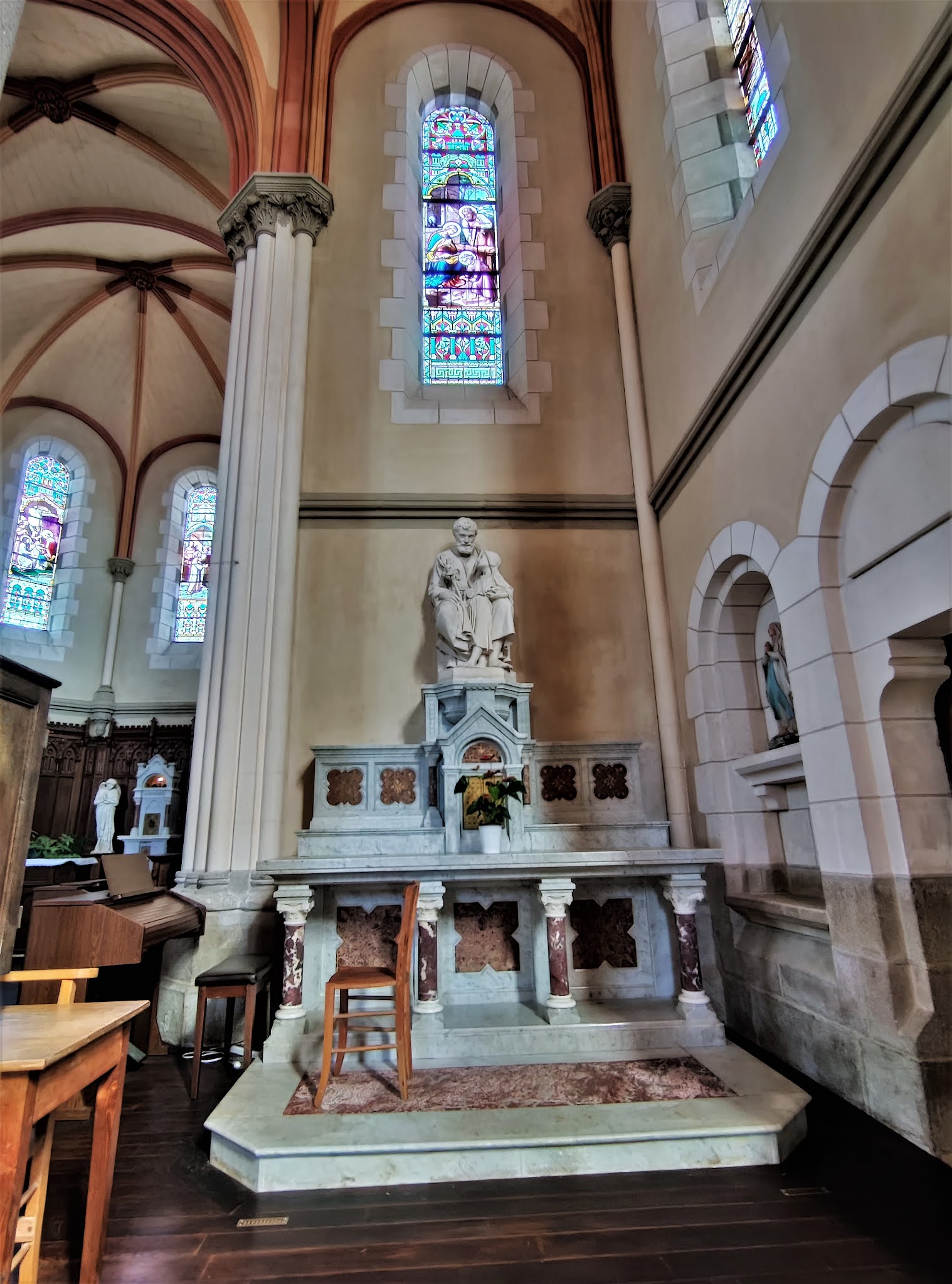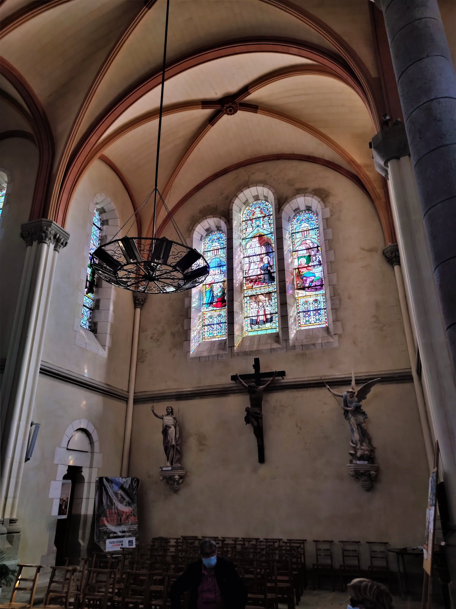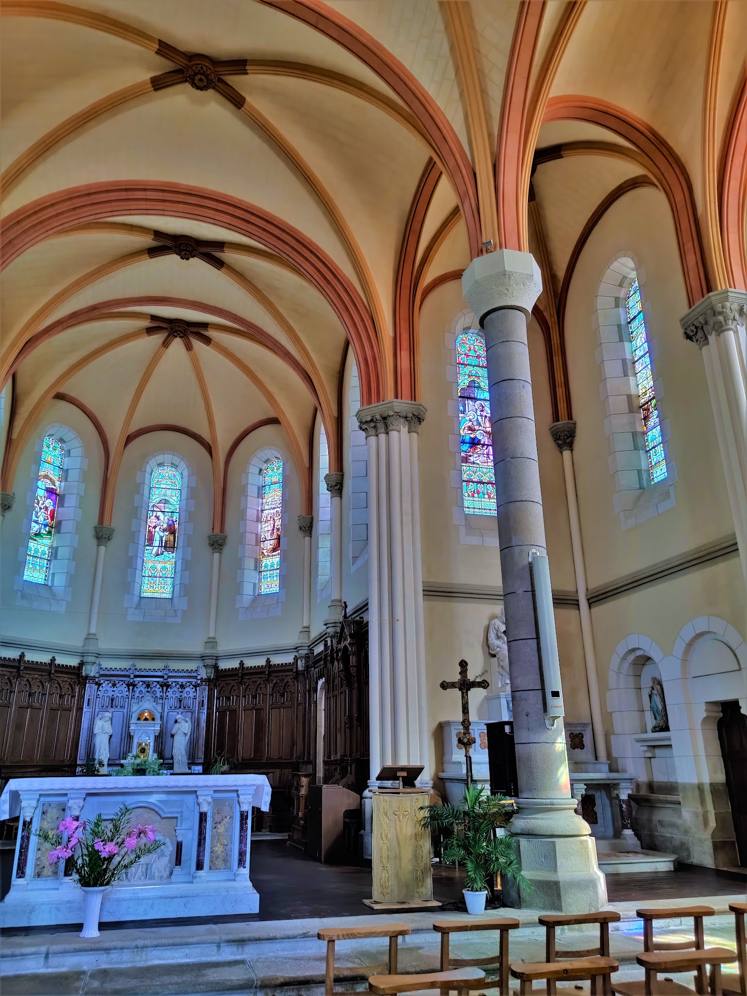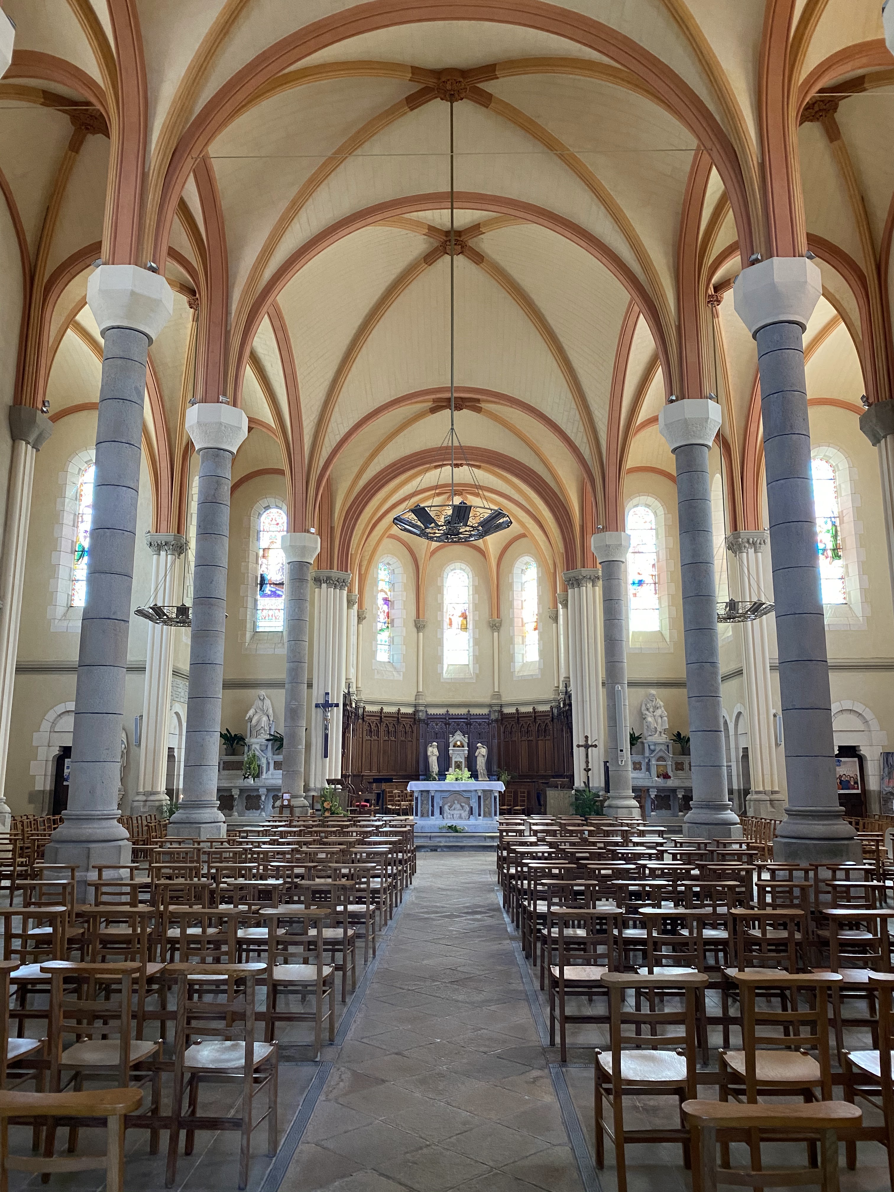 Une plaisante découverte, dont l'originalité renoue avec le passé médiéval qui connut des églises très colorées. Cette église fut construite à l'emplacement d'une église du 12ème siècle, détruite en 1849 par l'effondrement de son clocher. Deux campagnes de construction ont été nécessaires, de 1885 à 1905 (chantier bloqué par la loi de séparation de l'église et de l'état), puis de 1935 à 1938, date de l'édification du clocher. De plan en croix latine, colorée, vaste et lumineuse, elle est dotée de beaux vitraux. La nef possède trois vaisseaux, le vaisseau central se prolonge à l'Est par le chœur, formé d'une travée et d'une abside à 5 pans. De style gothique, les voûtes en croisées d'ogives sont élégantes, les arcs doubleaux, les arcatures et les baies, d'inspiration romane, sont en plein cintre. L'église et son clocher peint se voient de loin, l'accès à l'église est gratuit, la visite du clocher est payante, guidée par un membre de l'Office de Tourisme. Je n'ai pu bénéficier de cette prestation, l'heure avancée de mon passage ne le permettait pas. Une plaisante découverte, dont l'originalité renoue avec le passé médiéval qui connu des églises très colorées, intérieurement et extérieurement. Dans quelques communes, des spectacles en polychromies permettent de redécouvrir la joyeuse magie engendrée par ces décors peints.
