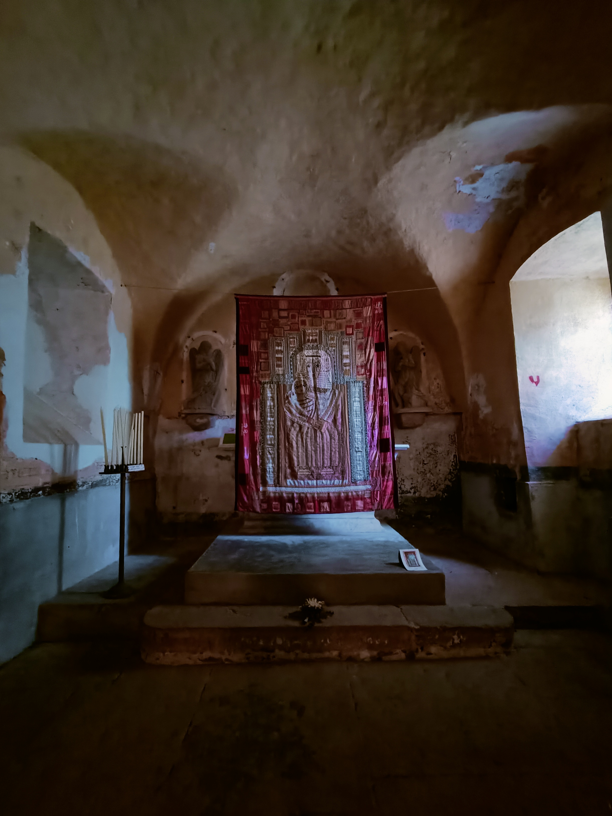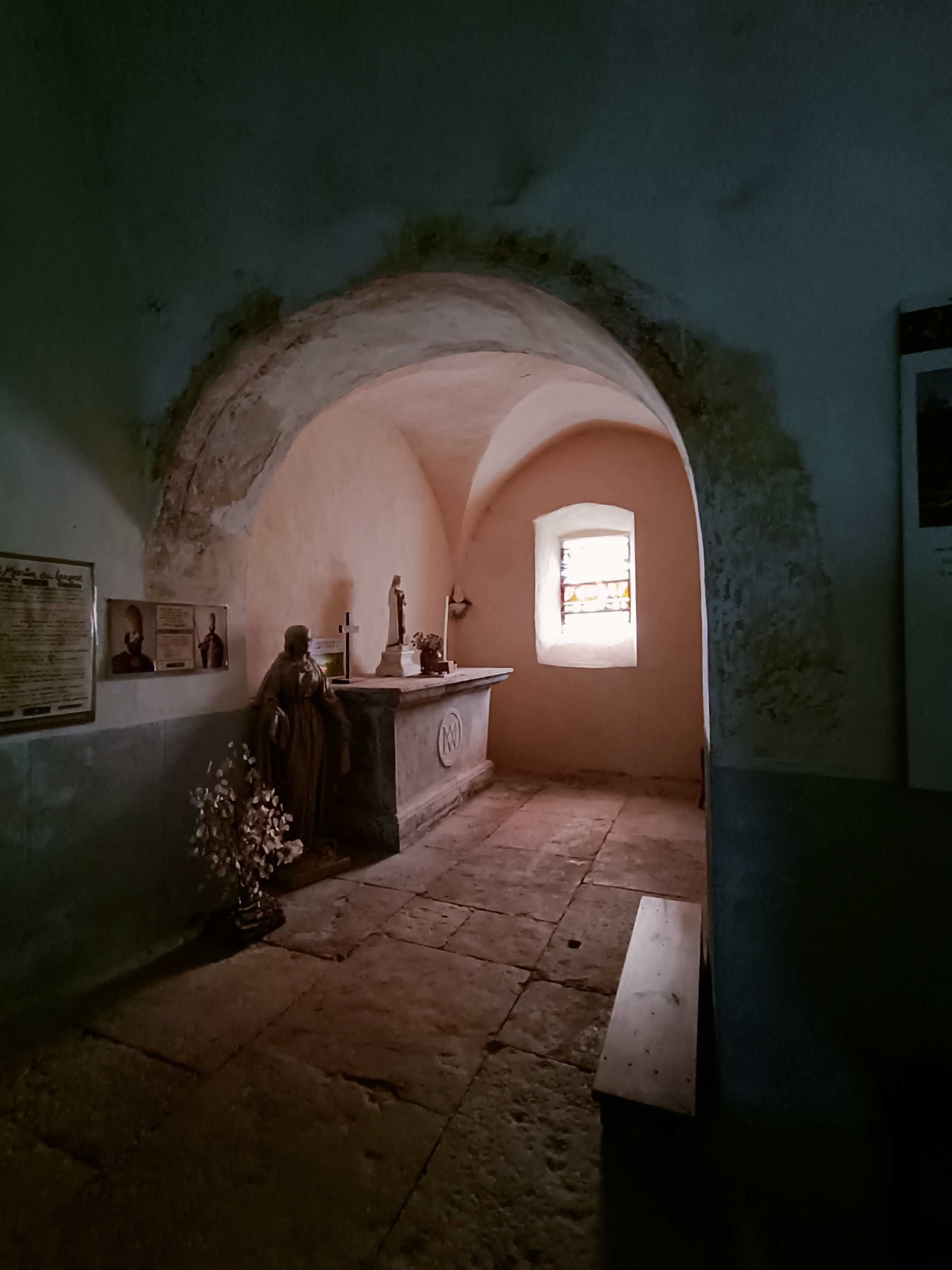 Toute petite église où pour y rentrer il faut passer par un petit chemin A voir !
