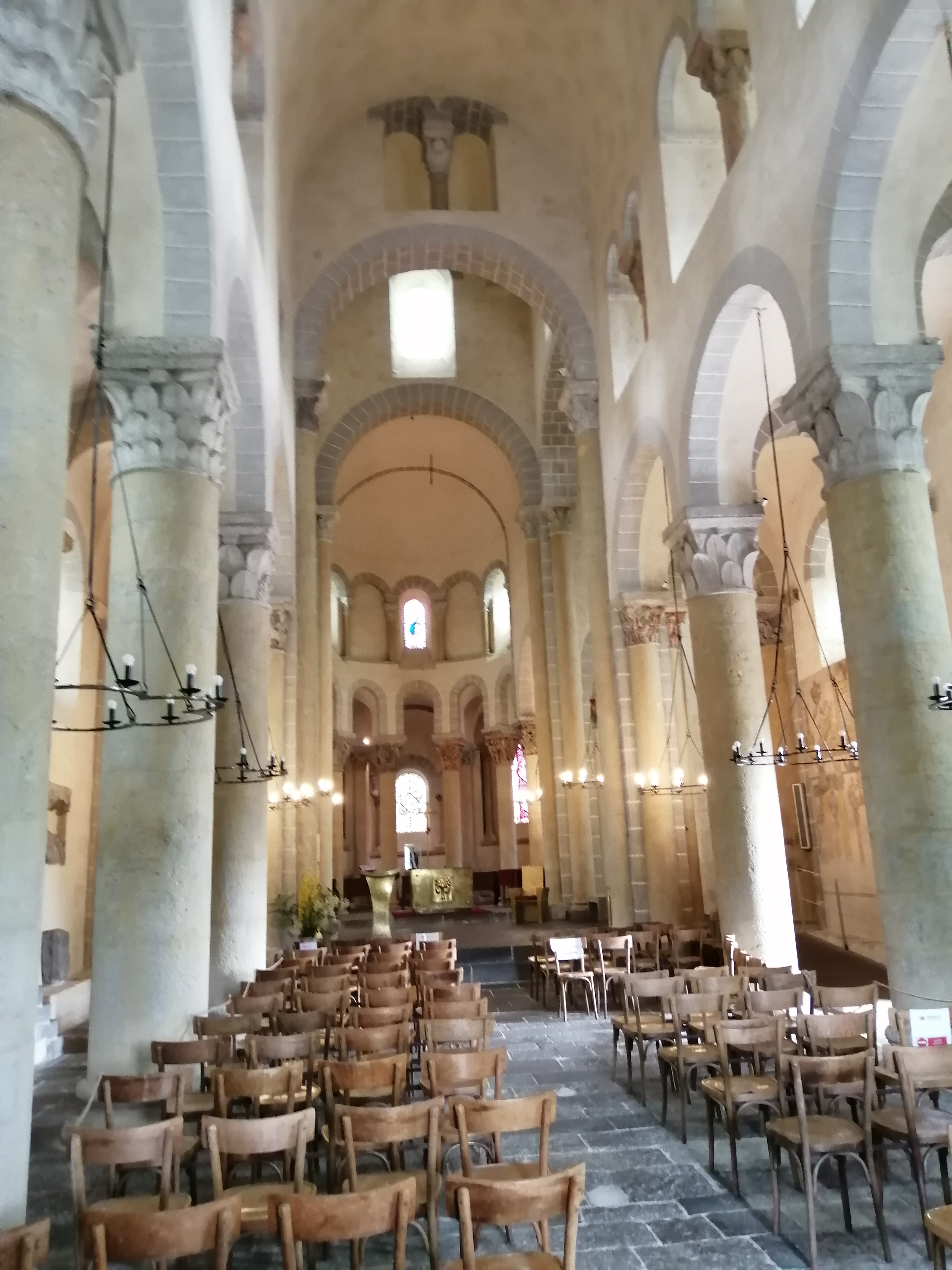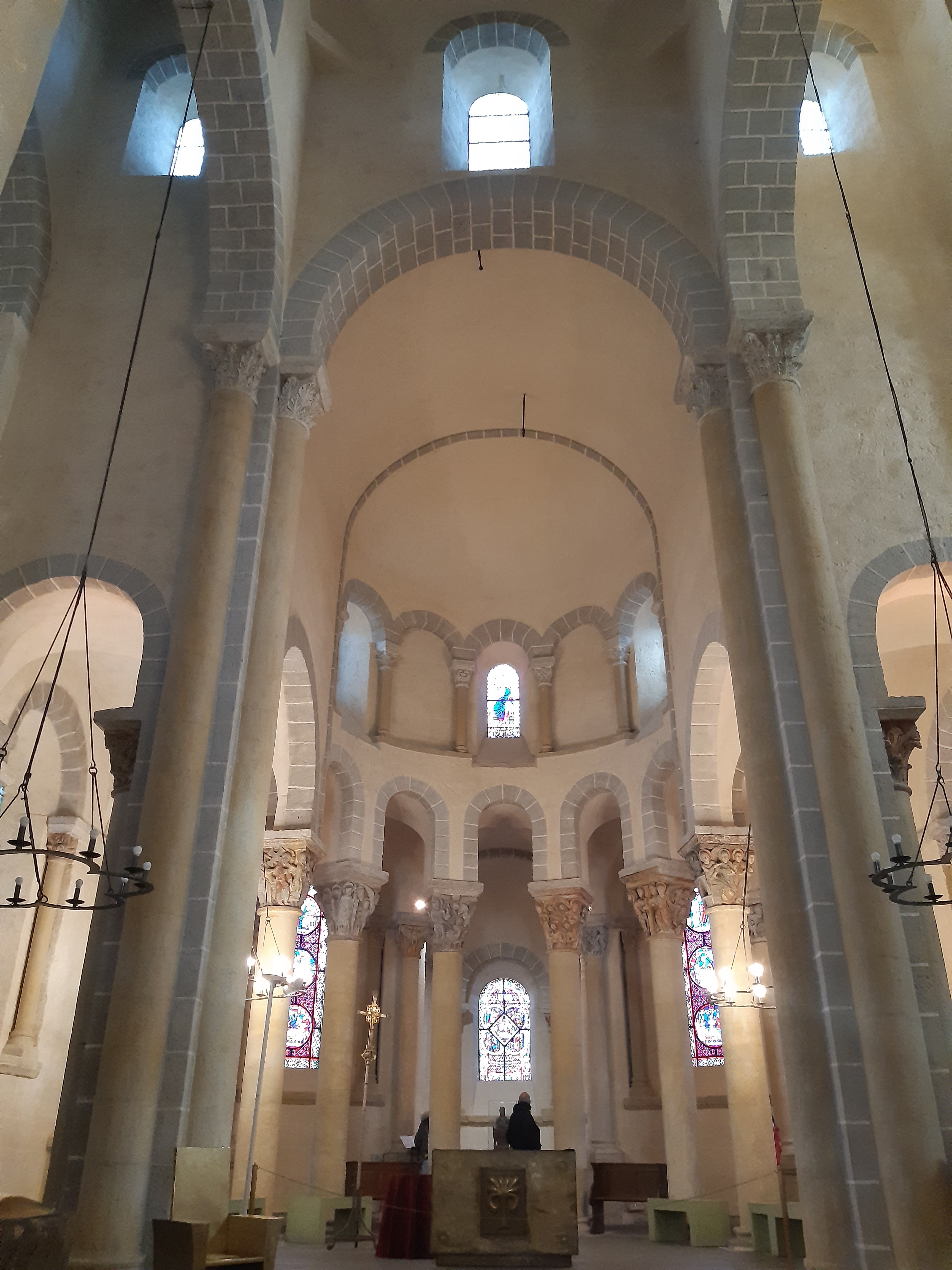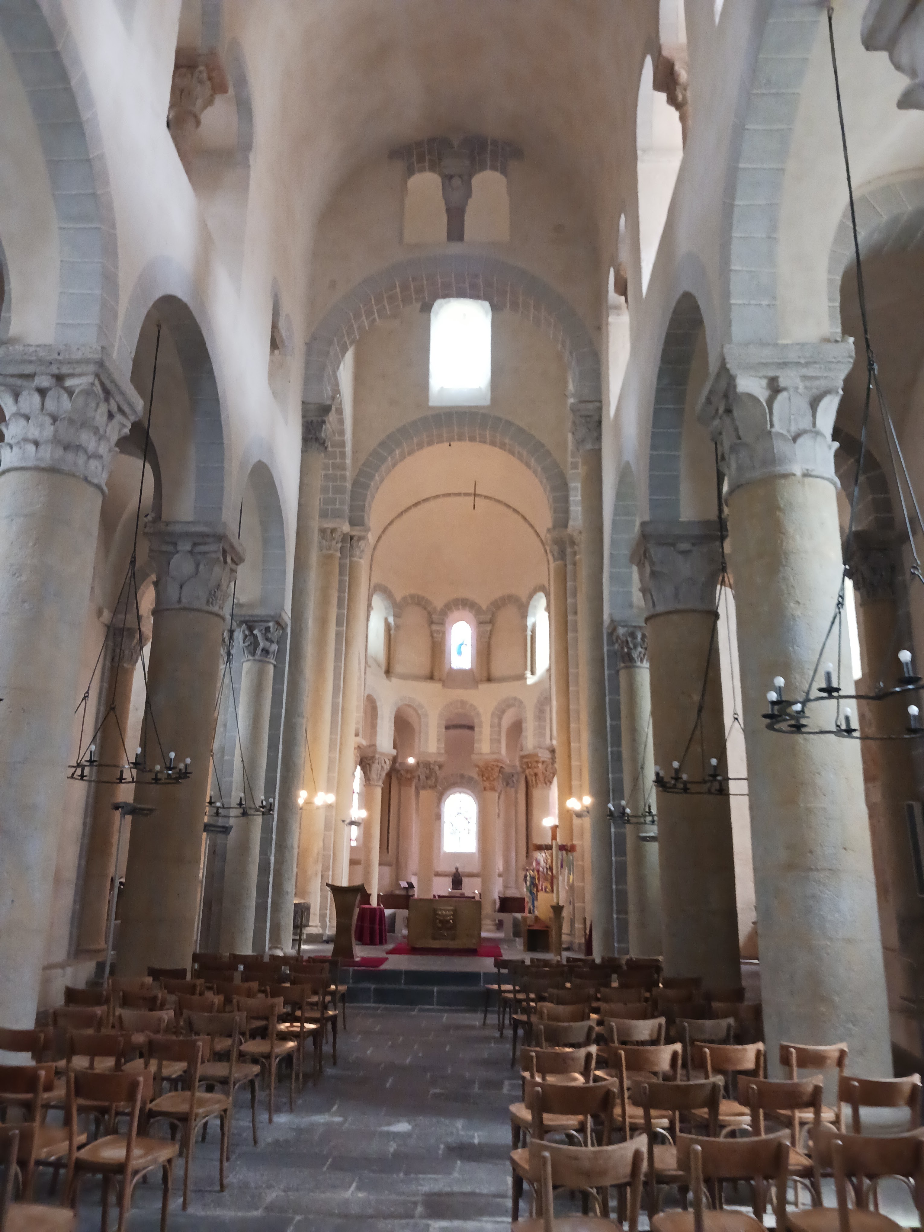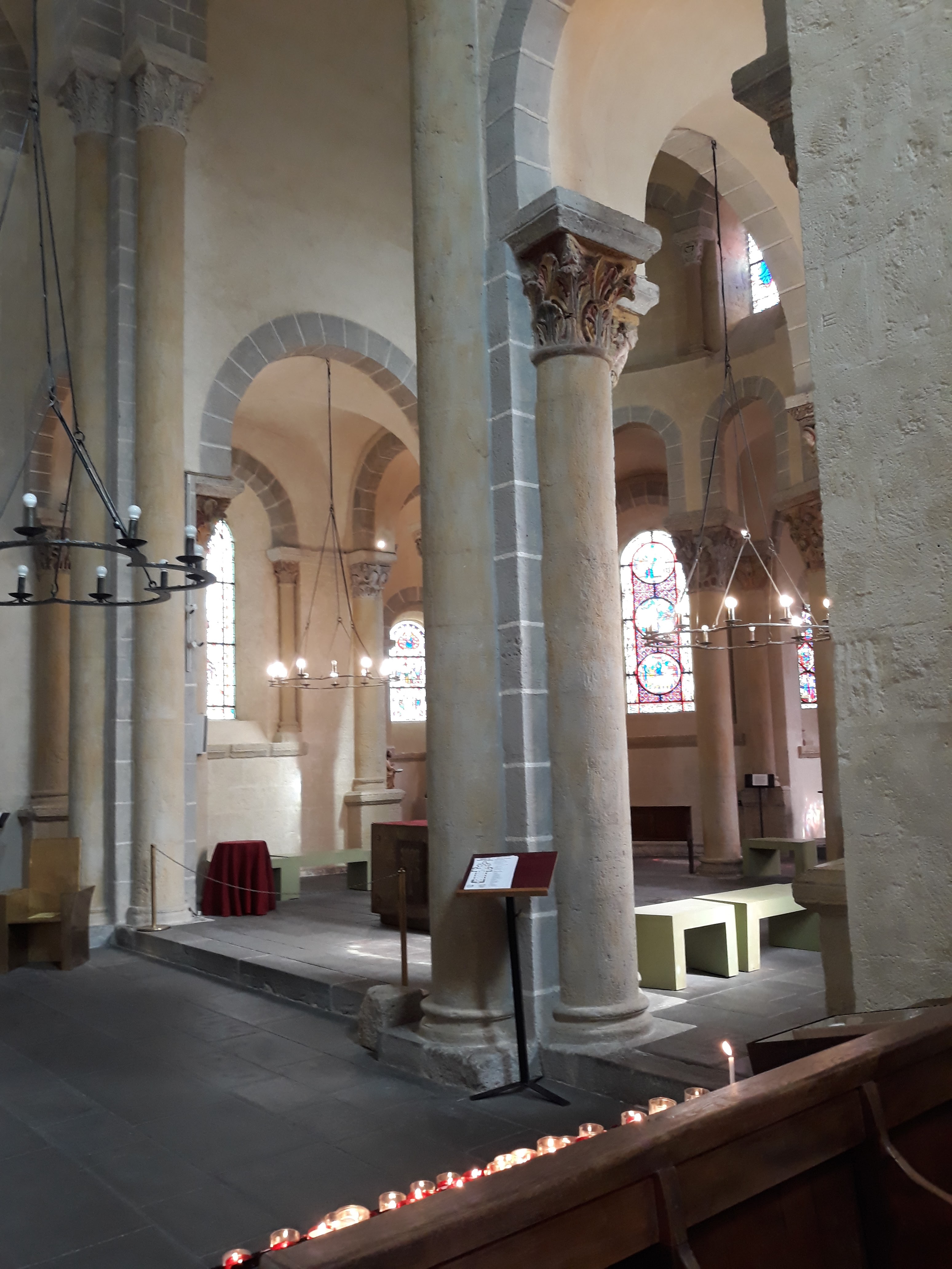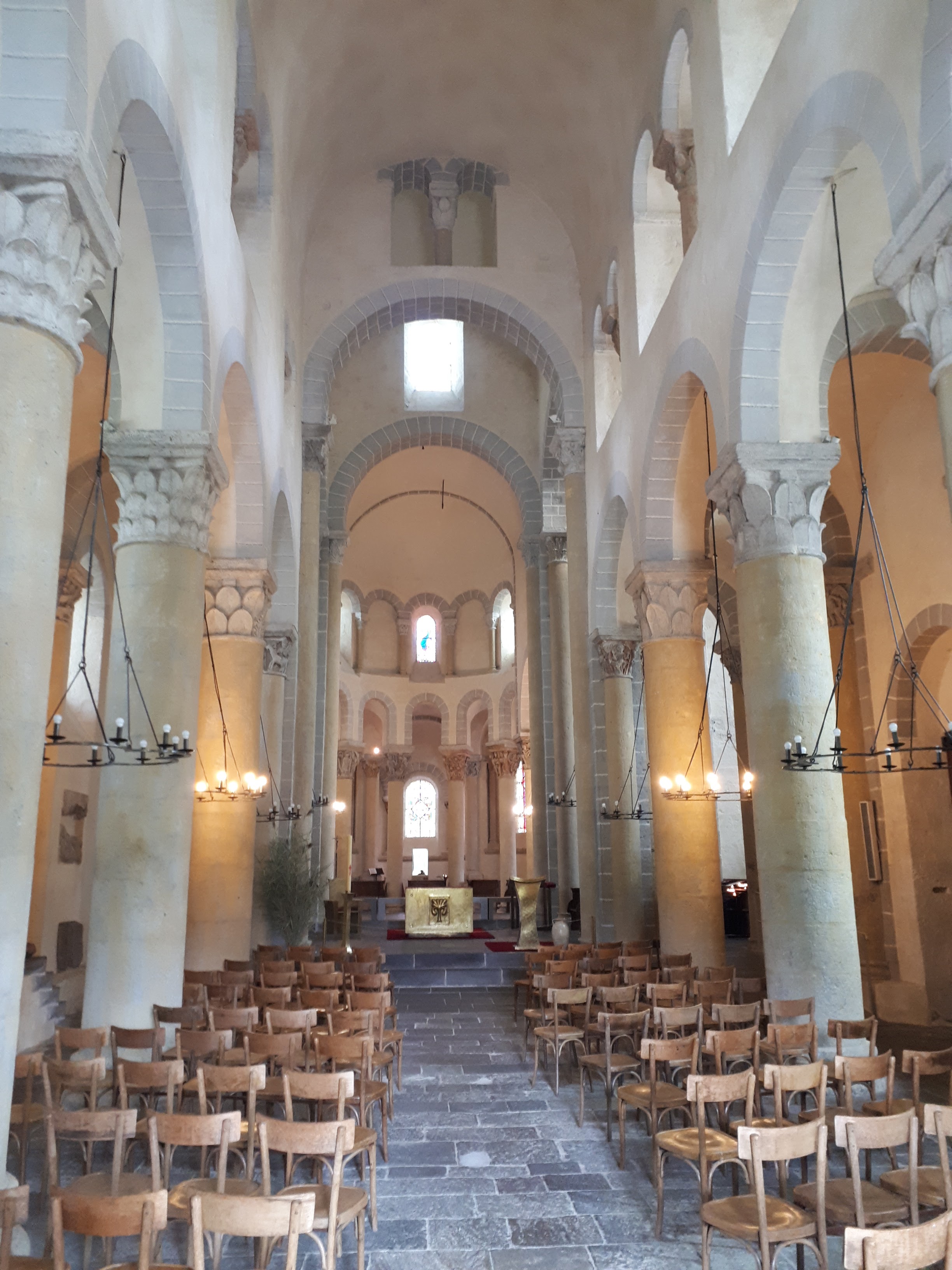 Superbe édifice roman contrastant une pierre sombre à l'extérieur avec des tons clairs à l'intérieur. Les chapiteaux des piliers sont superbes également, présentant des polychromies encore bien visibles