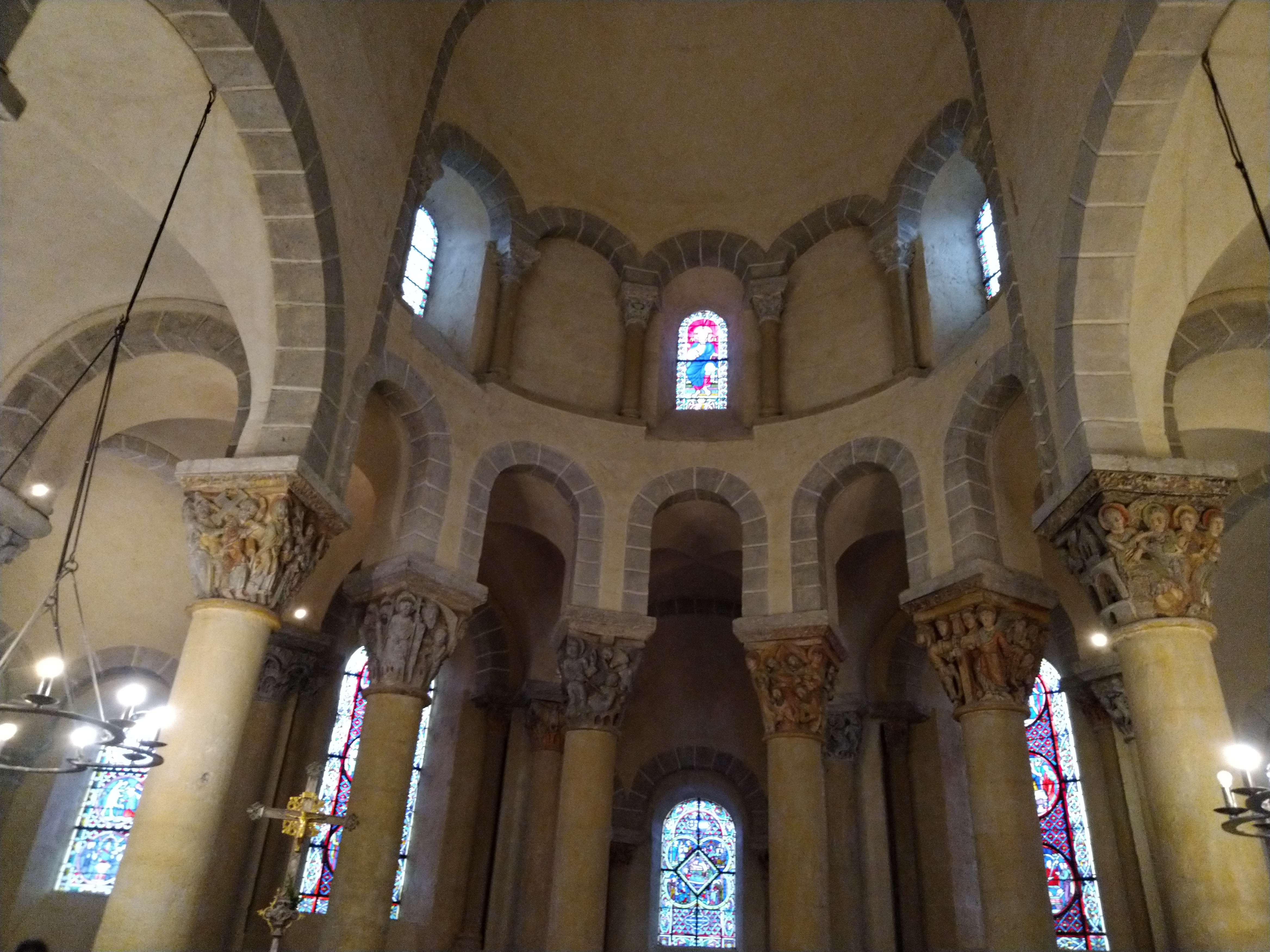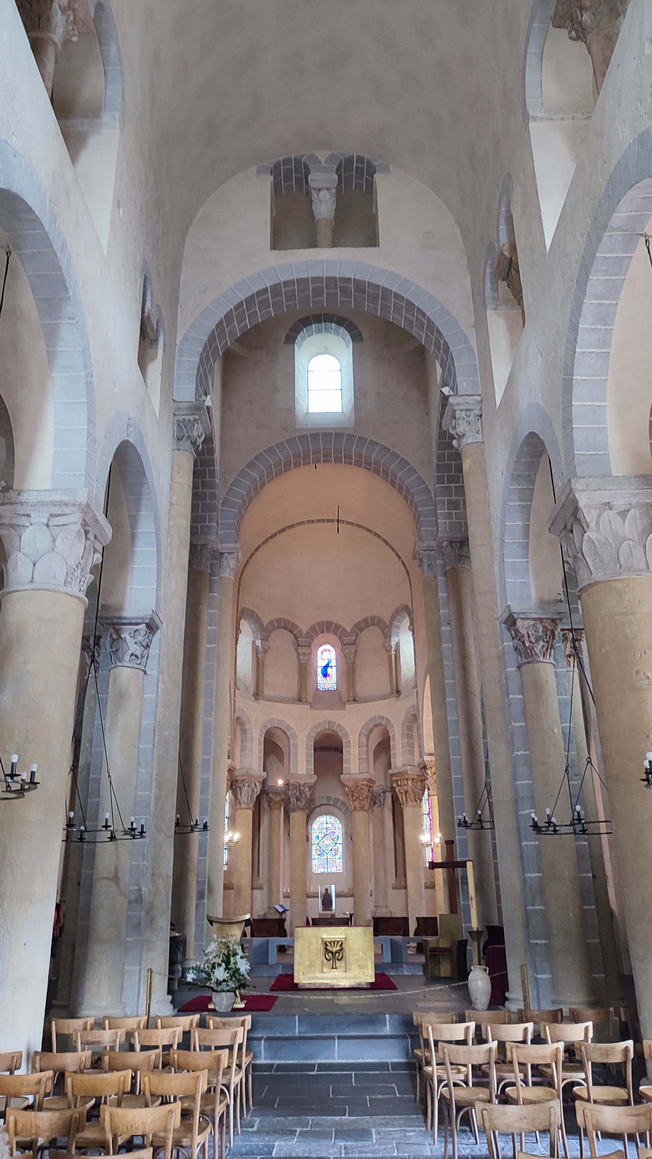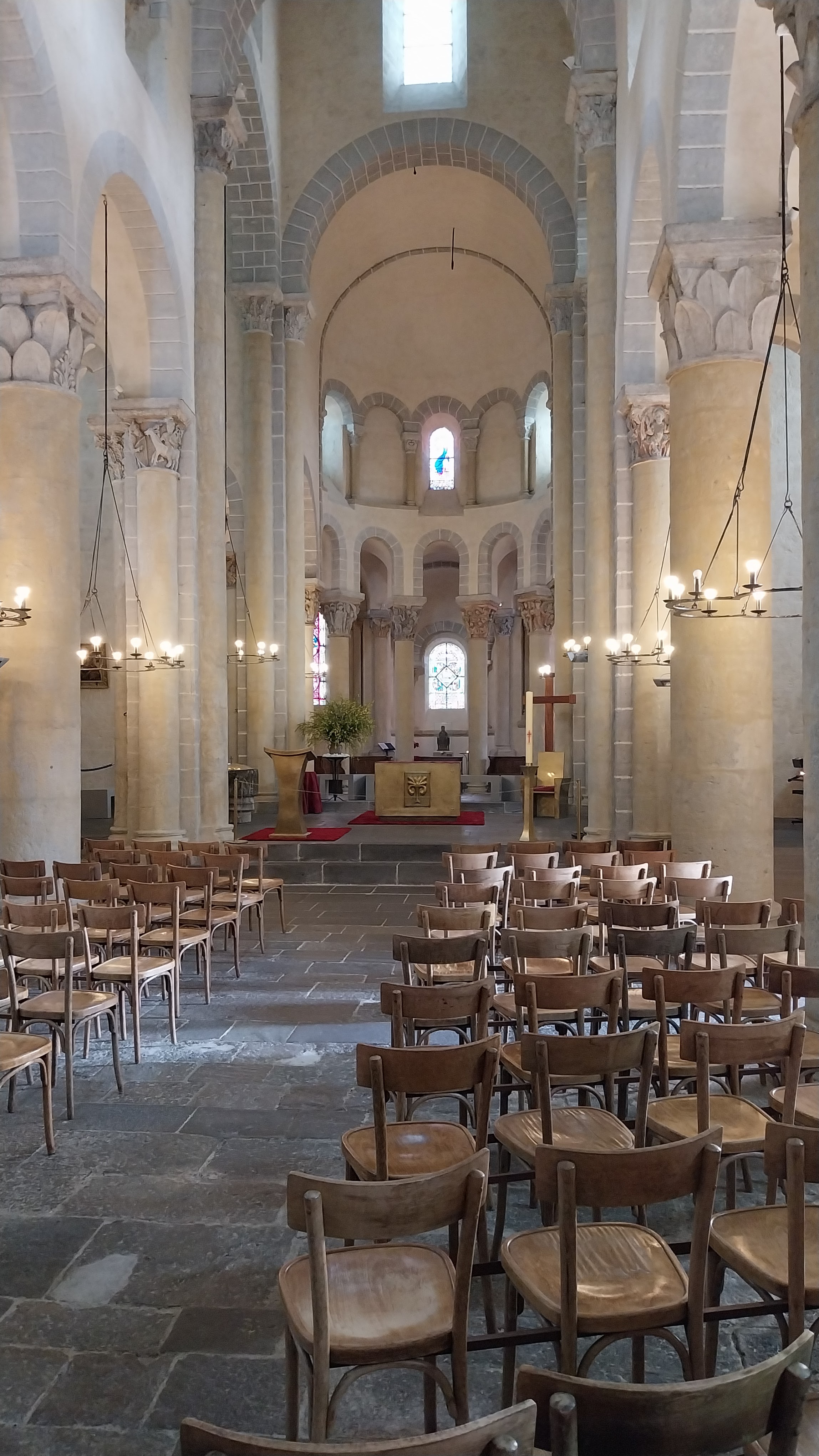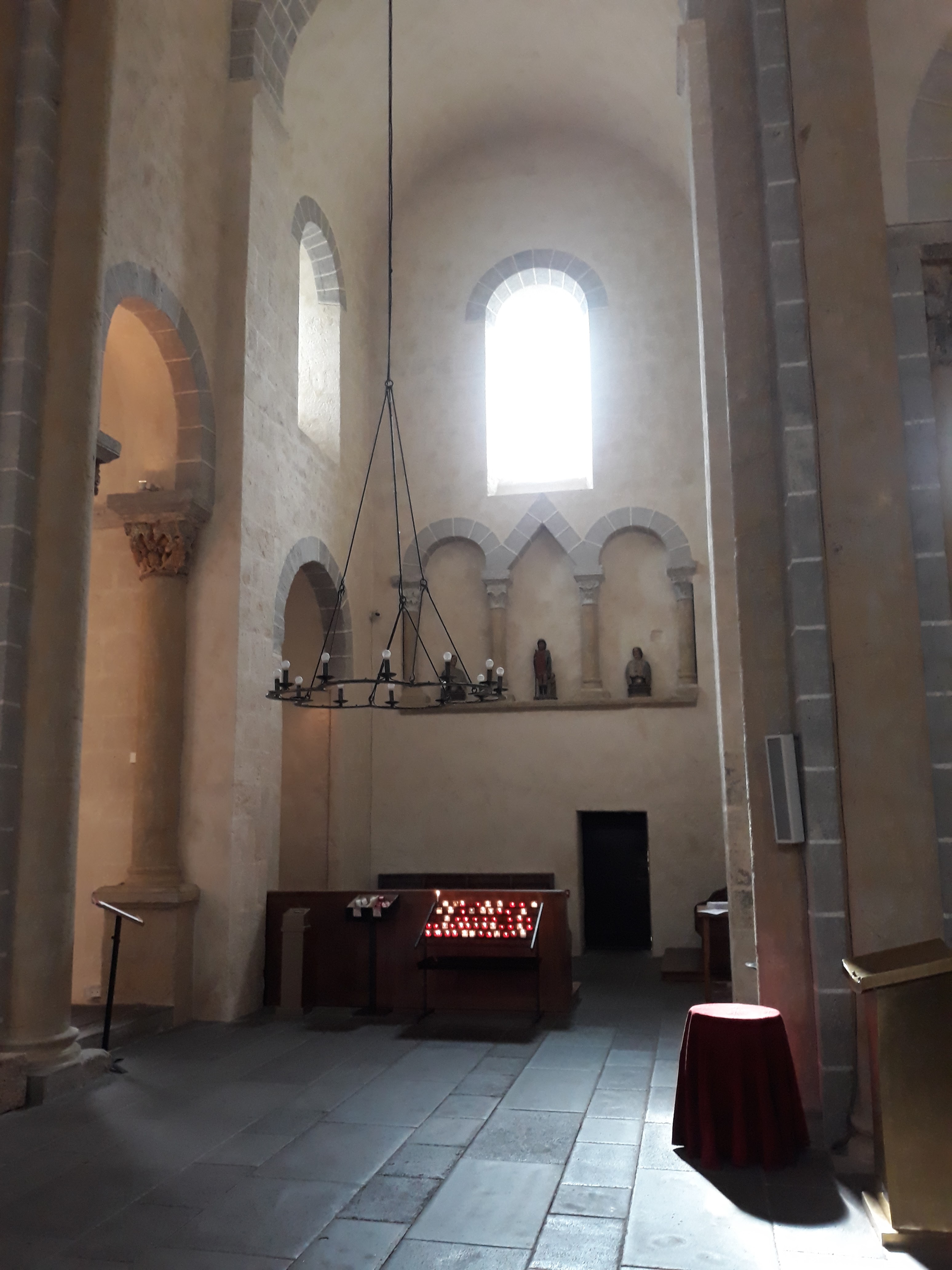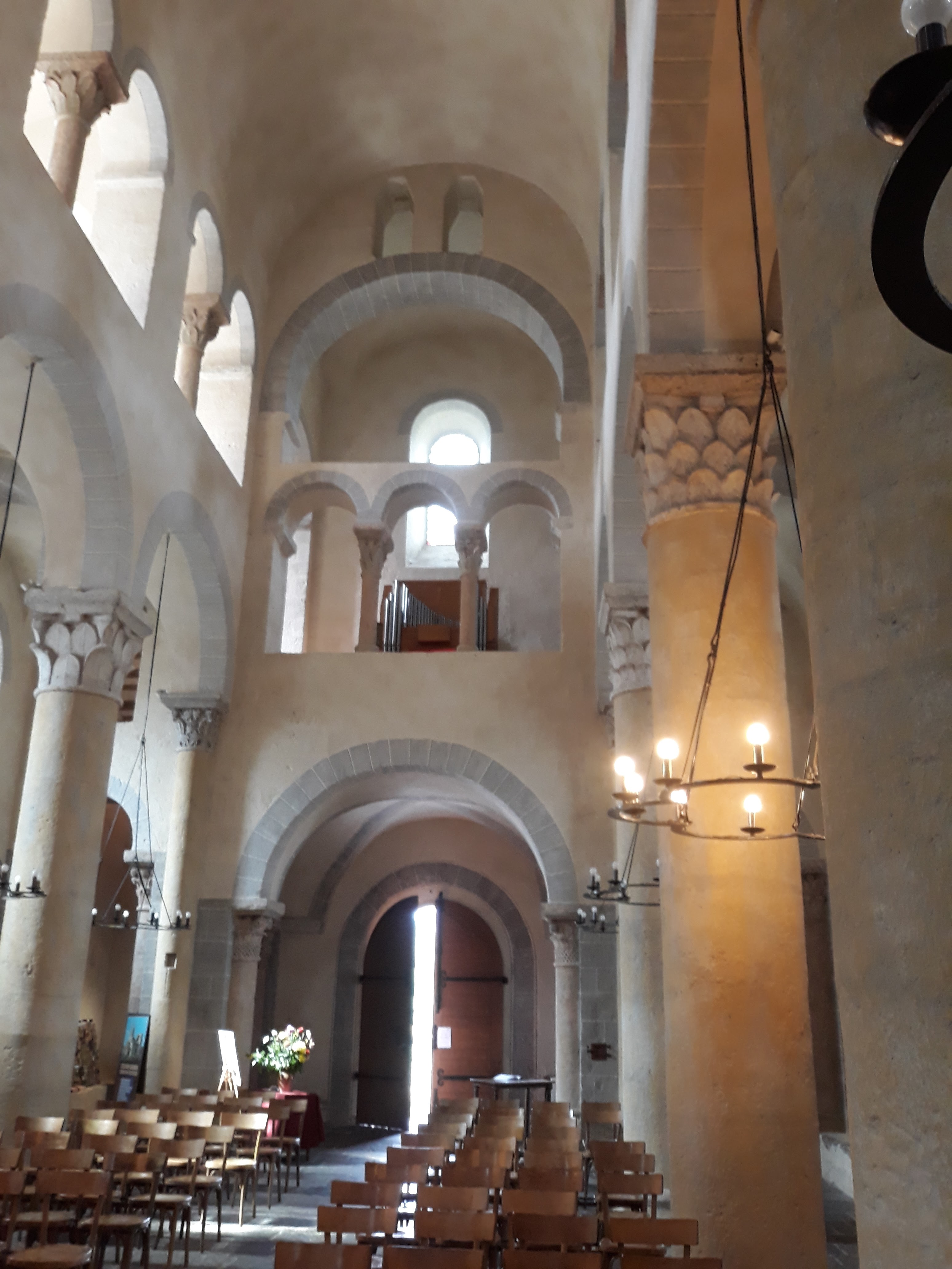 Superbe édifice roman contrastant une pierre sombre à l'extérieur avec des tons clairs à l'intérieur. Les chapiteaux des piliers sont superbes également, présentant des polychromies encore bien visibles