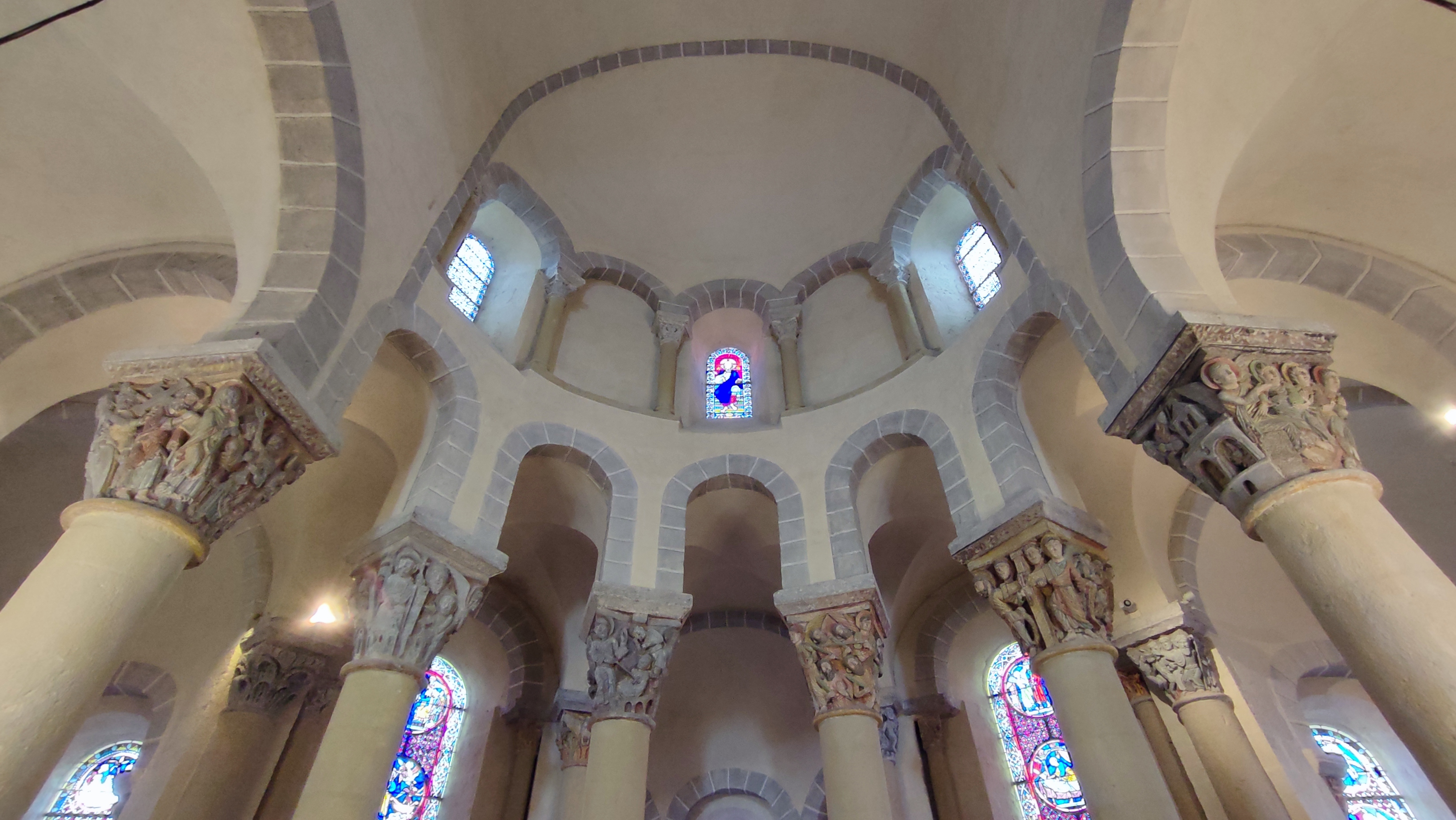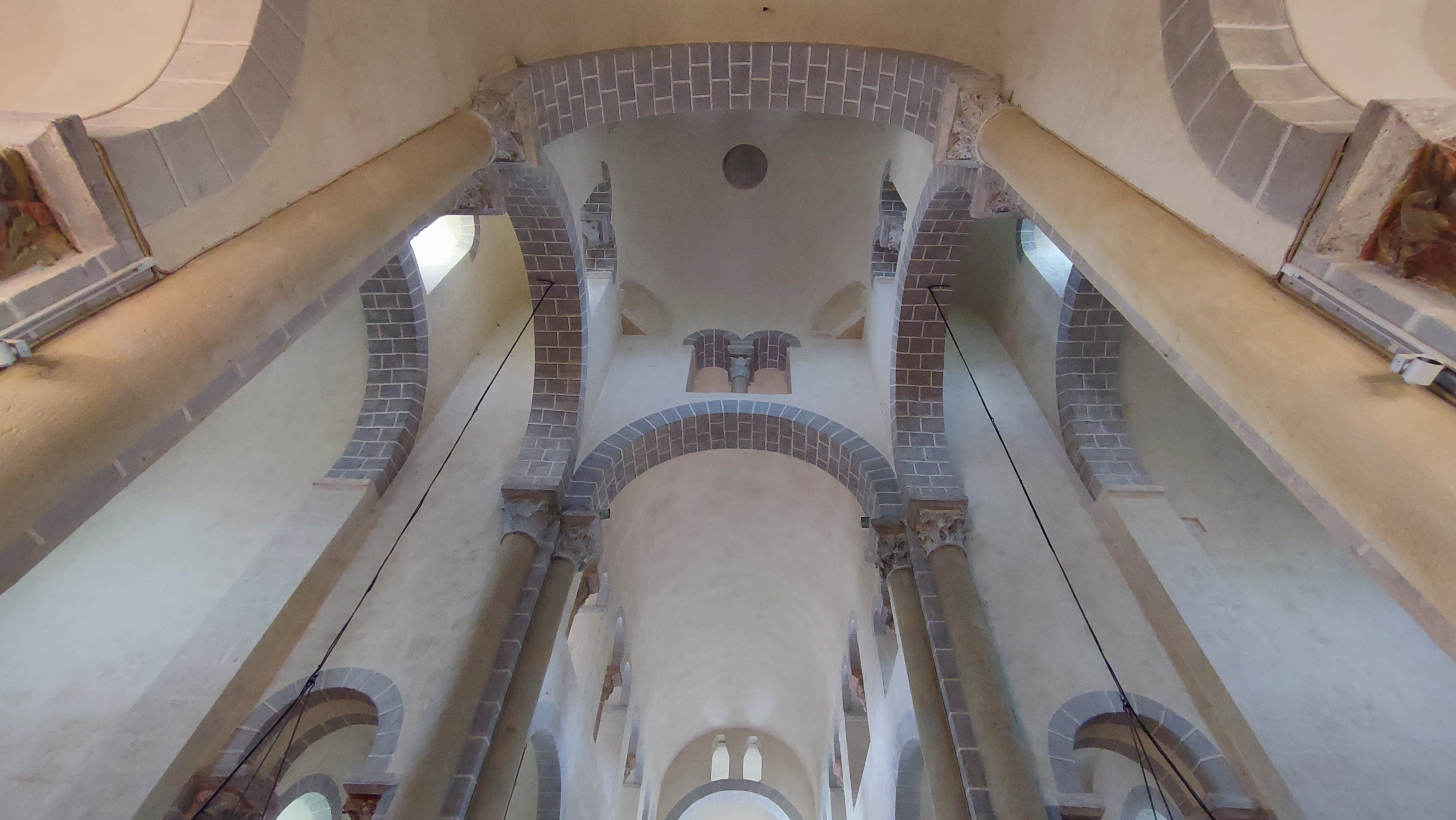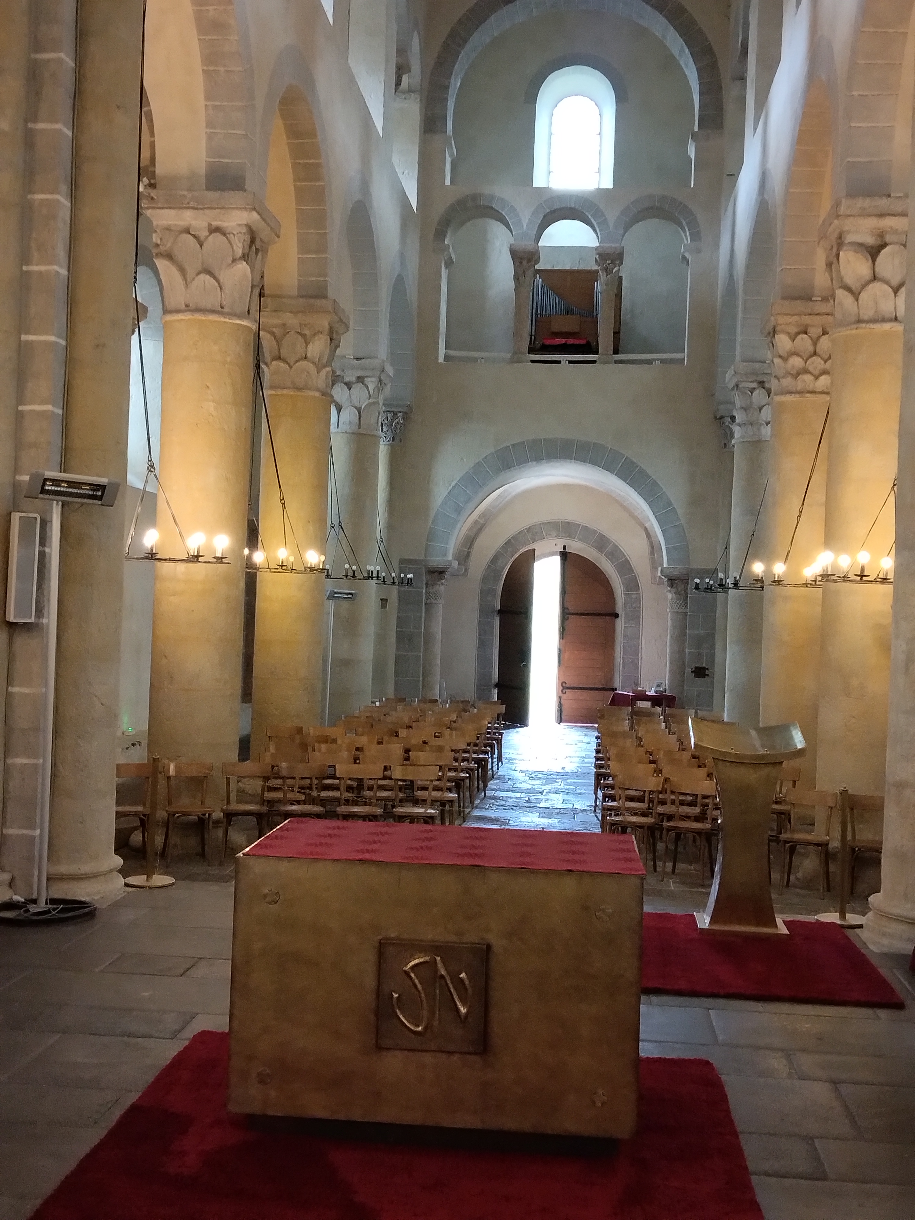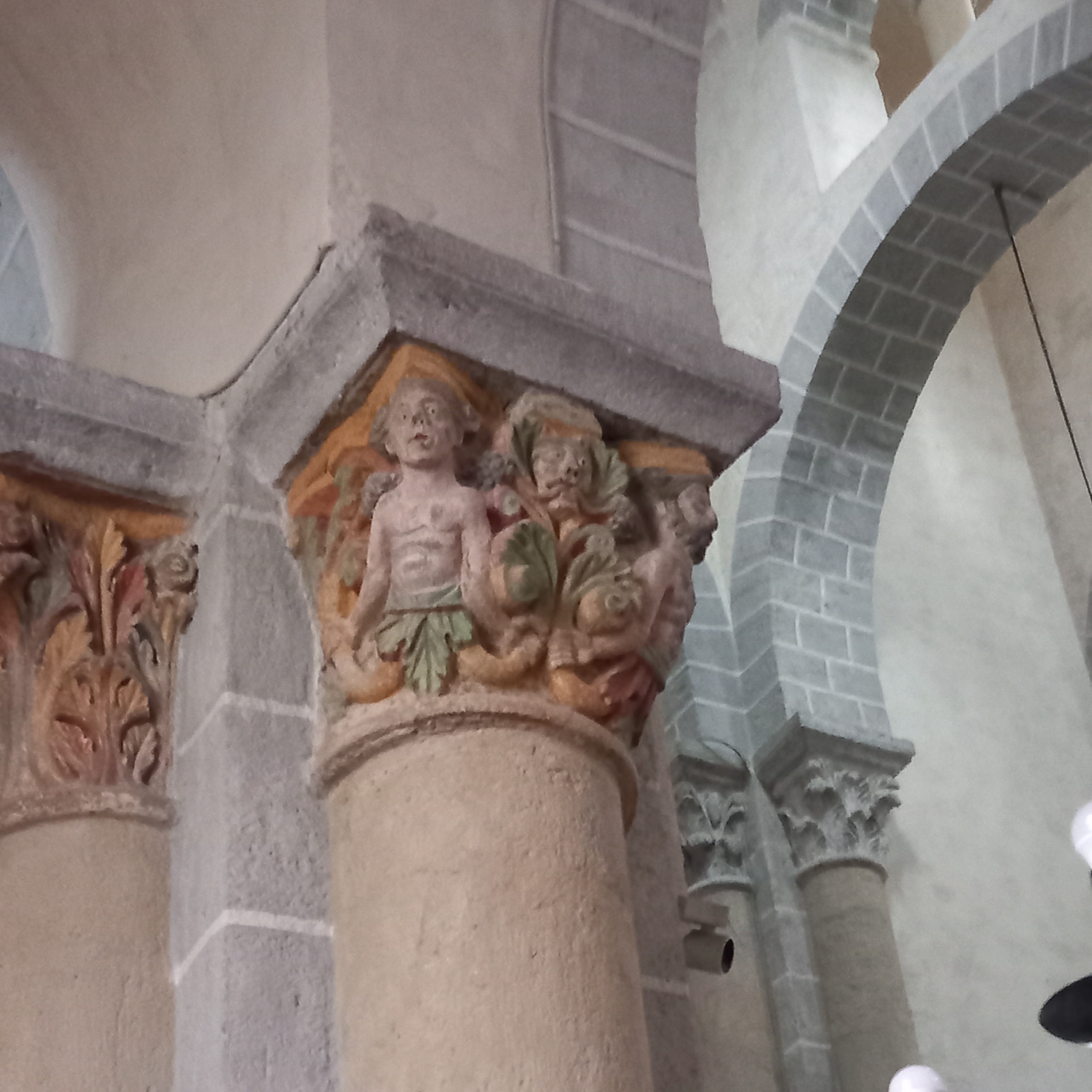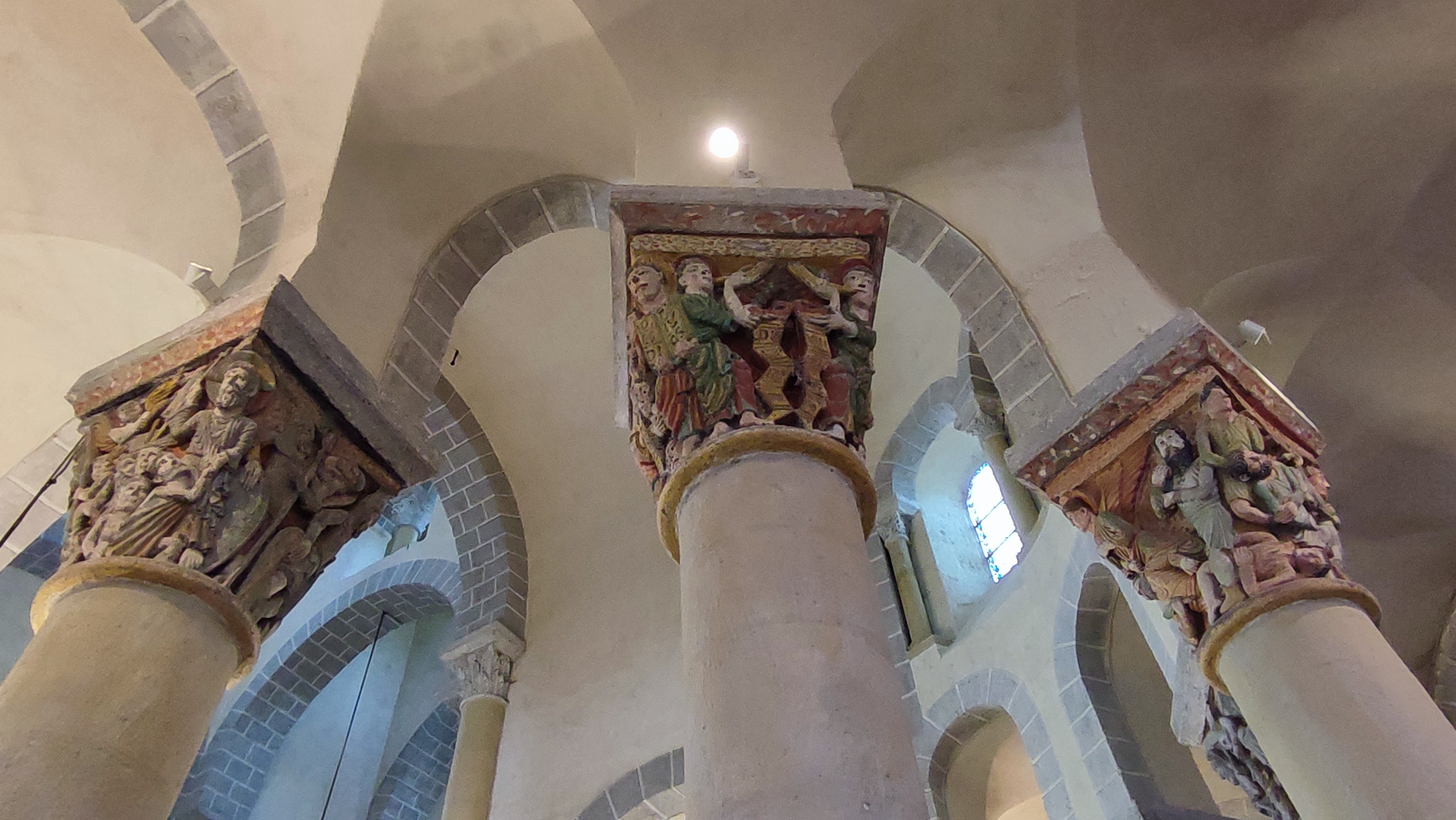 Superbe édifice roman contrastant une pierre sombre à l'extérieur avec des tons clairs à l'intérieur. Les chapiteaux des piliers sont superbes également, présentant des polychromies encore bien visibles