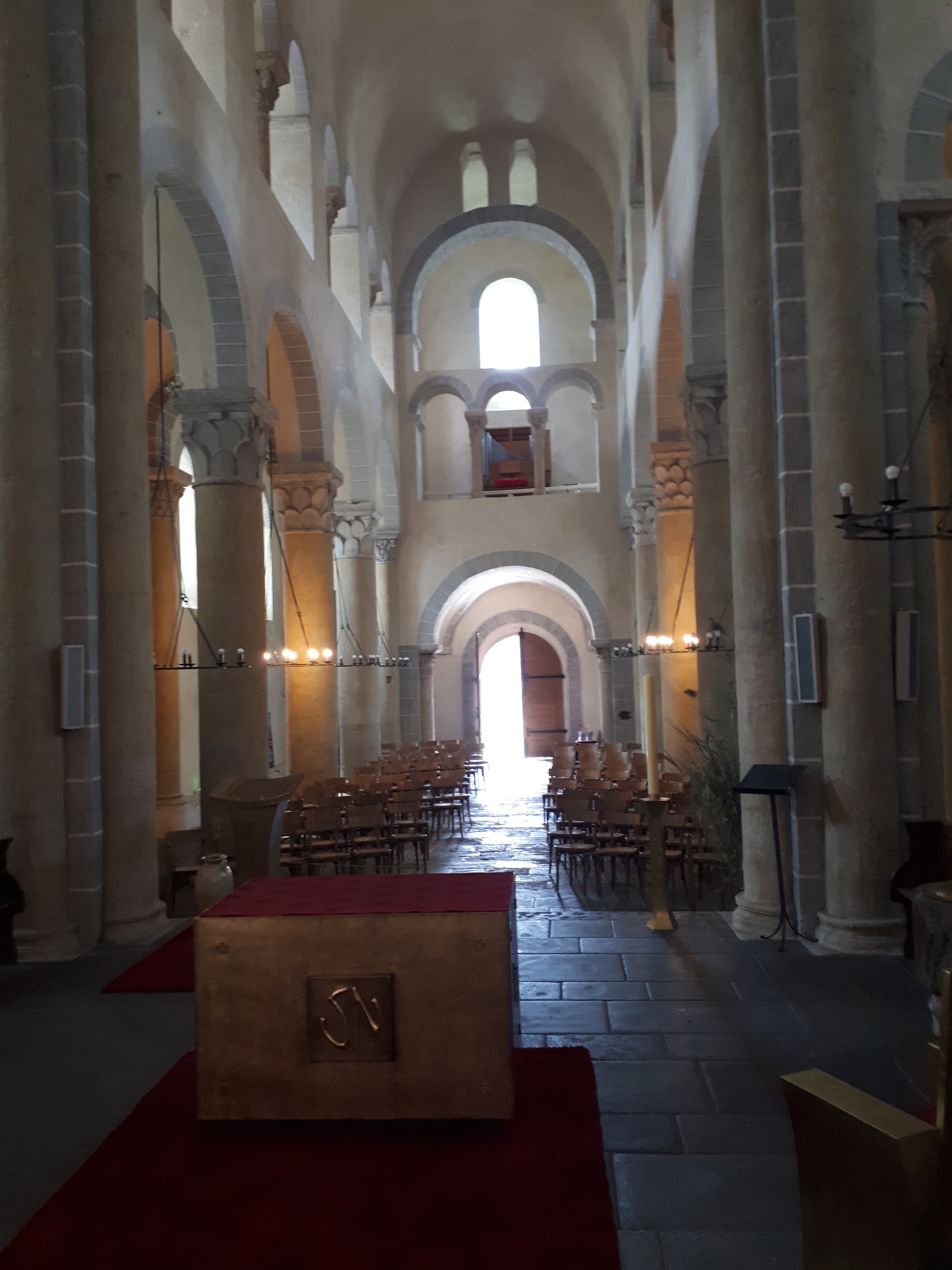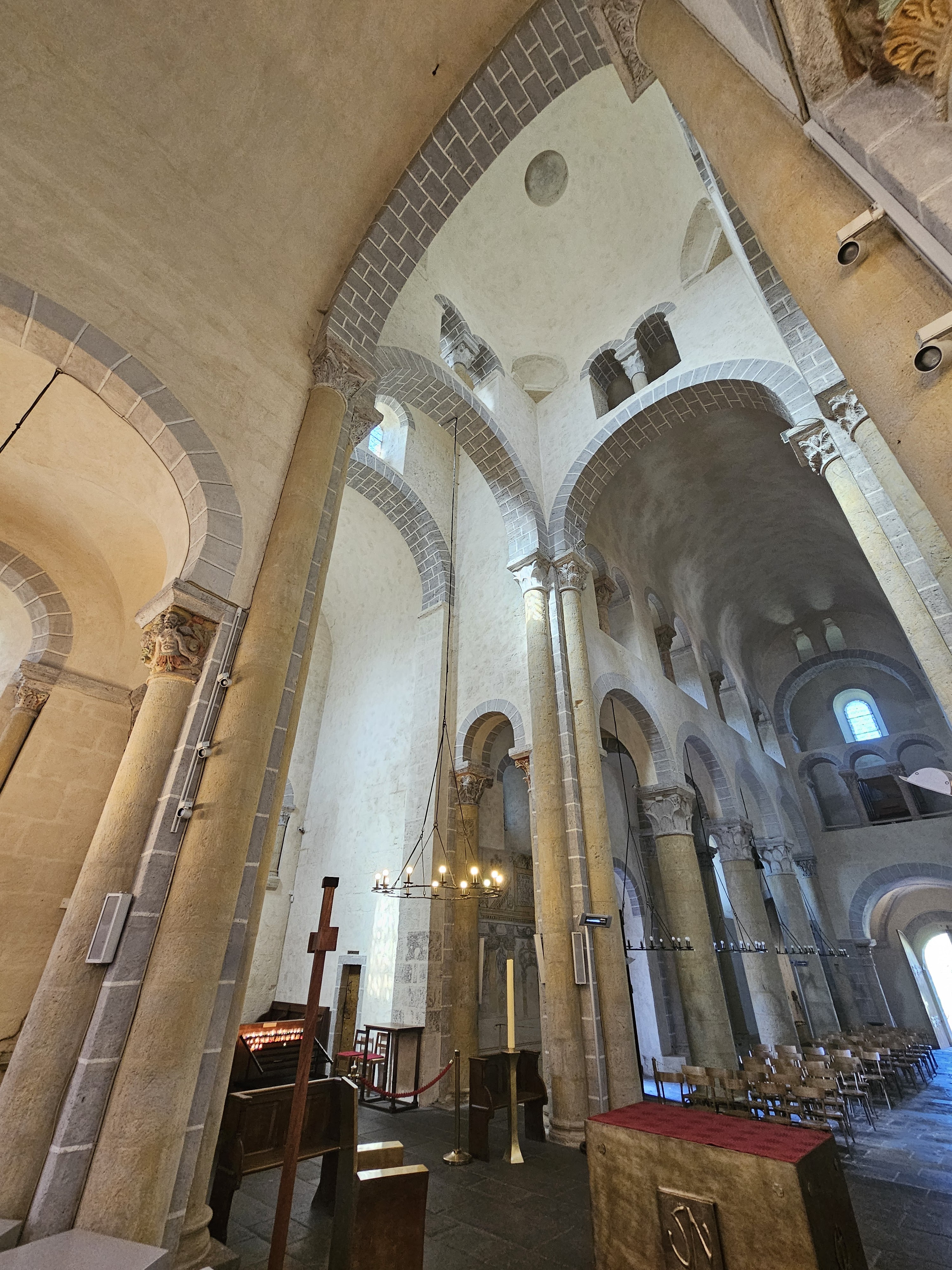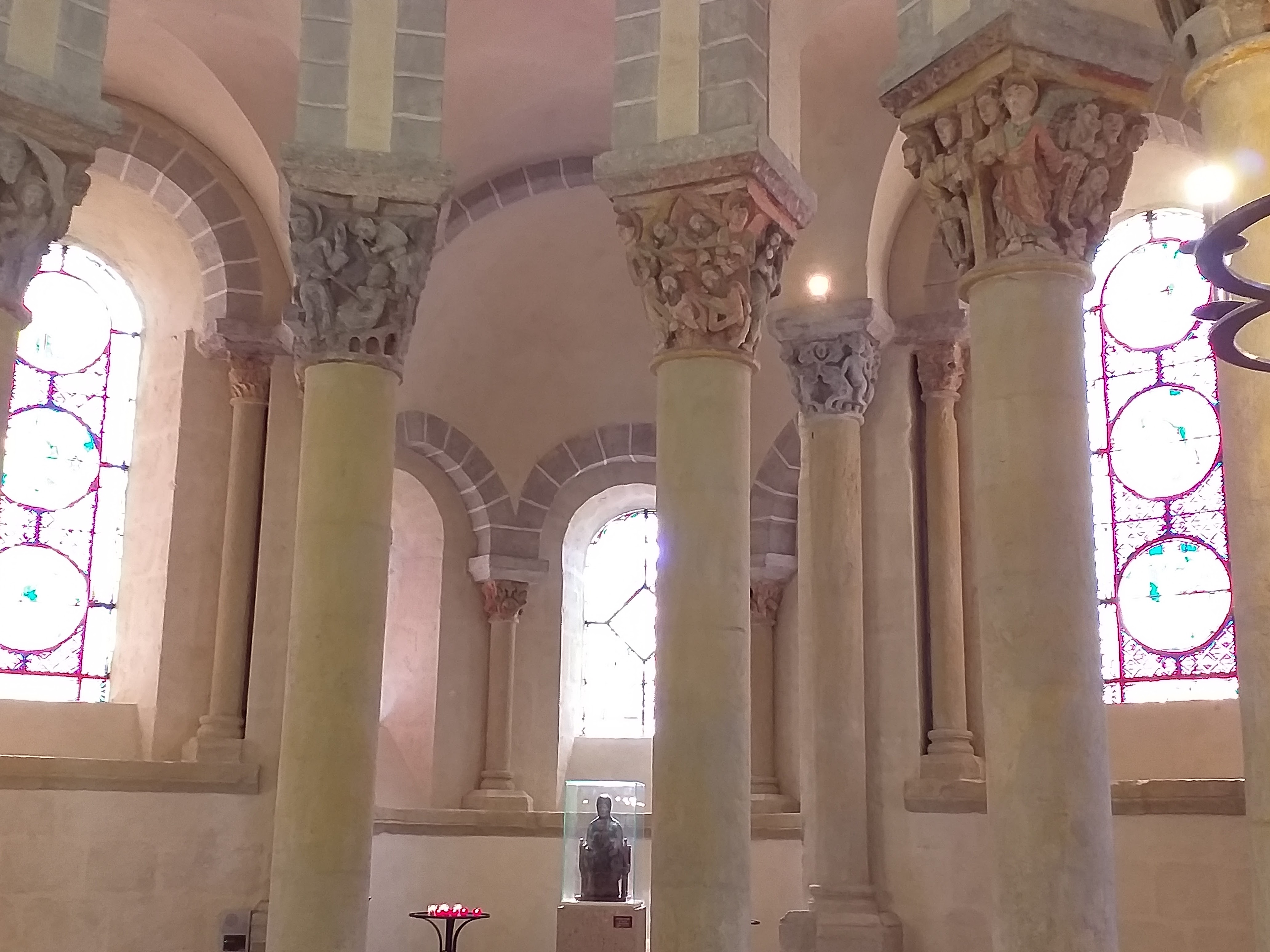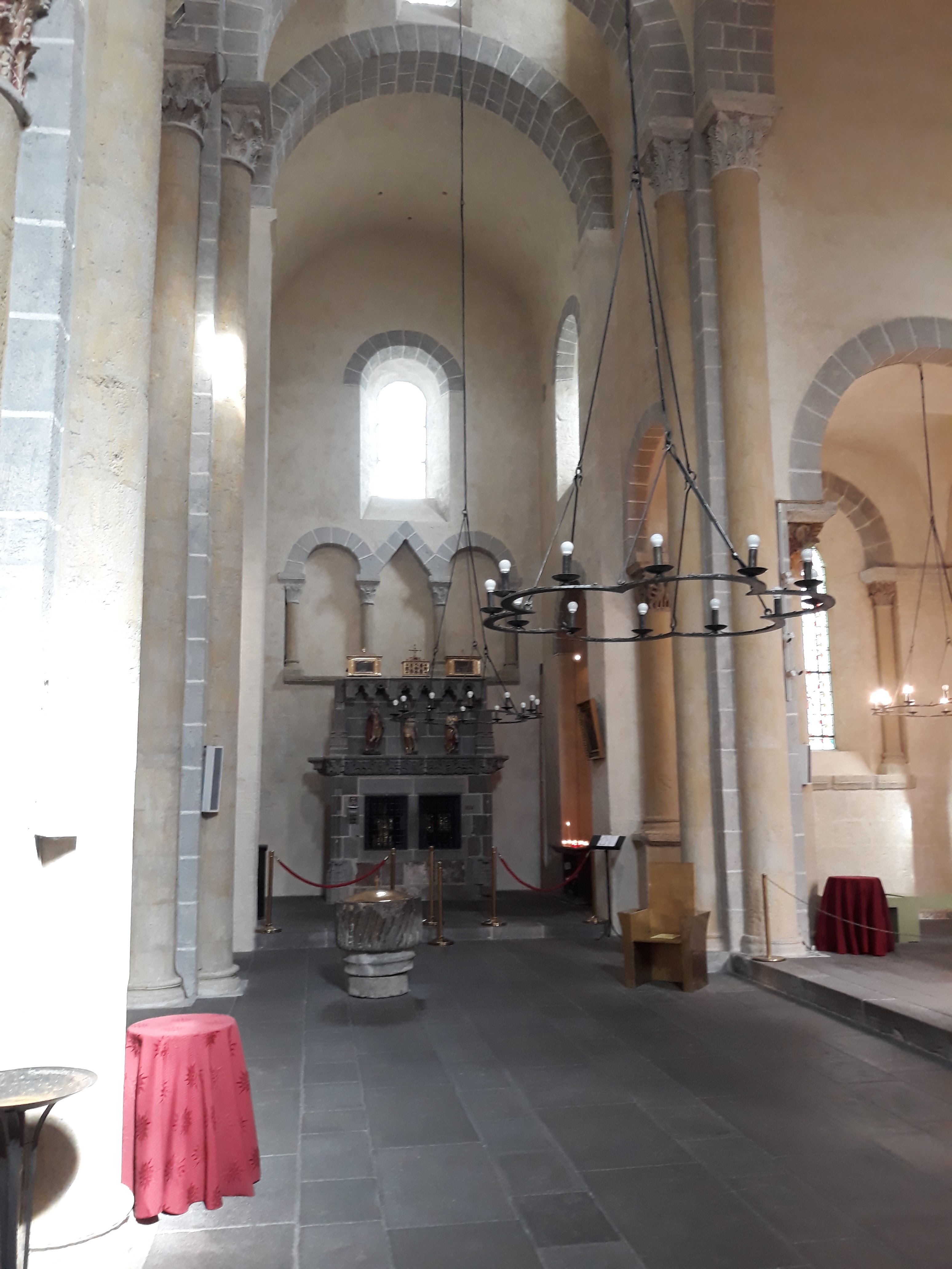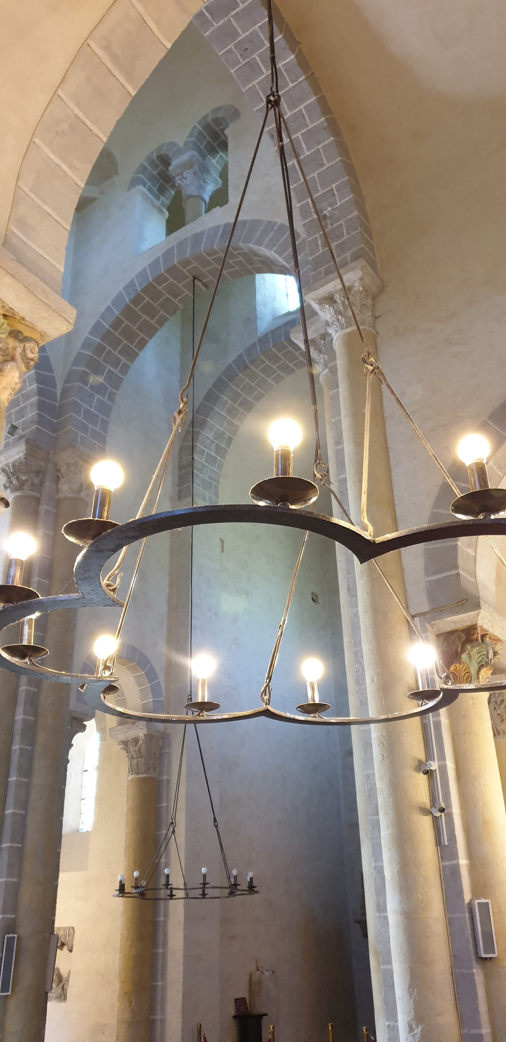 Superbe édifice roman contrastant une pierre sombre à l'extérieur avec des tons clairs à l'intérieur. Les chapiteaux des piliers sont superbes également, présentant des polychromies encore bien visibles