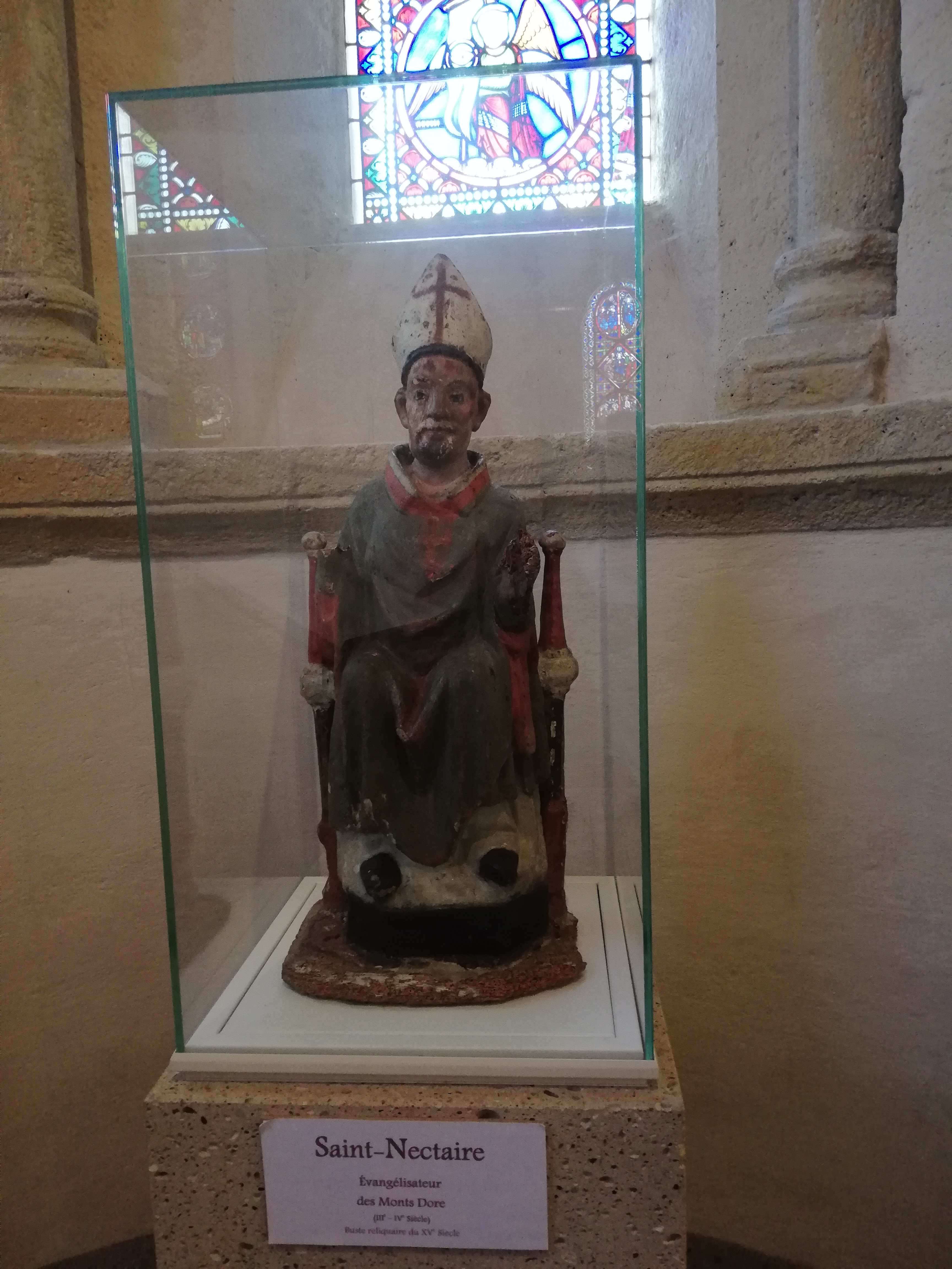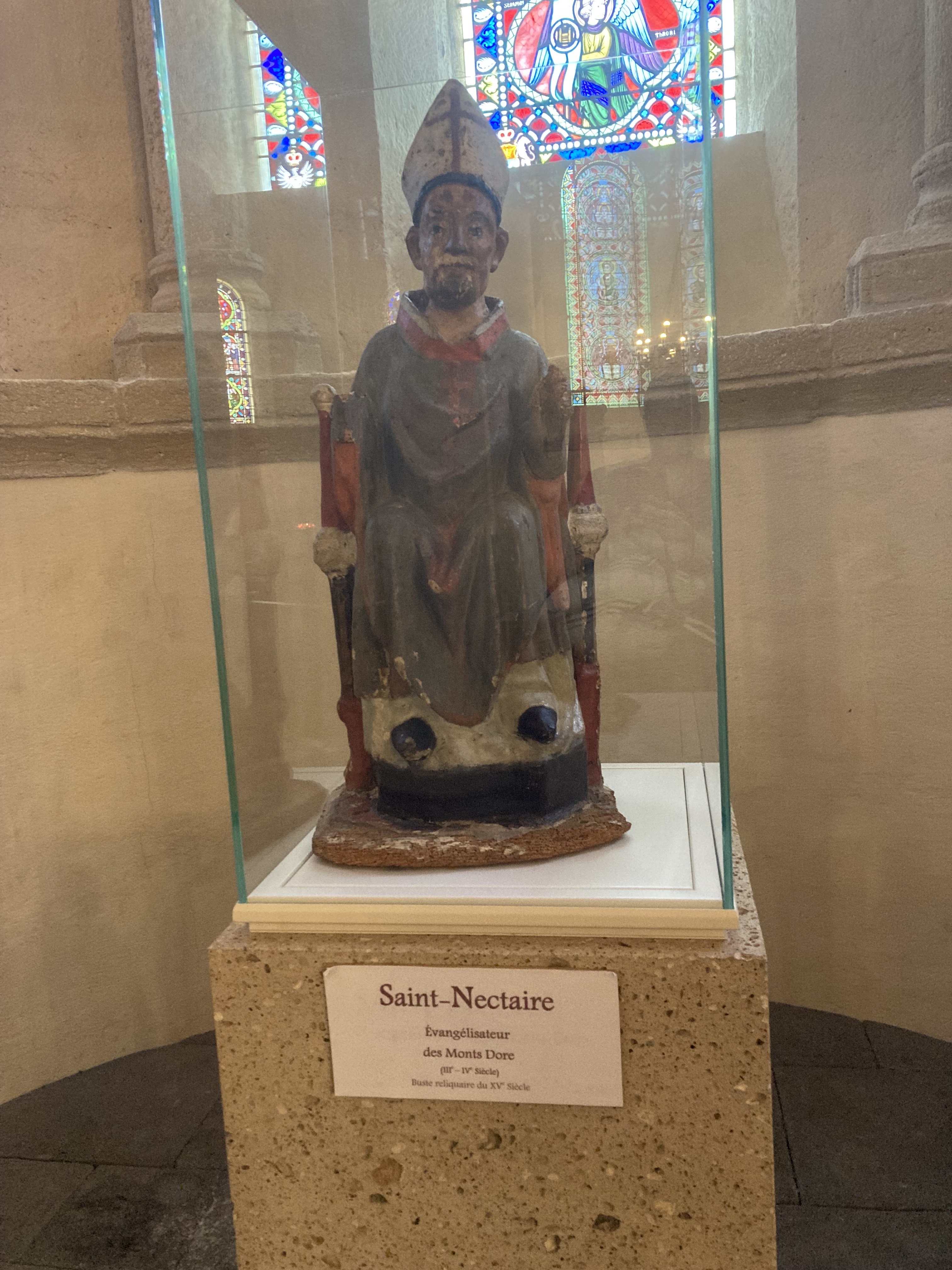 Si vous visitez cette église dédiée à Saint Nectaire, il est important d' être bien documenté ou mieux encore d' être accompagné par une guide conférencière, comme ce fut le cas pour nous. Car édifice possède des éléments architecturaux et de décorations explications. ( ex les chapiteaux, vitrail sur l'origine du nom de la ville) Passionnant.