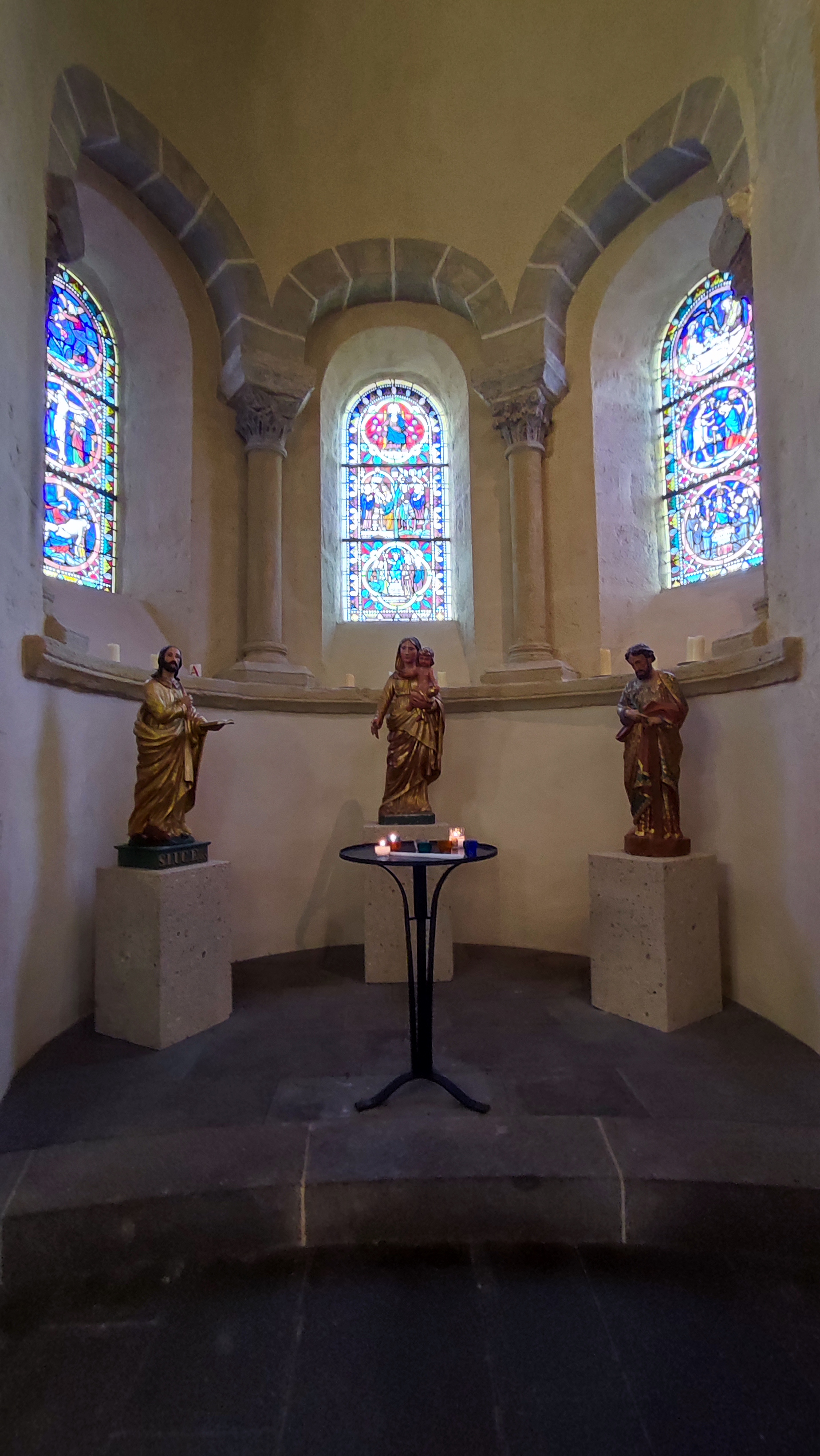 Très belle église de style roman auvergnat. Magnifiques chapeaux polychromes et statue de saint en cuivre doré finement sculptée…