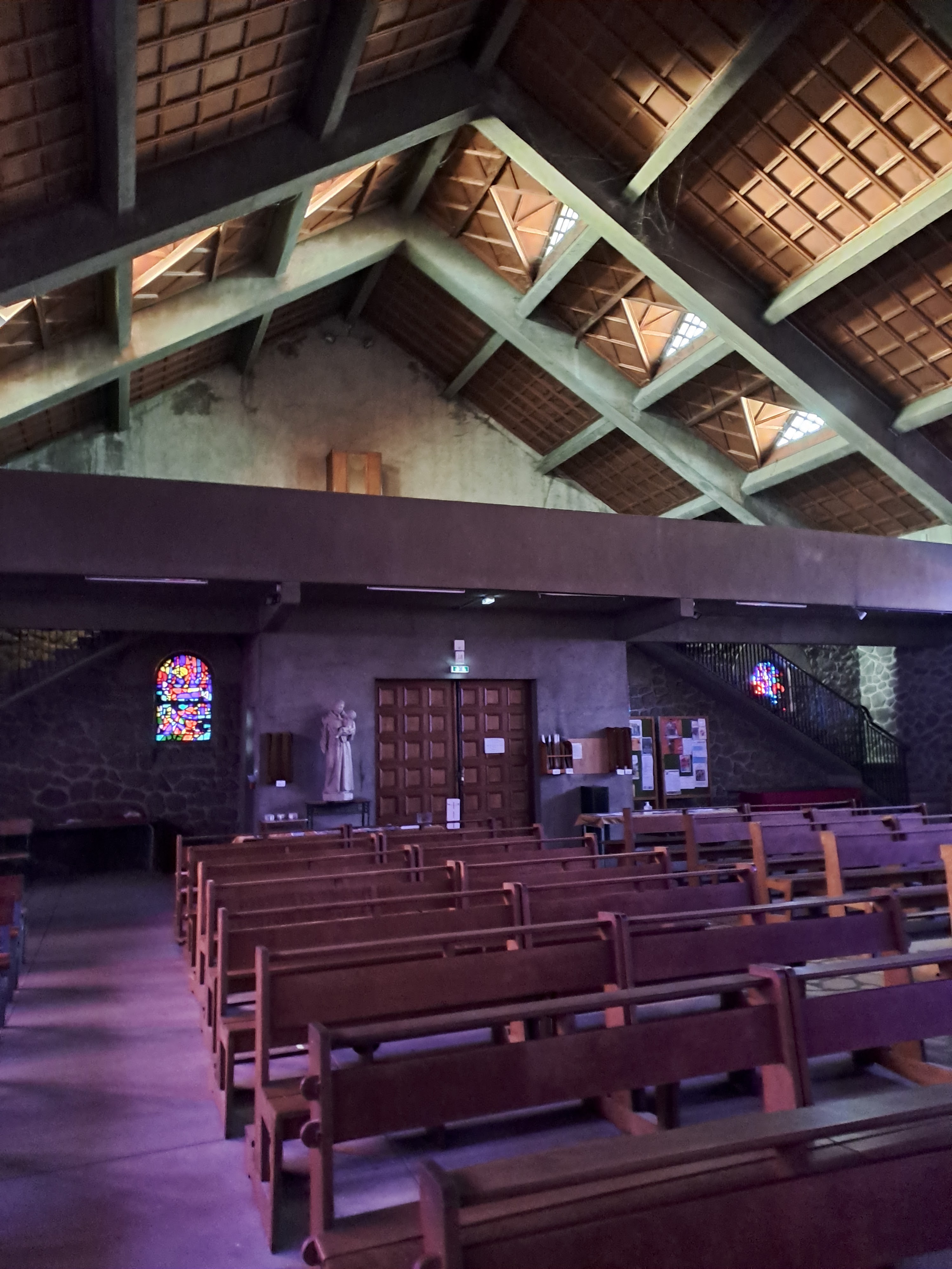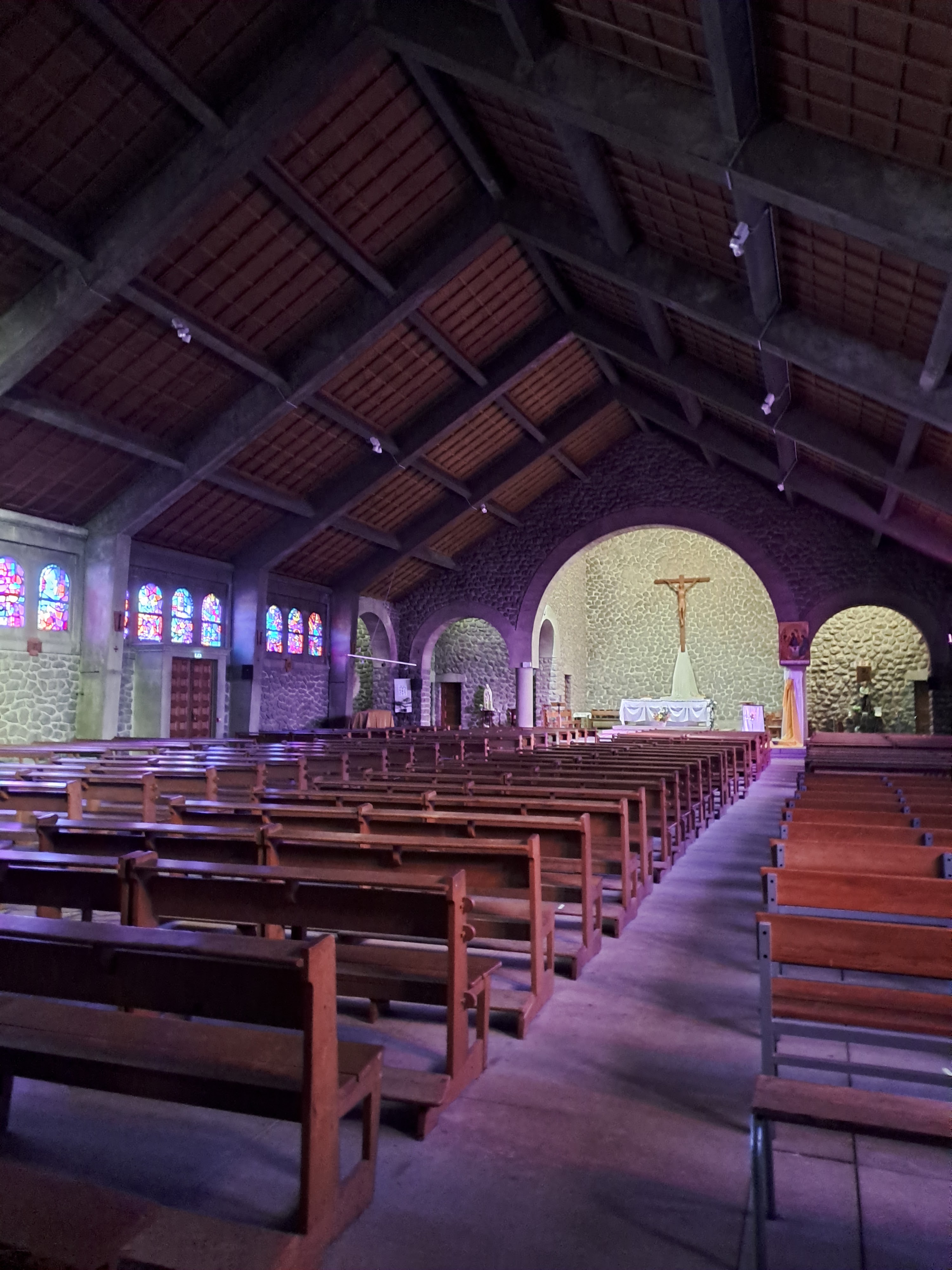 Eglise à l'architecture très sobre ,les vitraux basiques ,très colorés participent à l'invitation à la contemplation.