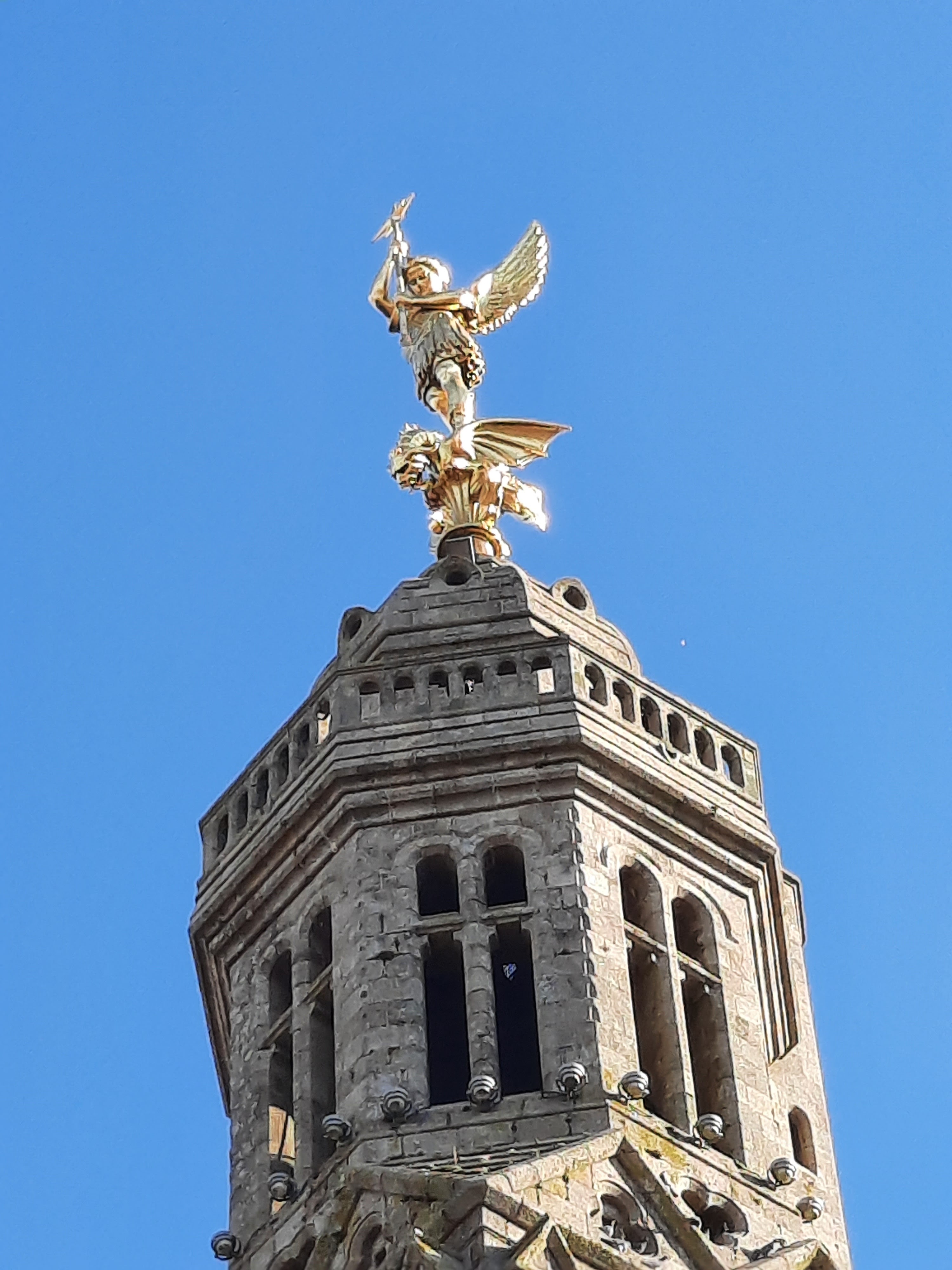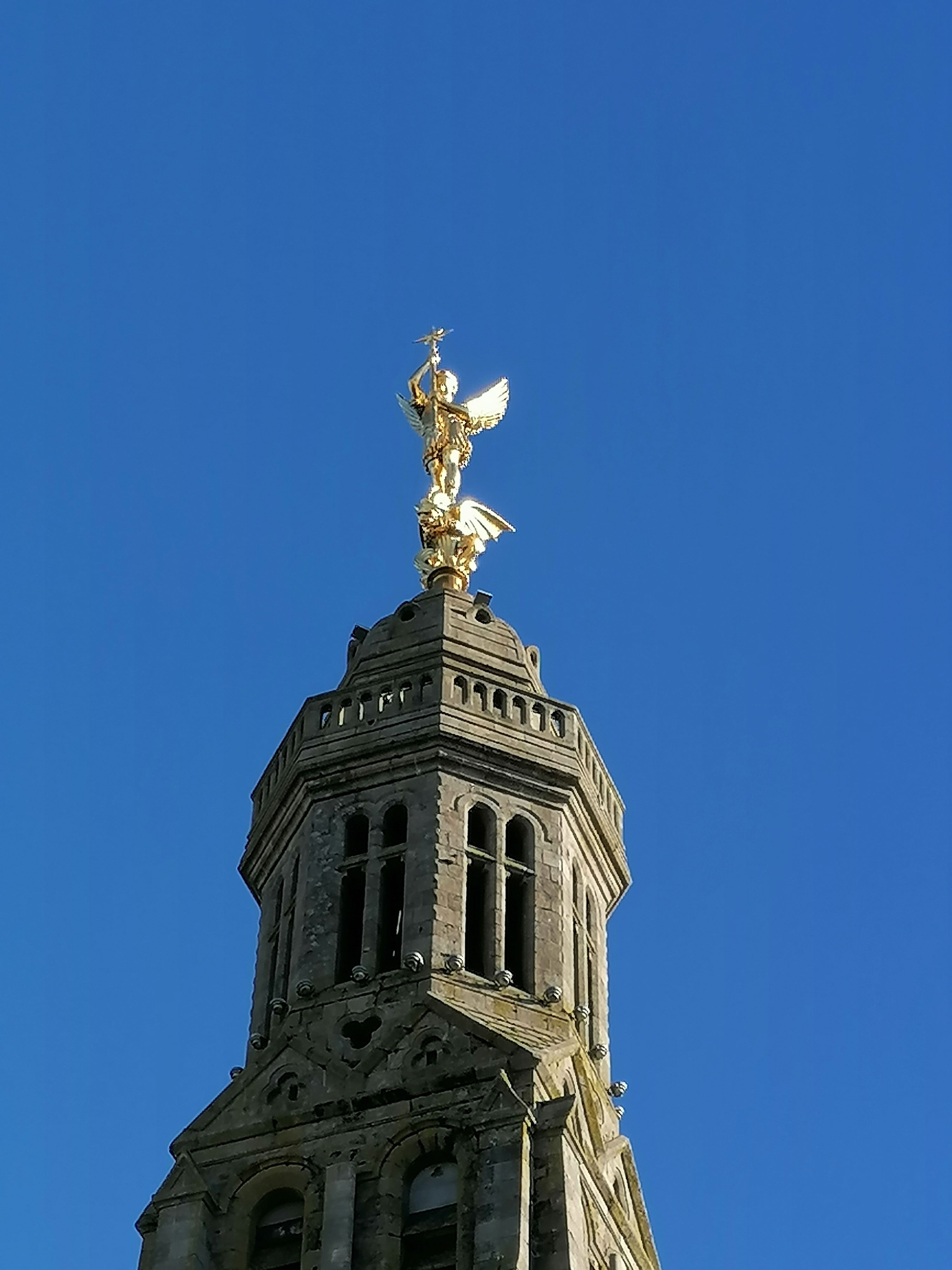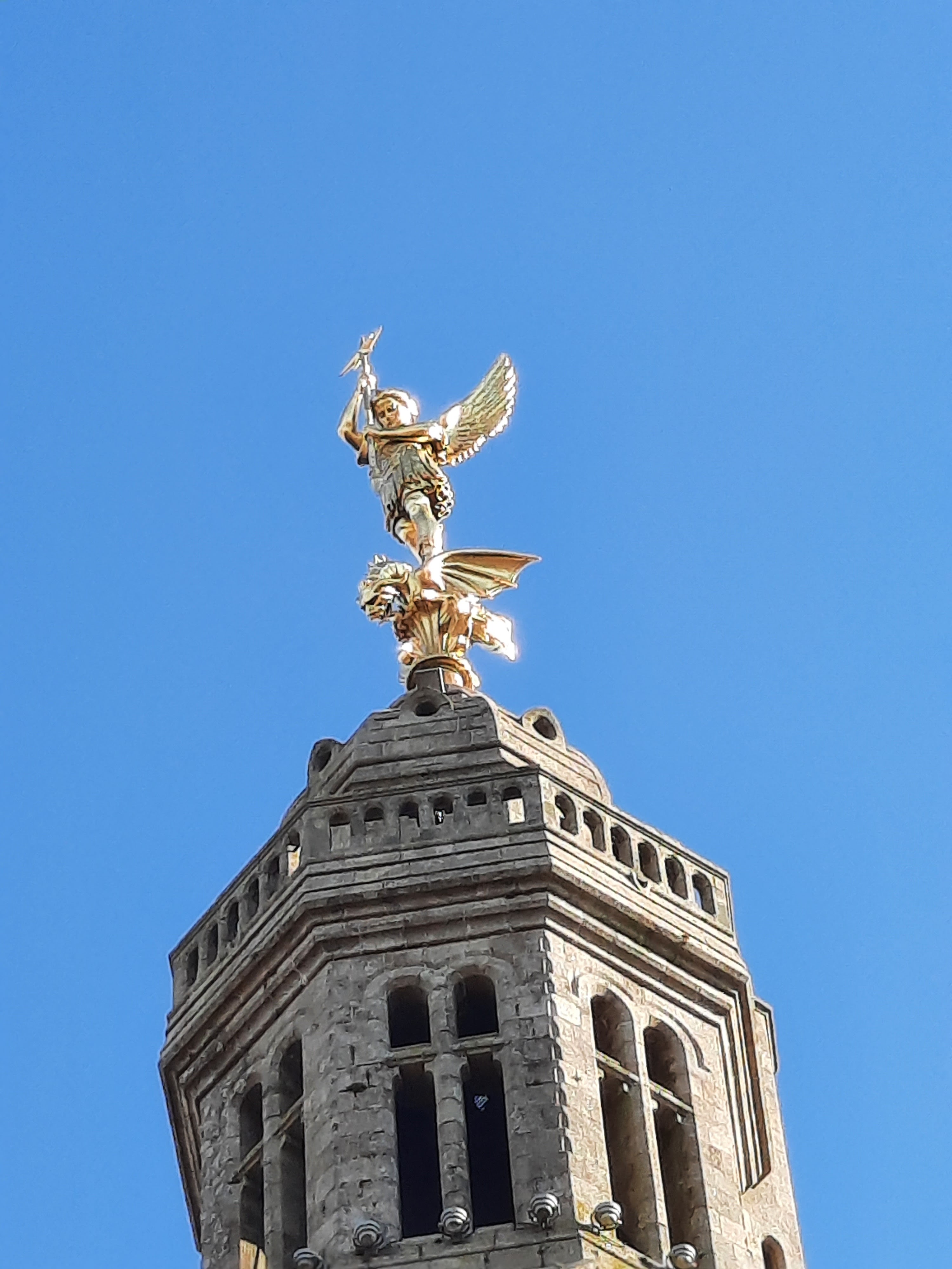 Le clocher surmonté par la statue dorée de Saint Michel terrassant le dragon vaut le coup d’oeil. On peut monter au clocher pour la vue .