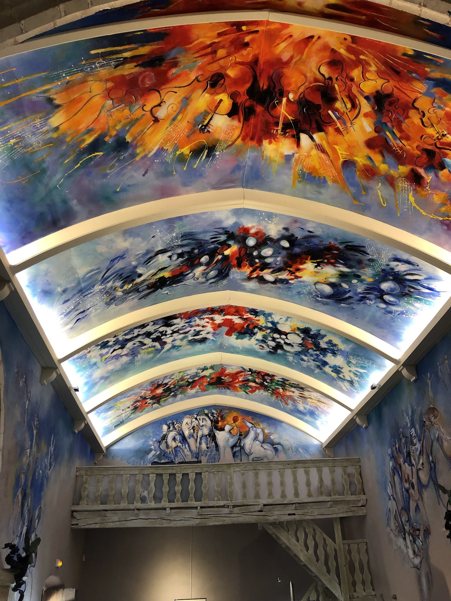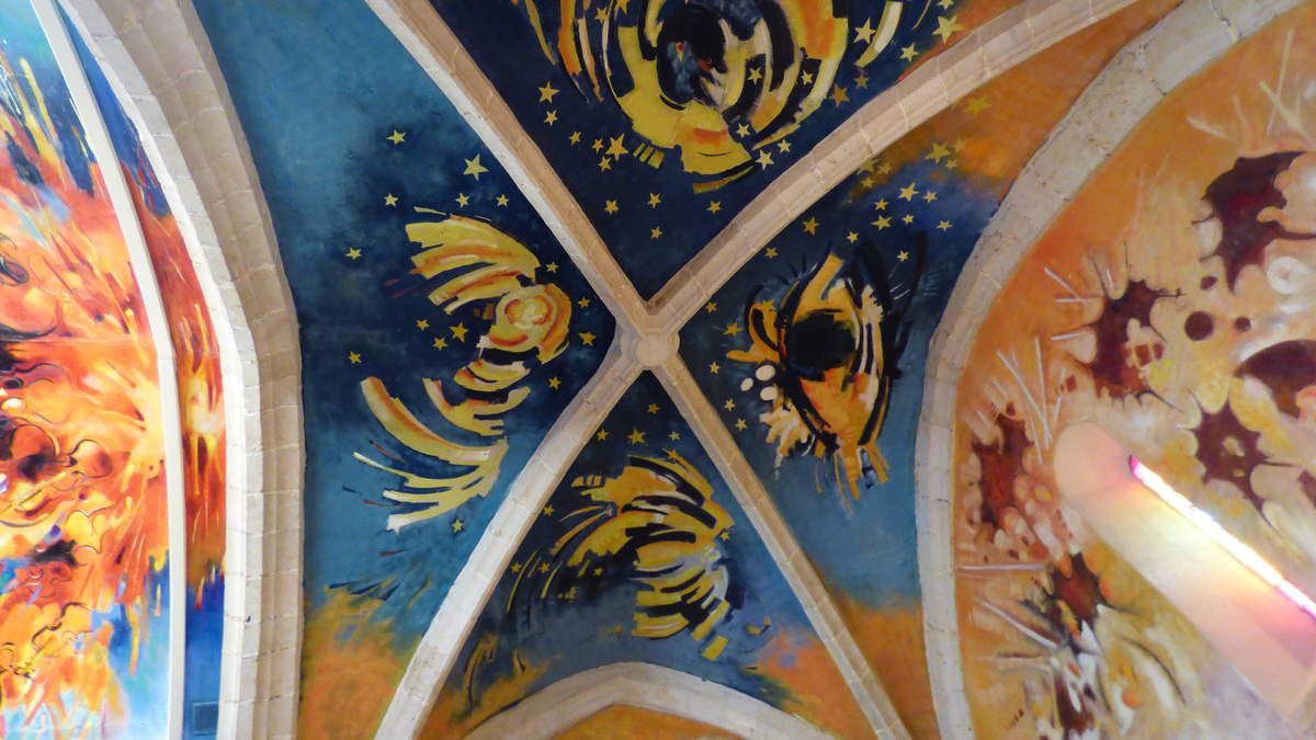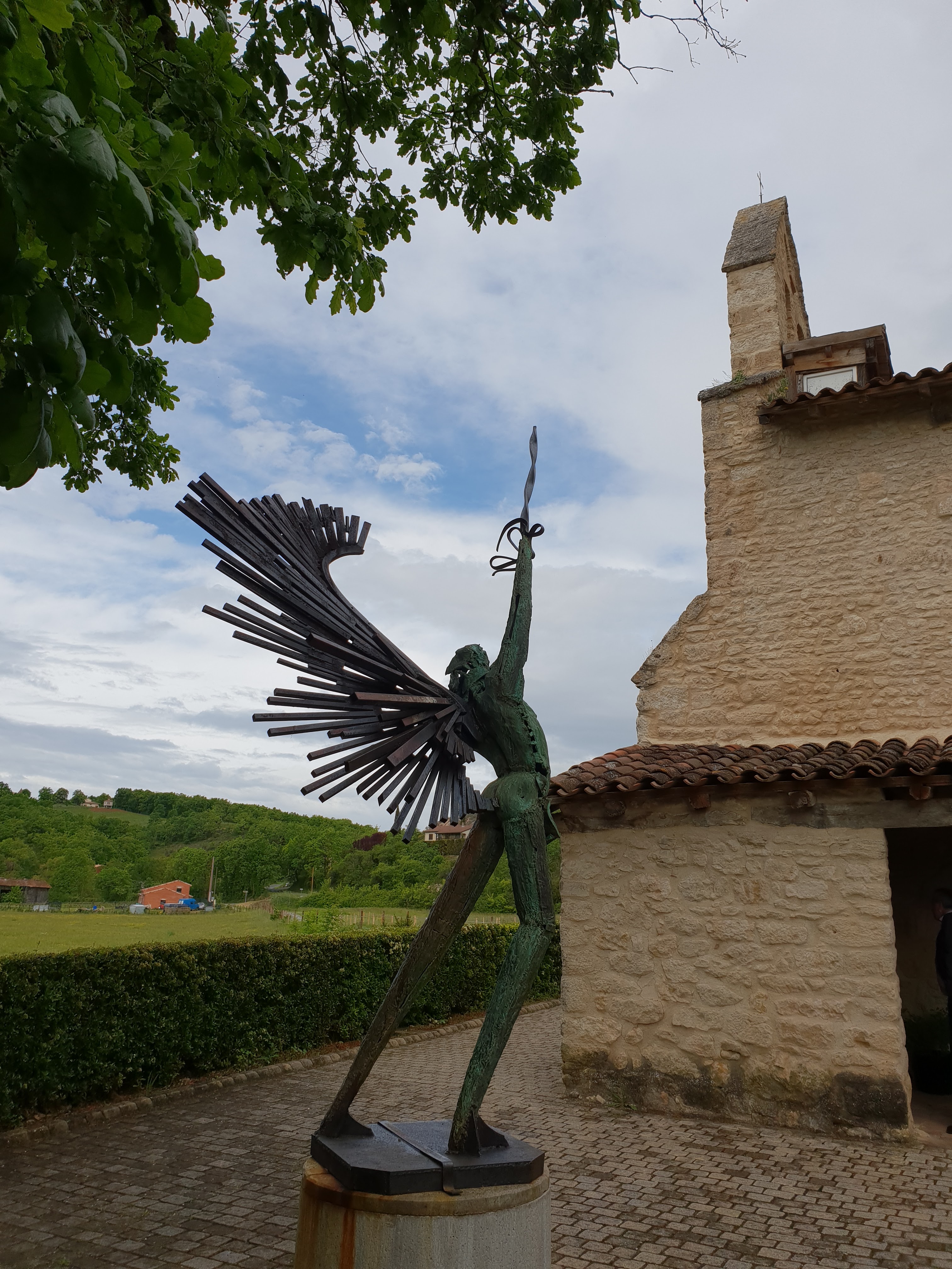 Sur la route de nos v Gaillac, acances, entre Albi et Gaillac je remarque un panneau avec un monument à visiter. Nous rentrons dans cette église et un Whaouh de surprise en entrant. C'est en fait, une église desacealisée et pleine de peintures murales modernes. Les voûtes représentent les quatre éléments, le feu, l'eau l'air et la terre. Magnifique. Dehors nous attendait une autre surprise, un jardin, décoré de sculptures aussi magiques que surprenantes. À voir