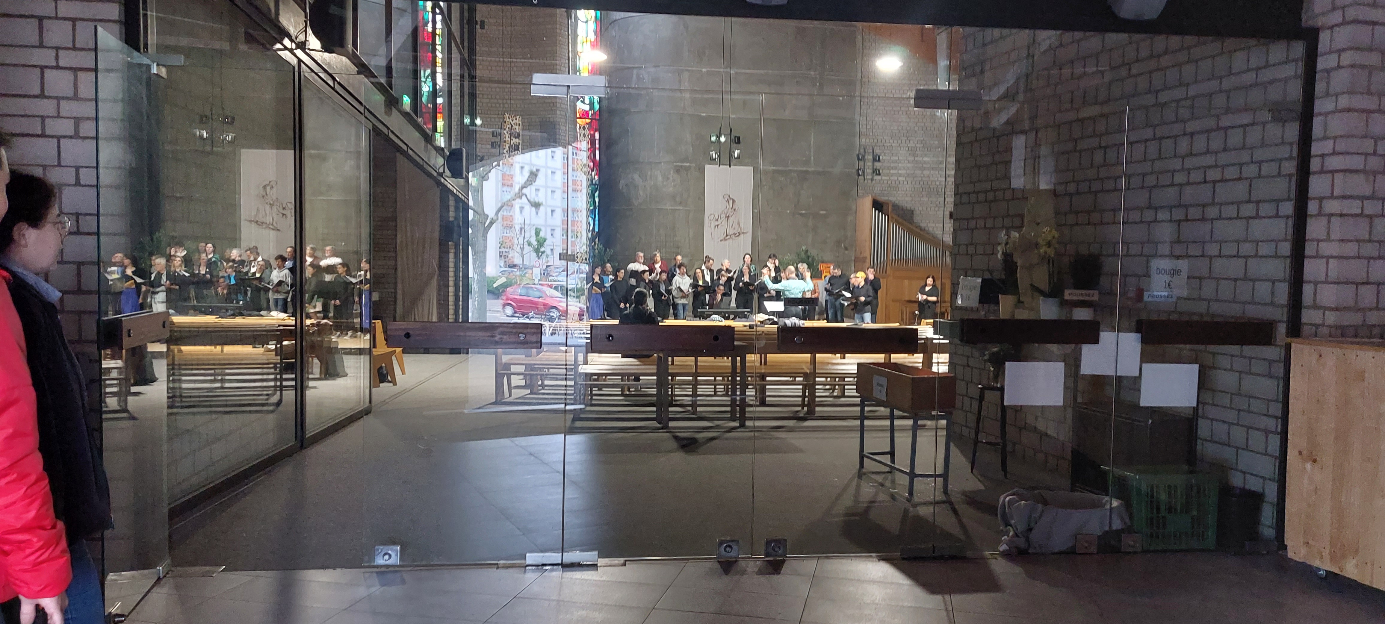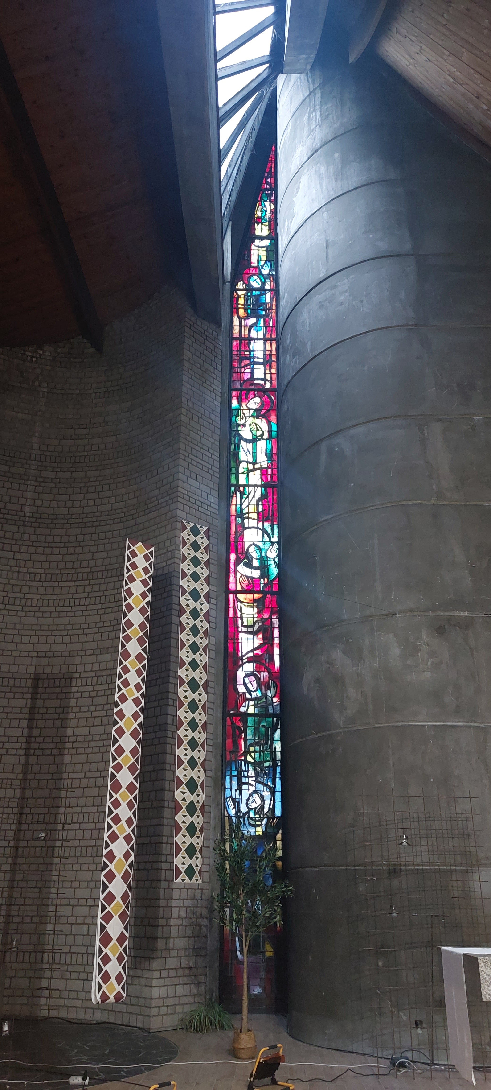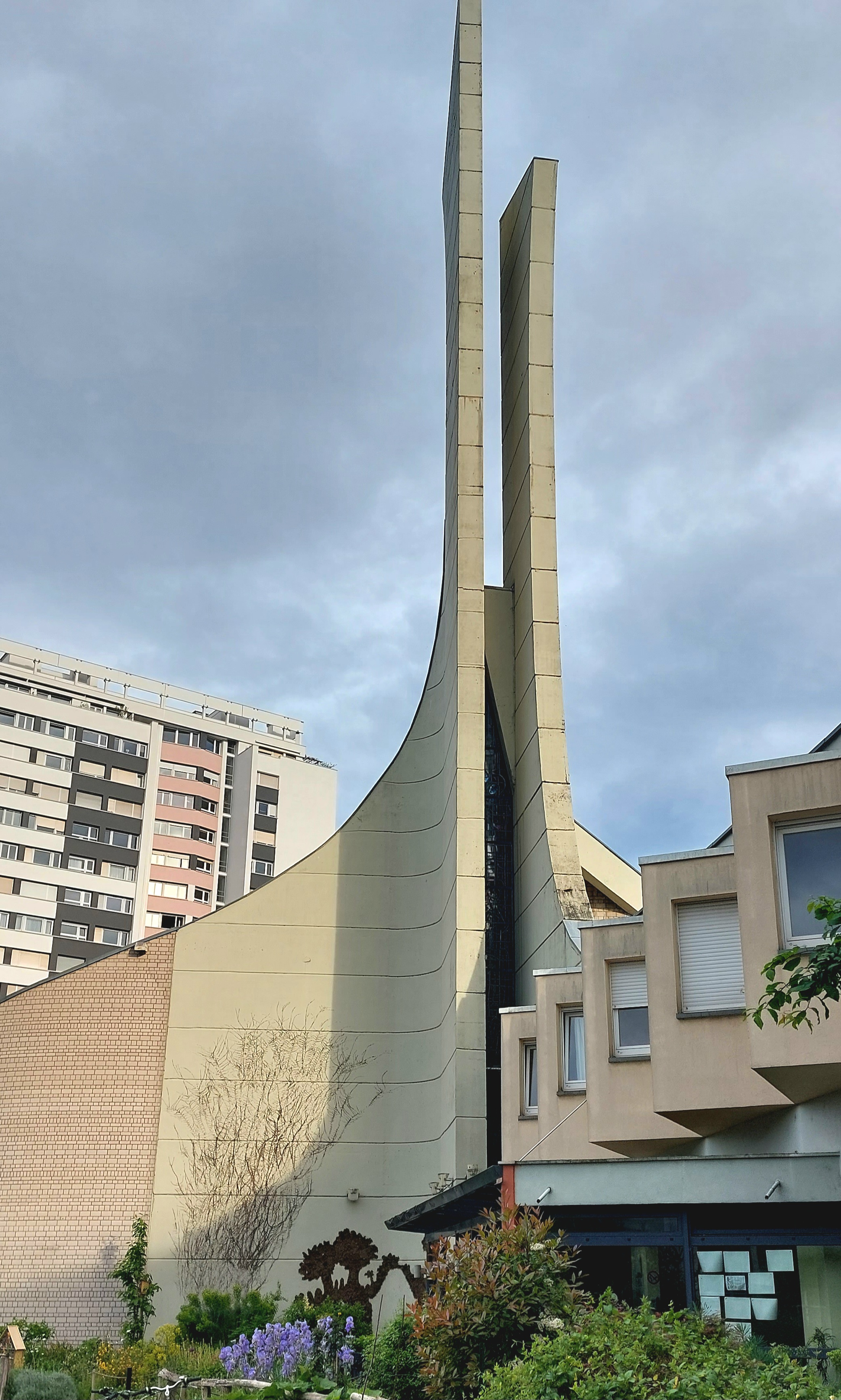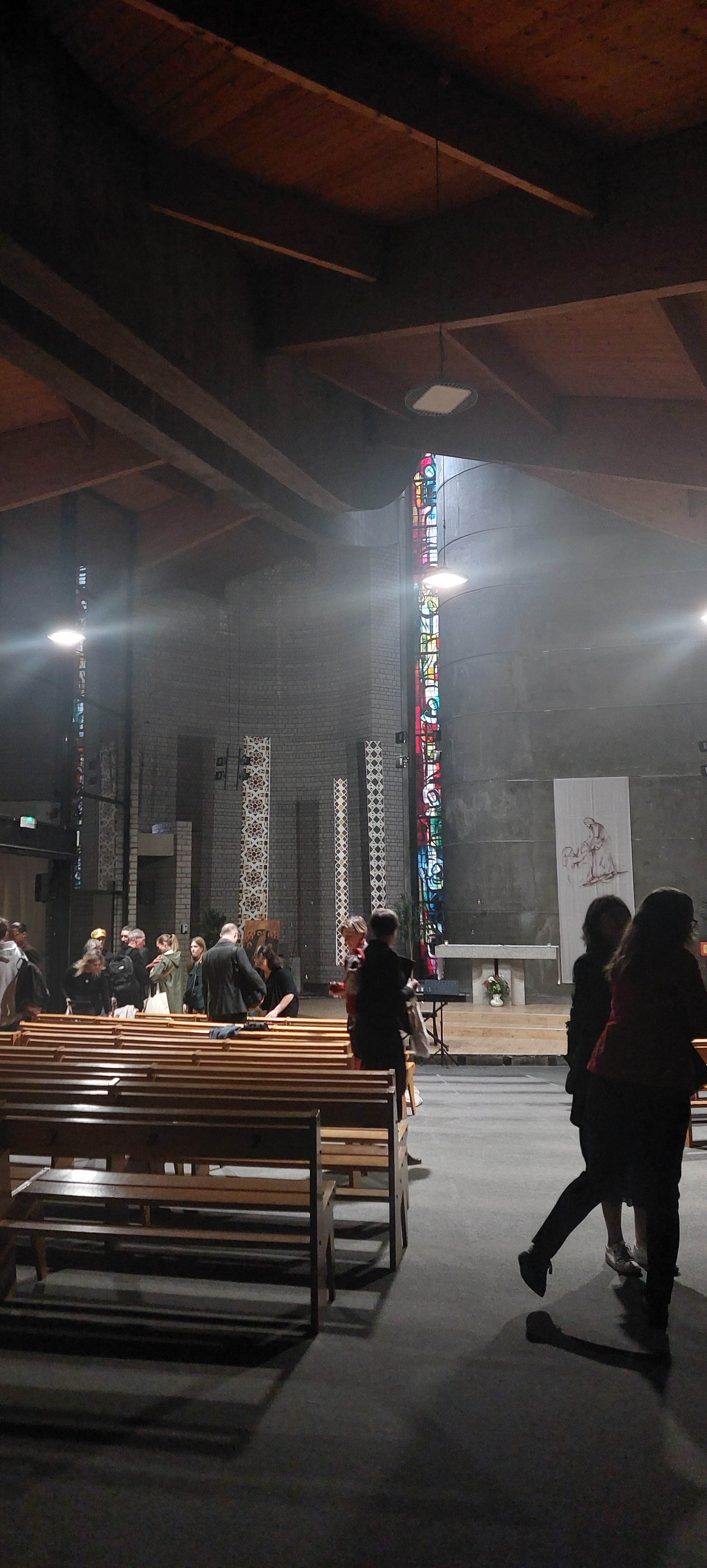 Cette église est conçue de façon différente. Point de transept, de décorations somptueuses... Un espace simple entre béton et œuvres d'art depuis les années 70 (?) un lieu propice au recueillement. La célébration y fût belle, profitant d'un chœur bien visible et d'une belle acoustique. L'une des grandes richesses du lieu est l'aumônerie étudiante attenante. Notamment ses nombreuses propositions et particulièrement celles qui s'inscrivent dans le catholicisme social comme l'accueil de migrants mineurs.