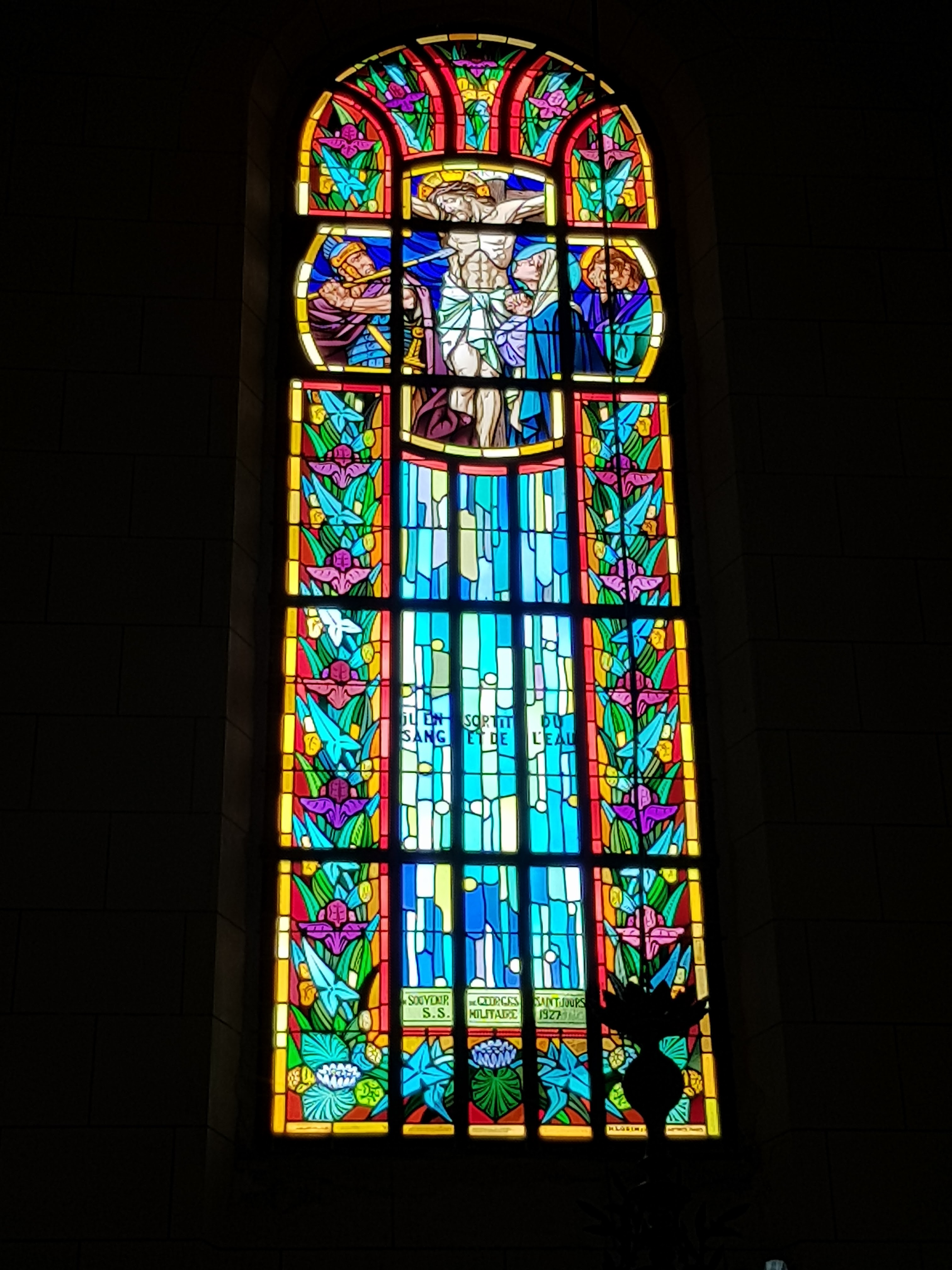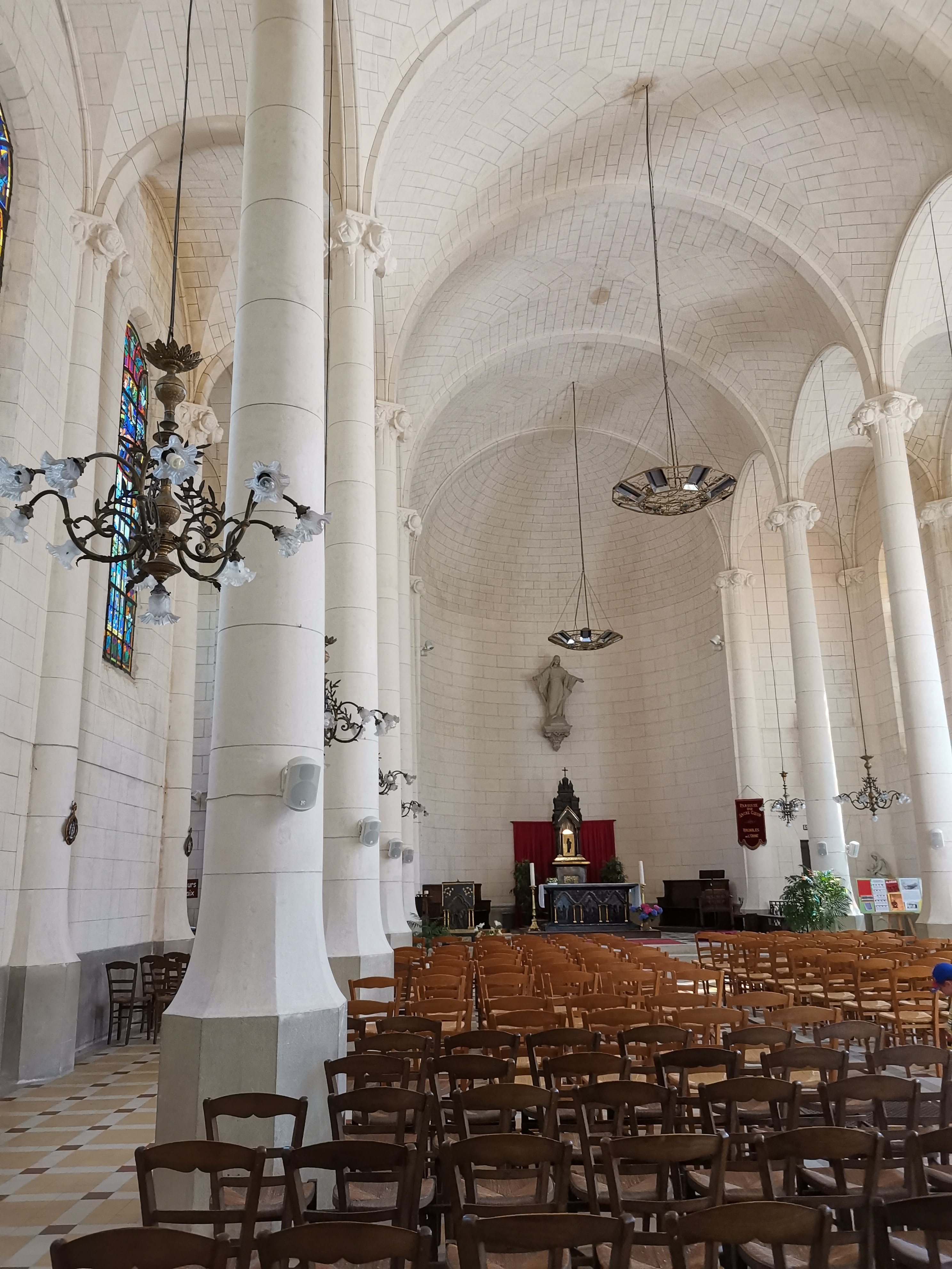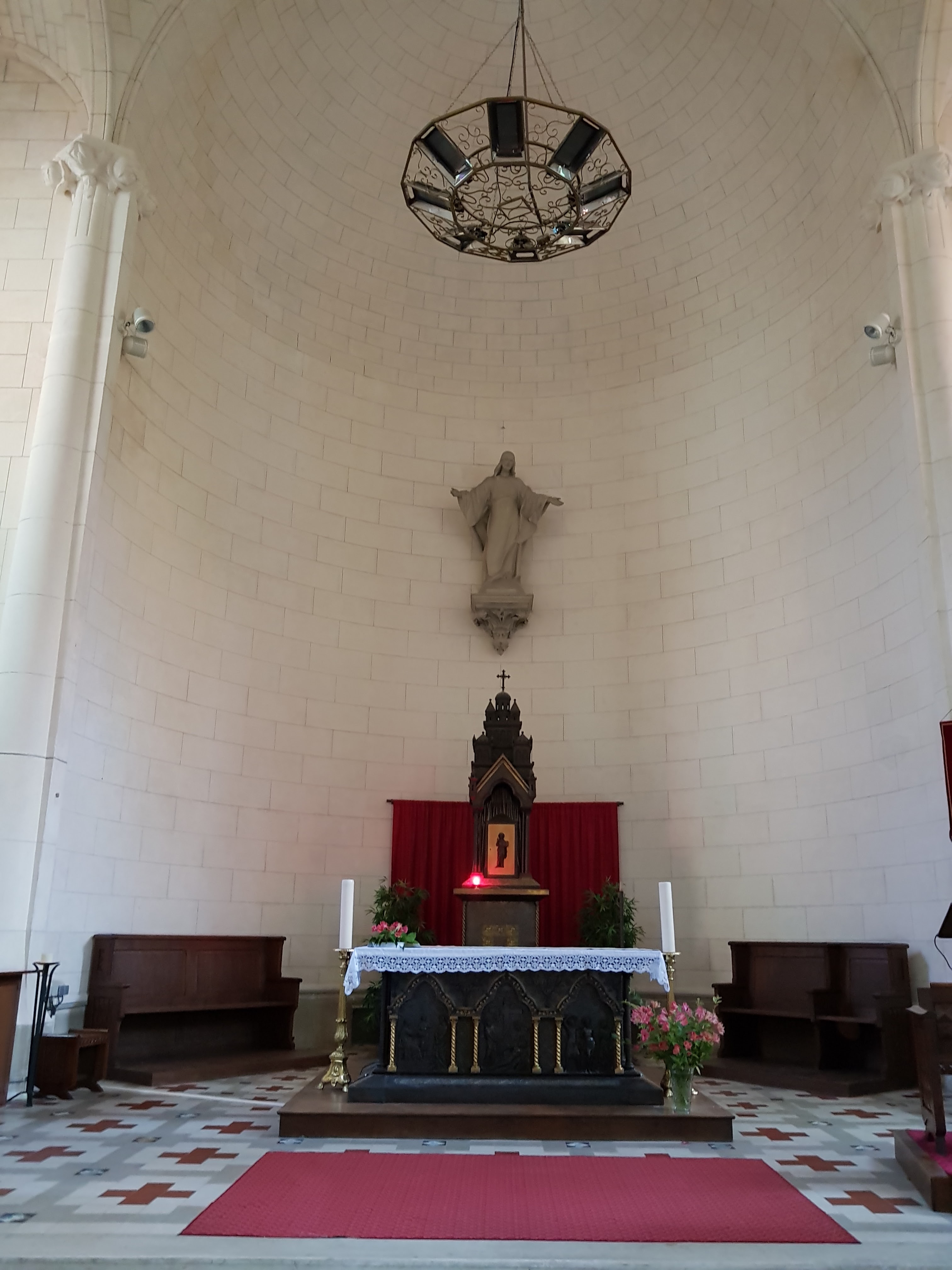 Très belle église art deco. Style assez dépouillé avec de beaux luminaires Un Christ ressuscité sur le mur derrière l’autel