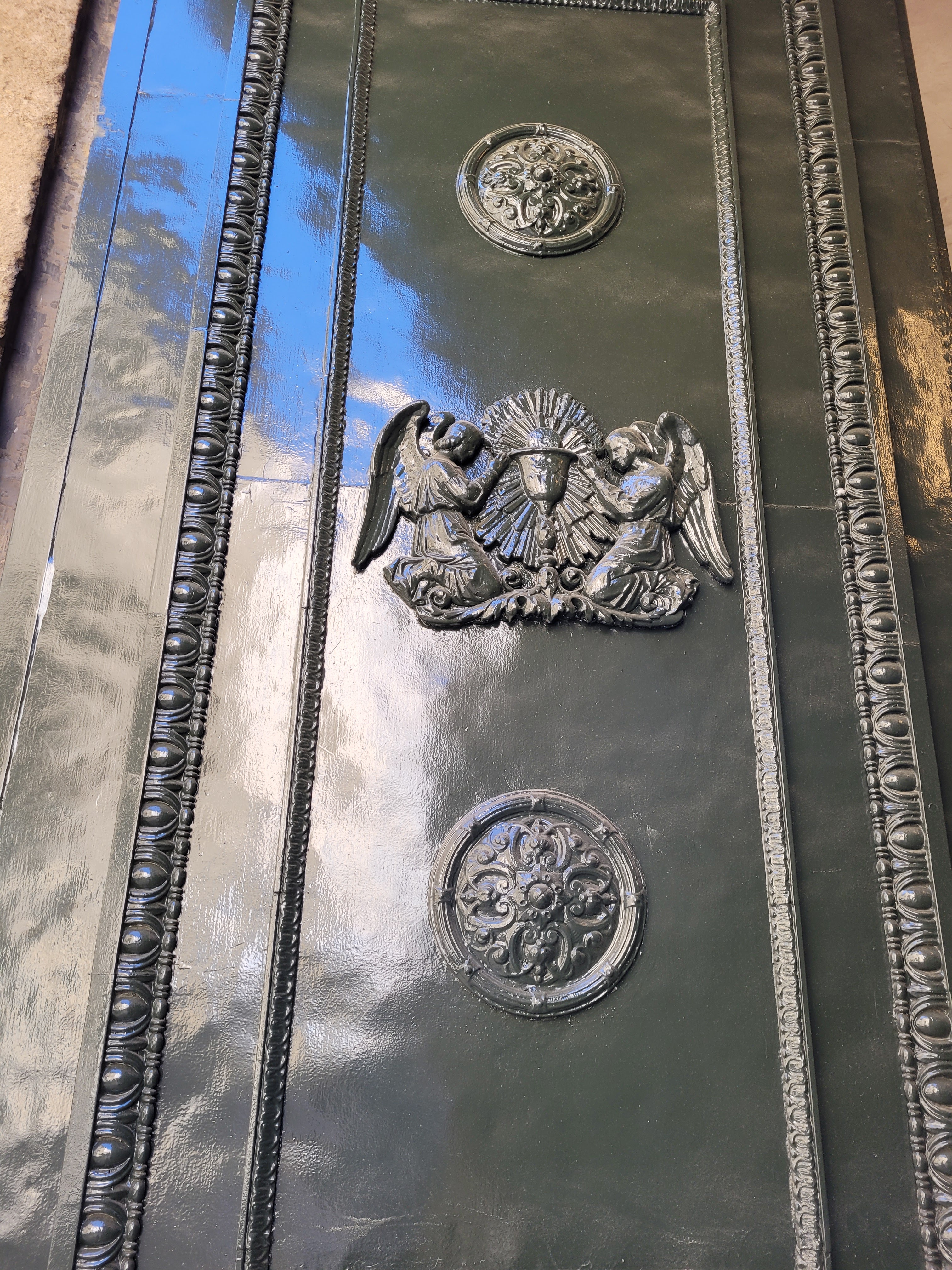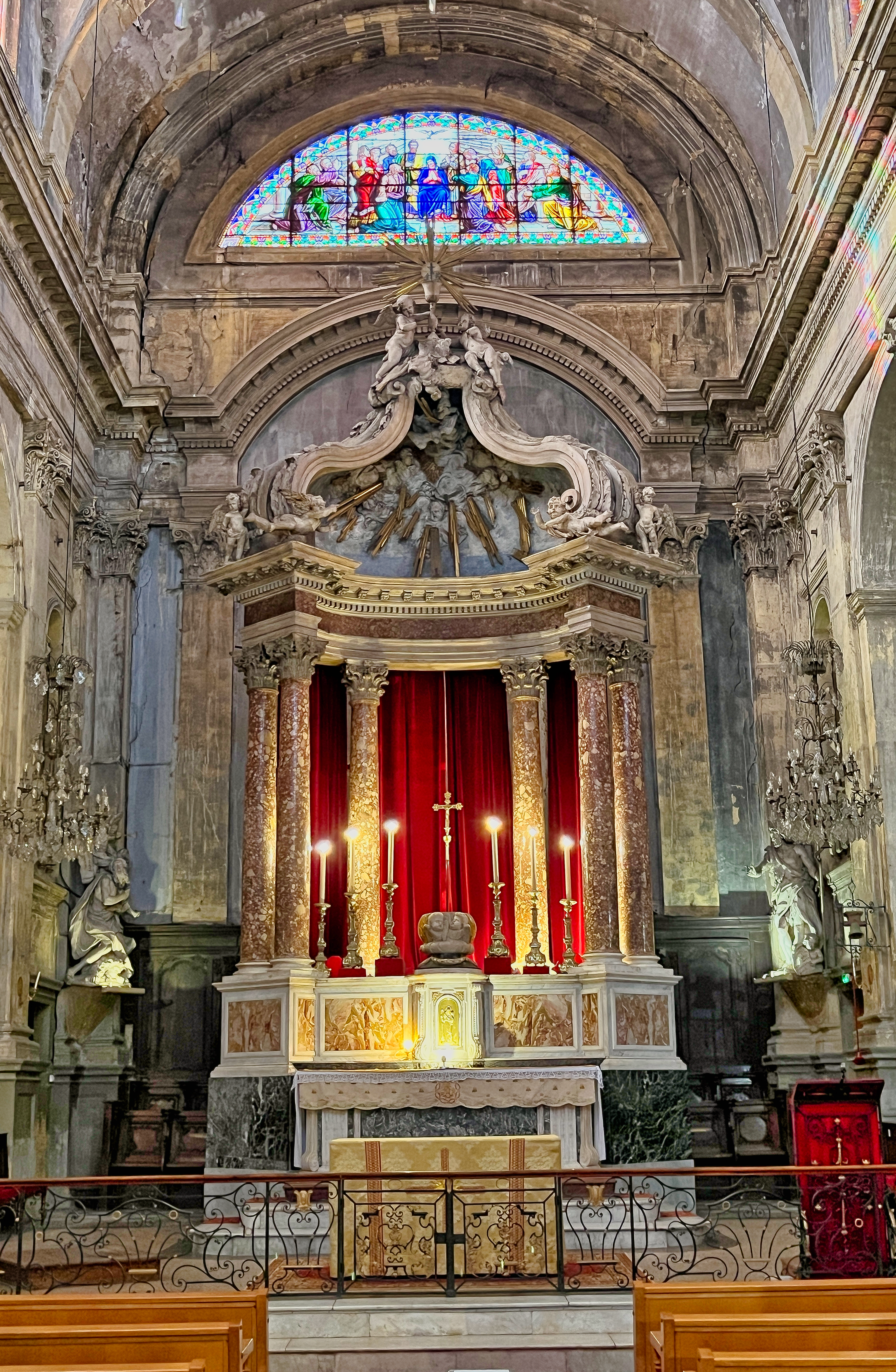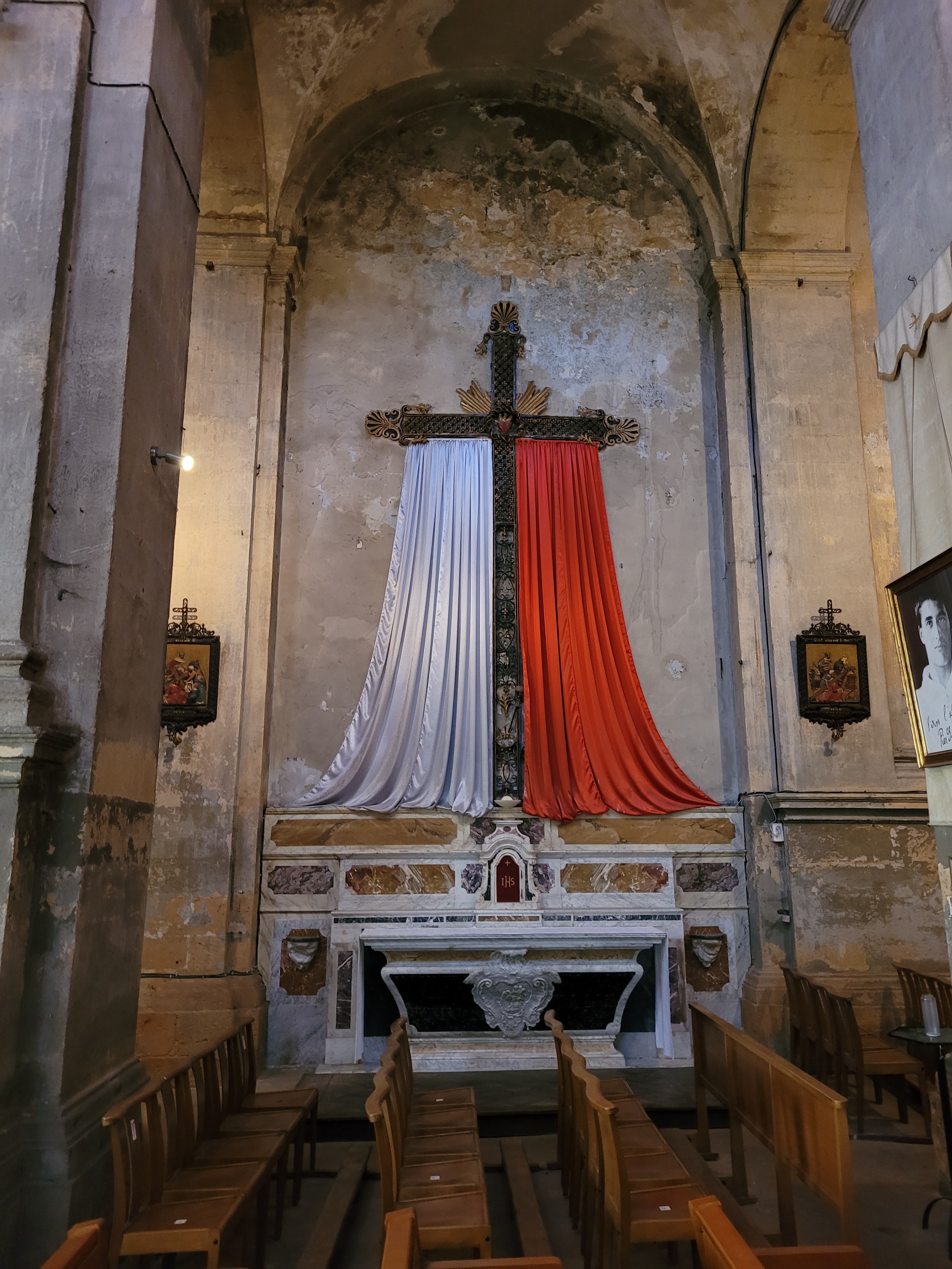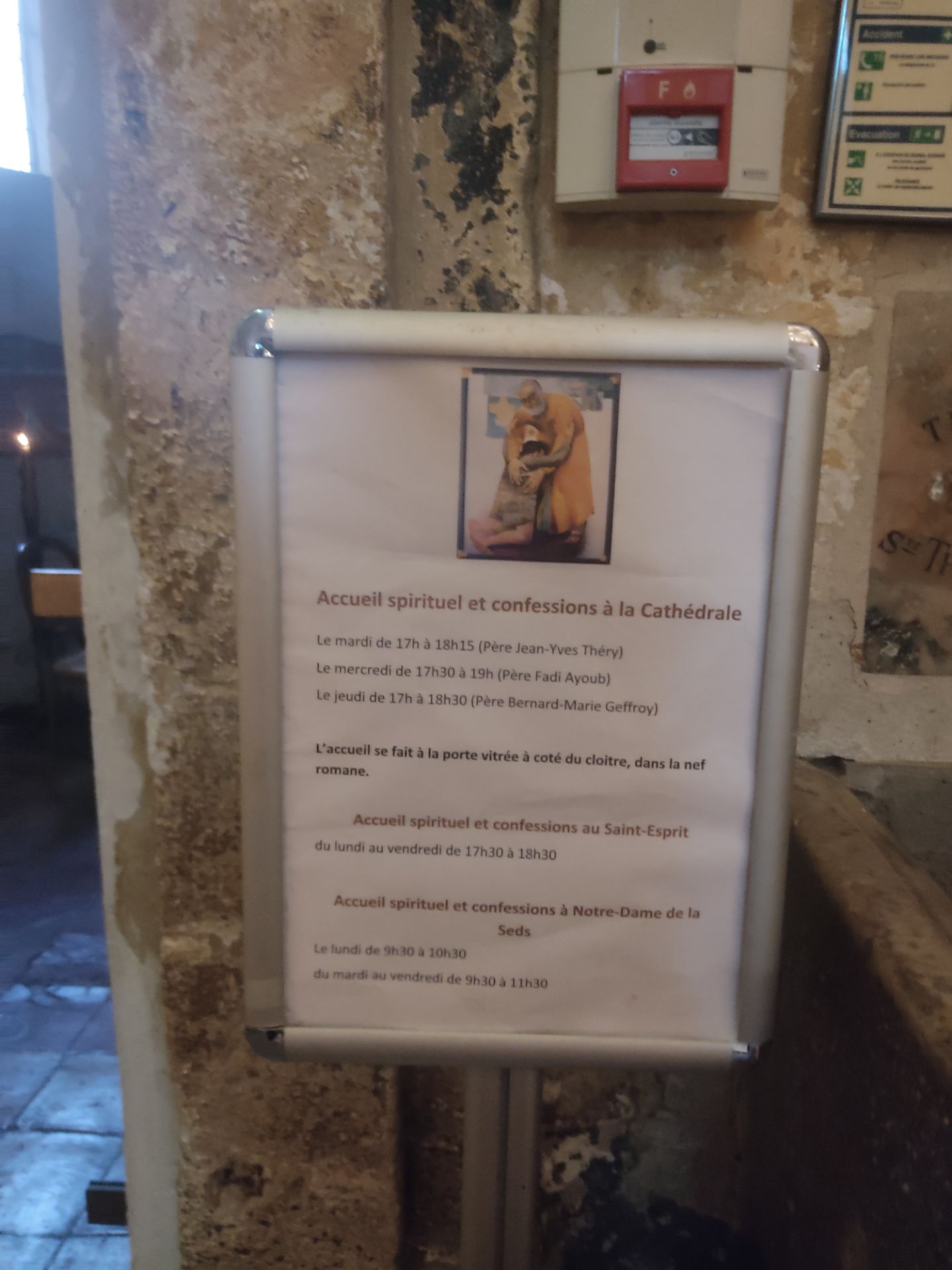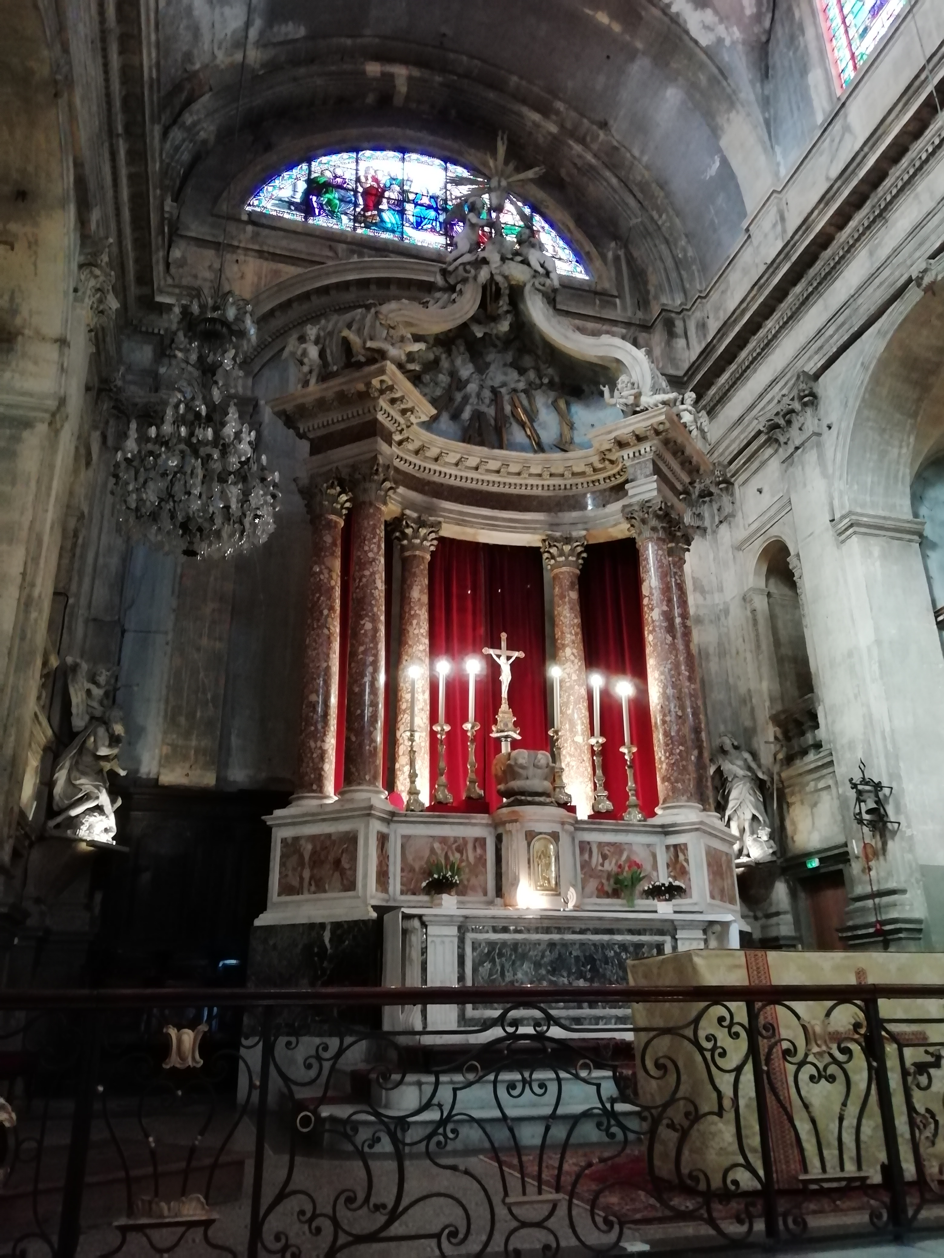 Pacifique. Des panneaux bloquaient de manière appropriée l’accès à l’autel. Une église en activité au coeur d'Aix ! Belle sculpture sur les socles des colonnes