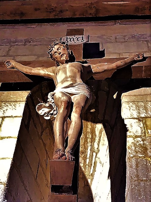Une église sans clocher et sans croix, une église fortement fortifiée. Elle a traversé trois conflits et y a survécu : la guerre de cent ans, les guerres de religions, et la fronde qui vit s'opposer vers 1652-1653 les villes de Sarlat à celles de périgueux et Bergerac. le chevet est orientée au Nord-Est et le portail au Sud-Ouest pour des nécessités stratégiques. Les fines ouvertures sur les murs de la nef sont placées très haut, empêchant l'introduction d'assaillants. A l'intérieur, ces ouvertures sont évasées, ce sont des meurtrières. Loin des sentiers battus et des sites touristiques promotionnés, cet édifice est étonnant, tant les moyens de défenses ont été développés par une architecture originale. Le chevet et le portail, sont tous les deux surmontés de salles de garde avec machicoulis, tour de veille etc.. La nef est à trois vaisseaux, sombre et austère comme l'ensemble de l'église. Elle n'a jamais été voûtée, sa charpente apparente est en fait un plancher, qui porte dans les combles une immense salle. Cette dernière pouvait accueillir les paroissiens en cas d'attaque. Les escaliers sont cachés dans les murs.