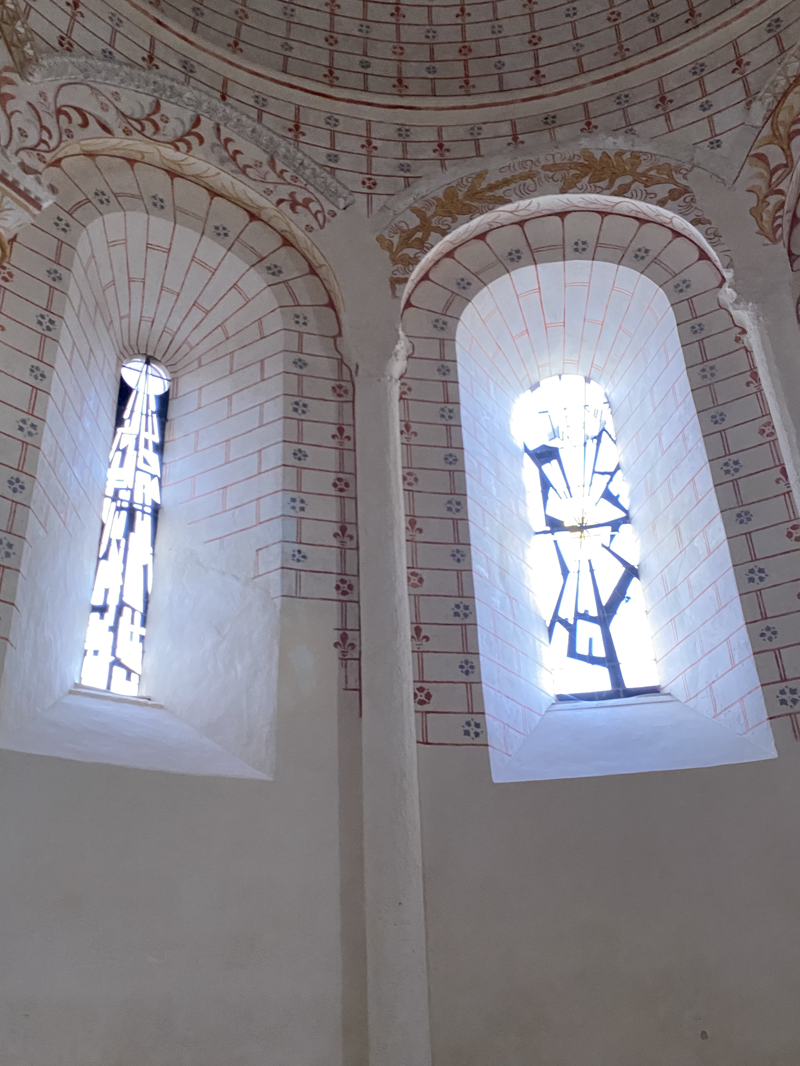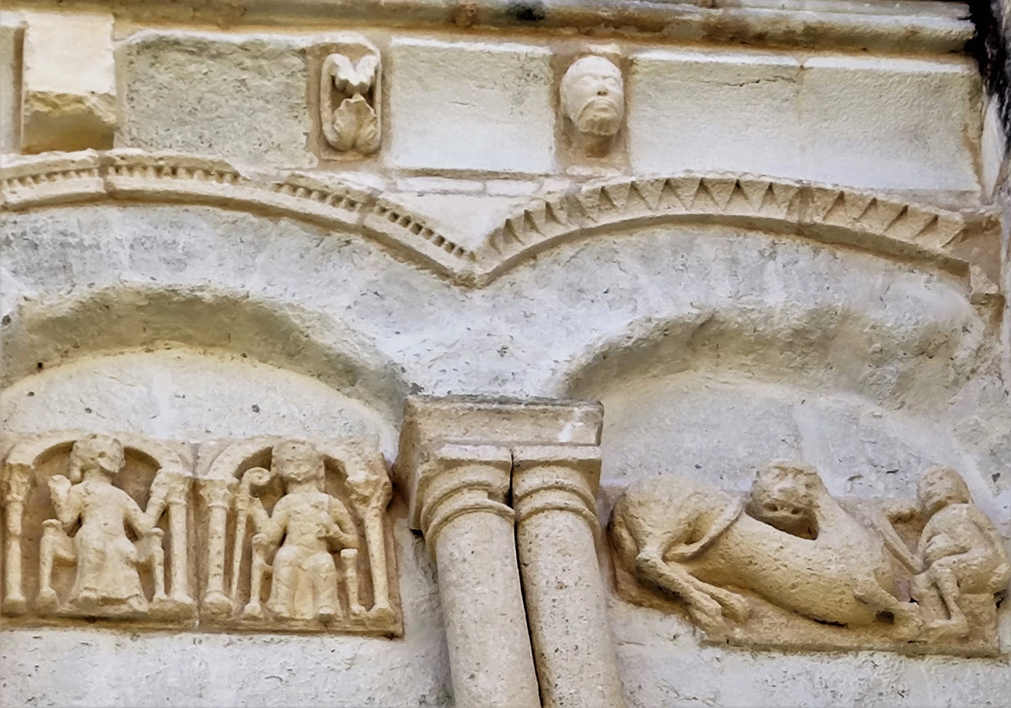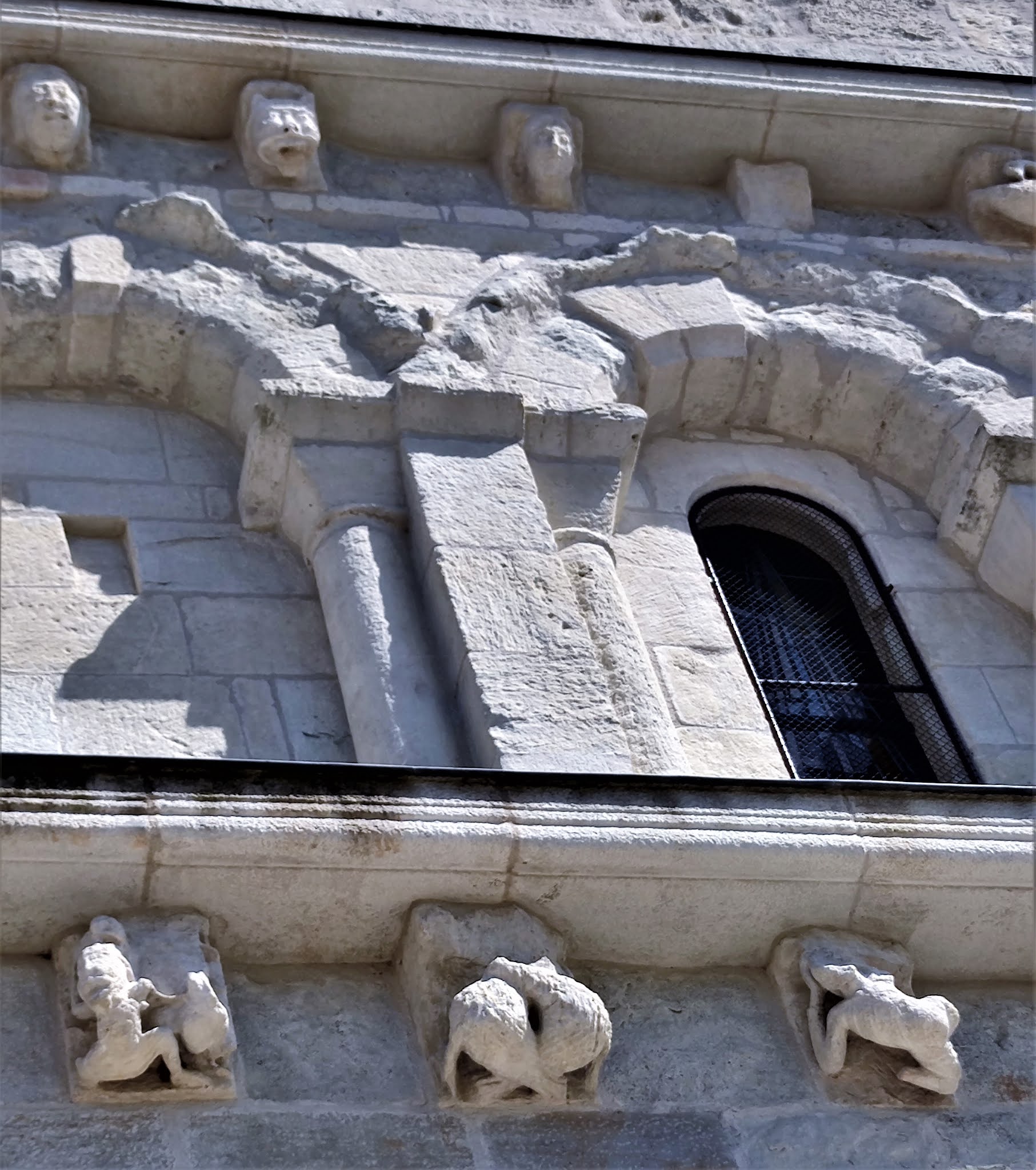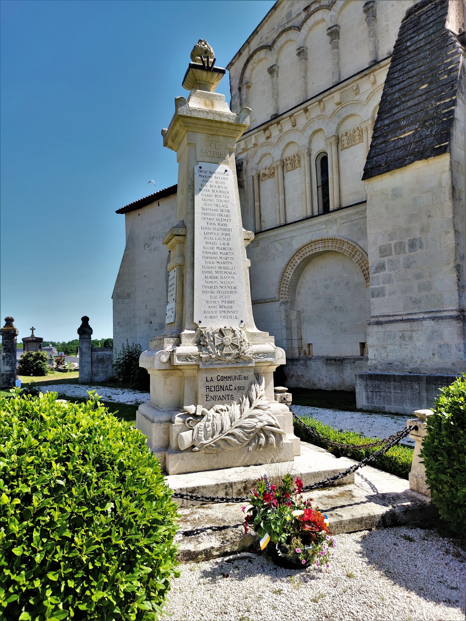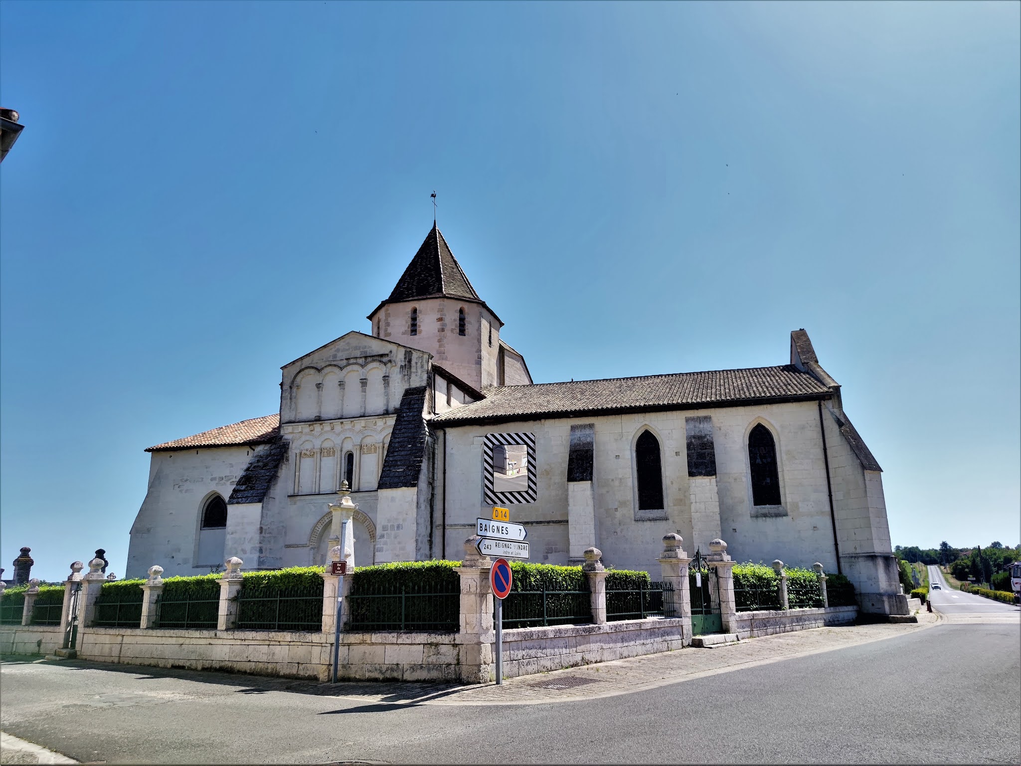Fermée aujourd'hui à la visite, des chantiers sont en cours, c'est plusieurs campagnes de restaurations qui se sont succédées depuis 7 ans. Cet édifice réhabilité à l'extérieur et à l'intérieur a retrouvé tout son éclat et sa prestance. L'église sera bientôt réouverte au public, je ne manquerai pas de faire une nouvelle visite. Cette église Saint-Pierre à Reignac, édifice roman du 12ème siècle fut construite en période d'expansion économique de la région et de développement des pouvoirs seigneuriaux ; période féodale qui donne lieu à des combats incessants entre ces seigneurs et les Ducs, Comtes, Rois de France ou d'Angleterre, qui cherche à limiter leurs prérogatives. De cette période tourmentée, naquit au 14ème siècle la guerre de cent ans. Les églises de la région furent souvent fortifiées, offrant un refuge à la population dans des salles aménagées dans les combles. Pour cela, on éleva les murs au dessus des voûtes, murs percés de meurtrières permettant de tirer à l'arc sur les attaquants. Le chevet de l'église Saint-Pierre fut alors équipé d'un chemin de ronde permettant une surveillance des environs. Ce chemin de ronde, bordé de créneaux et de merlons percés d' archères, renforçait également le système défensif. Au début du 16ème siècle, on construisit des chapelles qui formaient, avec celles construites au 14ème, un collatéral. Les guerres de religions imposèrent de réaménager les systèmes défensifs en les adaptant au nouvel armement, ce qui n'empêchera pas de très sérieuses dégradations. A la révolution, elle deviendra temple décadaire puis sera abandonnée sans toiture. Menaçant ruine, elle fut restaurée tout au long du 19ème siècle. En 2021 c'est 7 ans de restaurations à l'extérieur et à l'intérieur qui vont se terminer, les visites seront à nouveau autorisées, il faut se renseigner à la mairie pour connaitre les dates de fin des chantiers. La vue des extérieurs est déjà riche de curiosités et de beautés, cette visite m'a bien plu, même si je n'ai pu entrer.