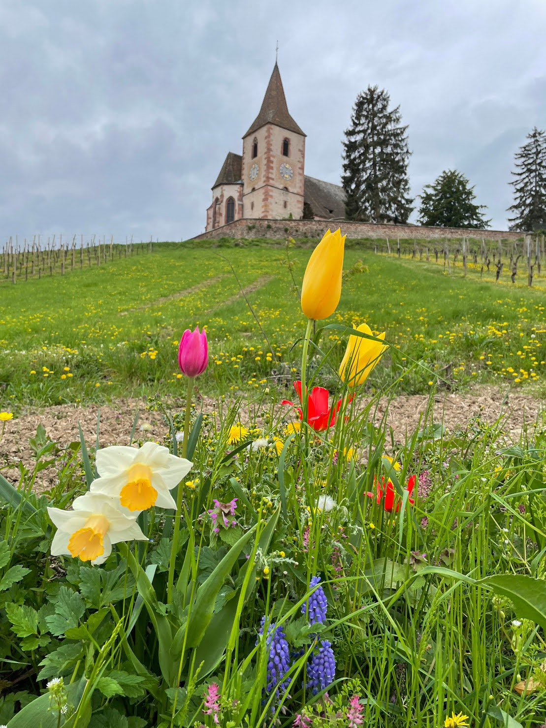Une église à la fois protestante et catholique, magnifiquement située au milieu des vignes.