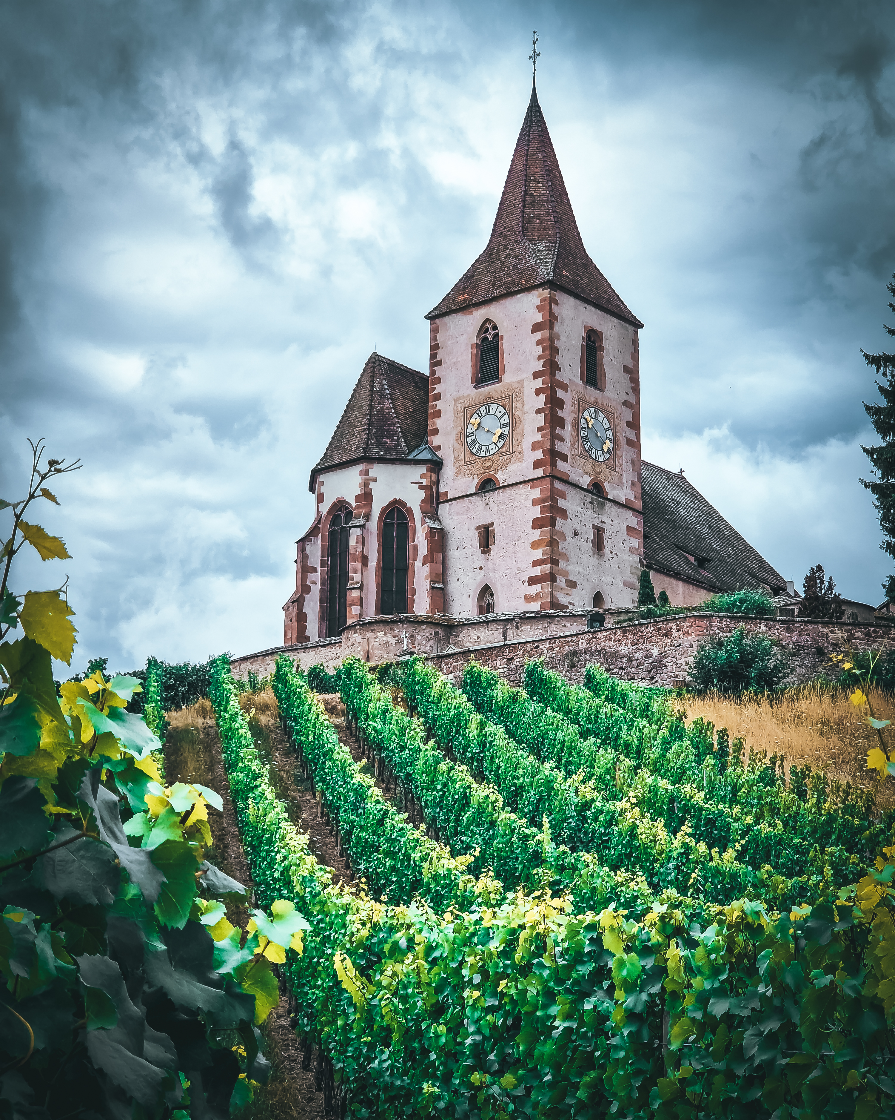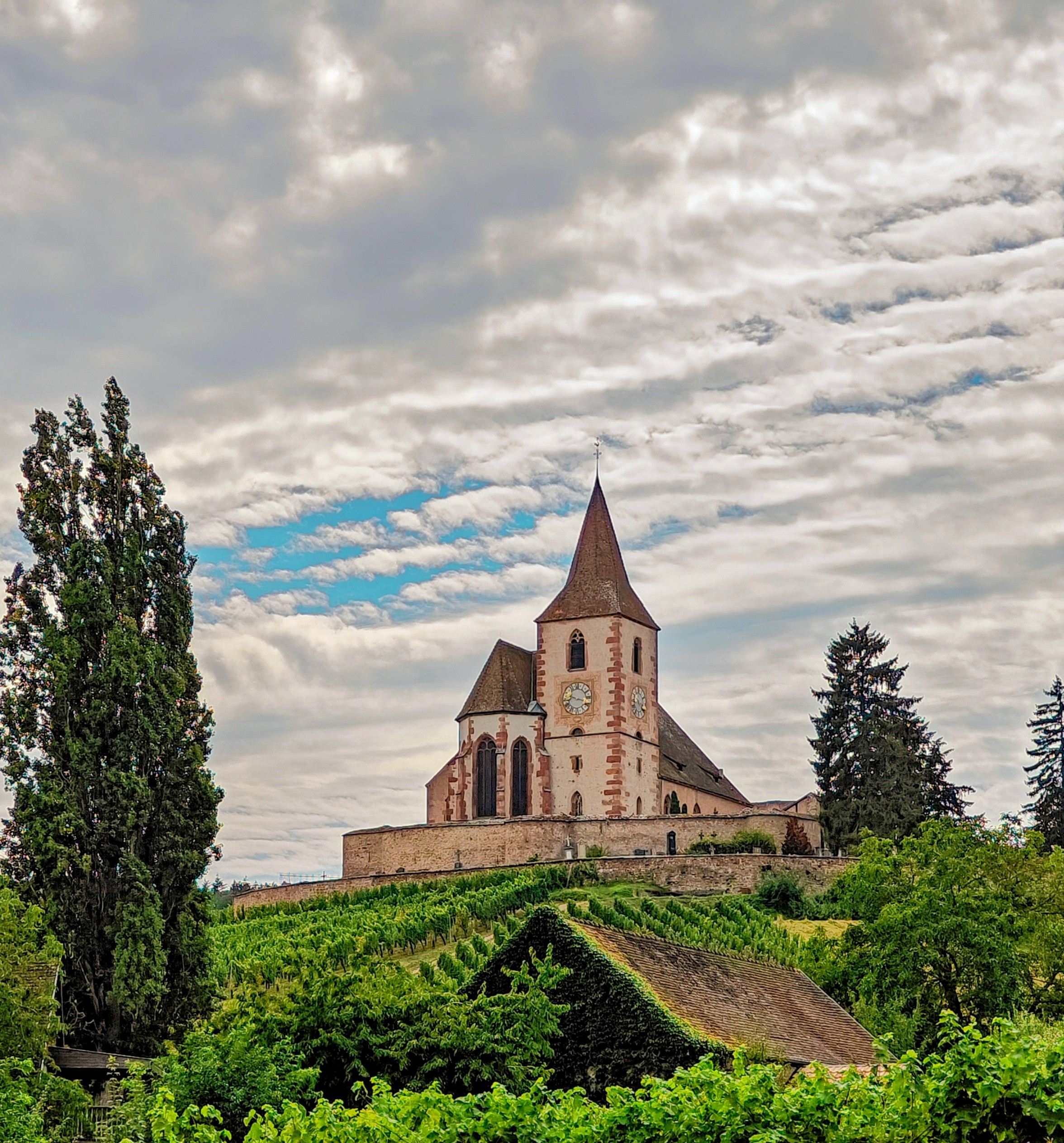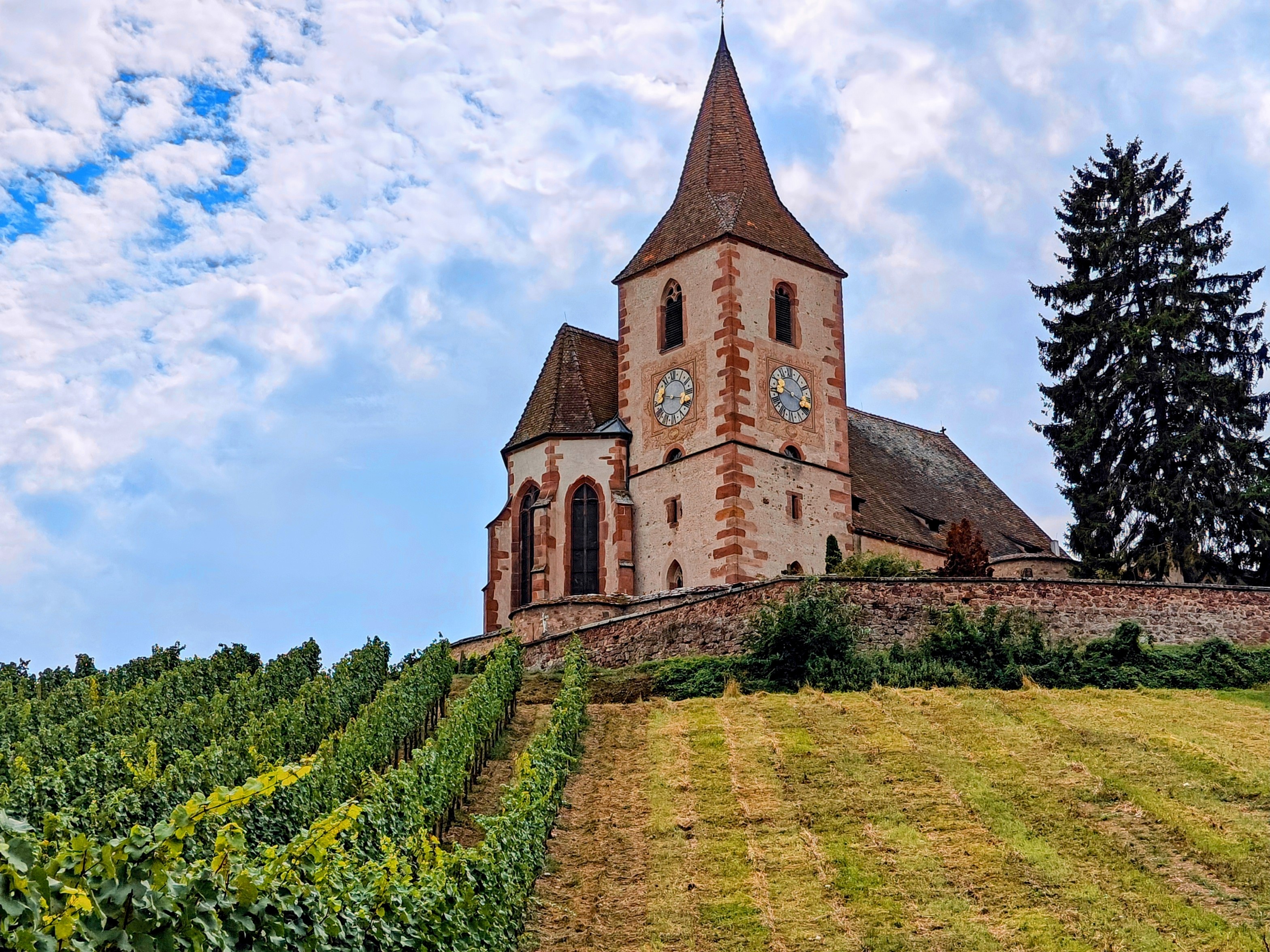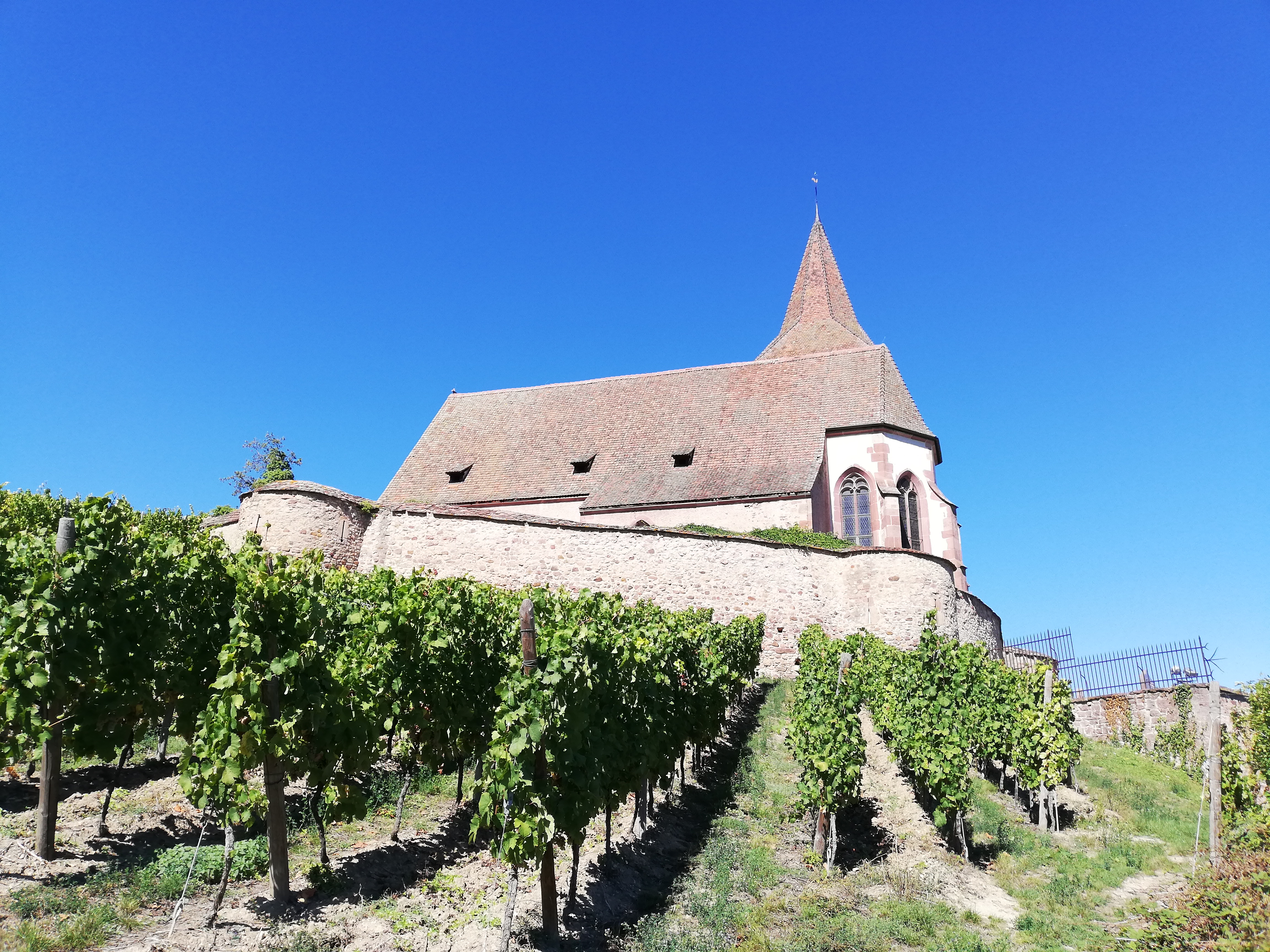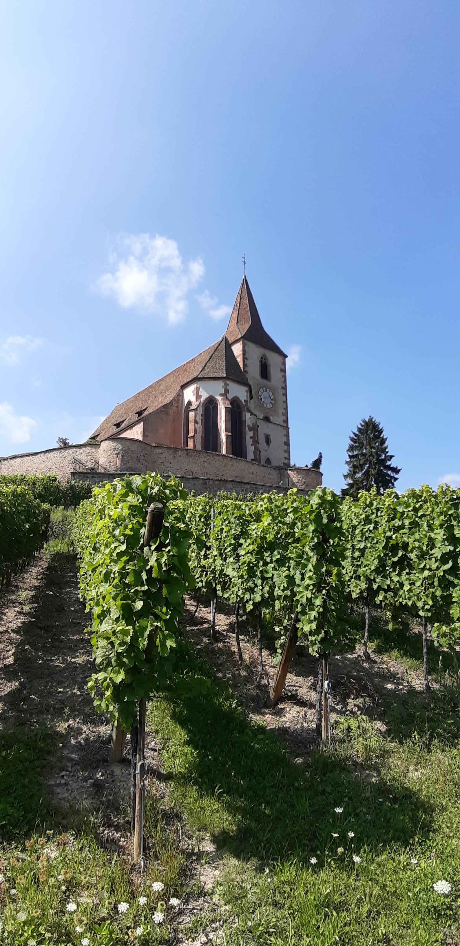 Belle église fortifiée au milieu du vignoble alsacien.