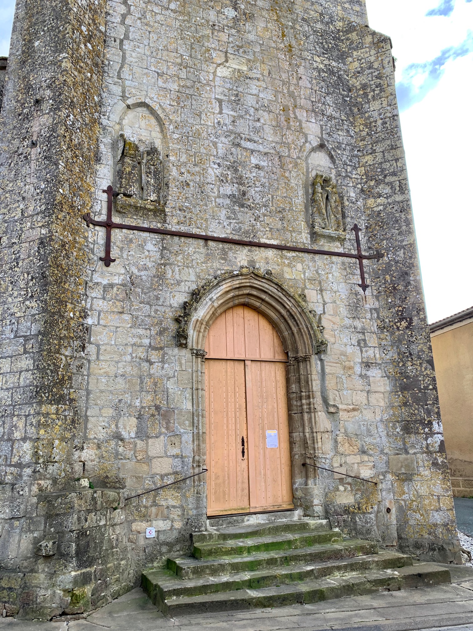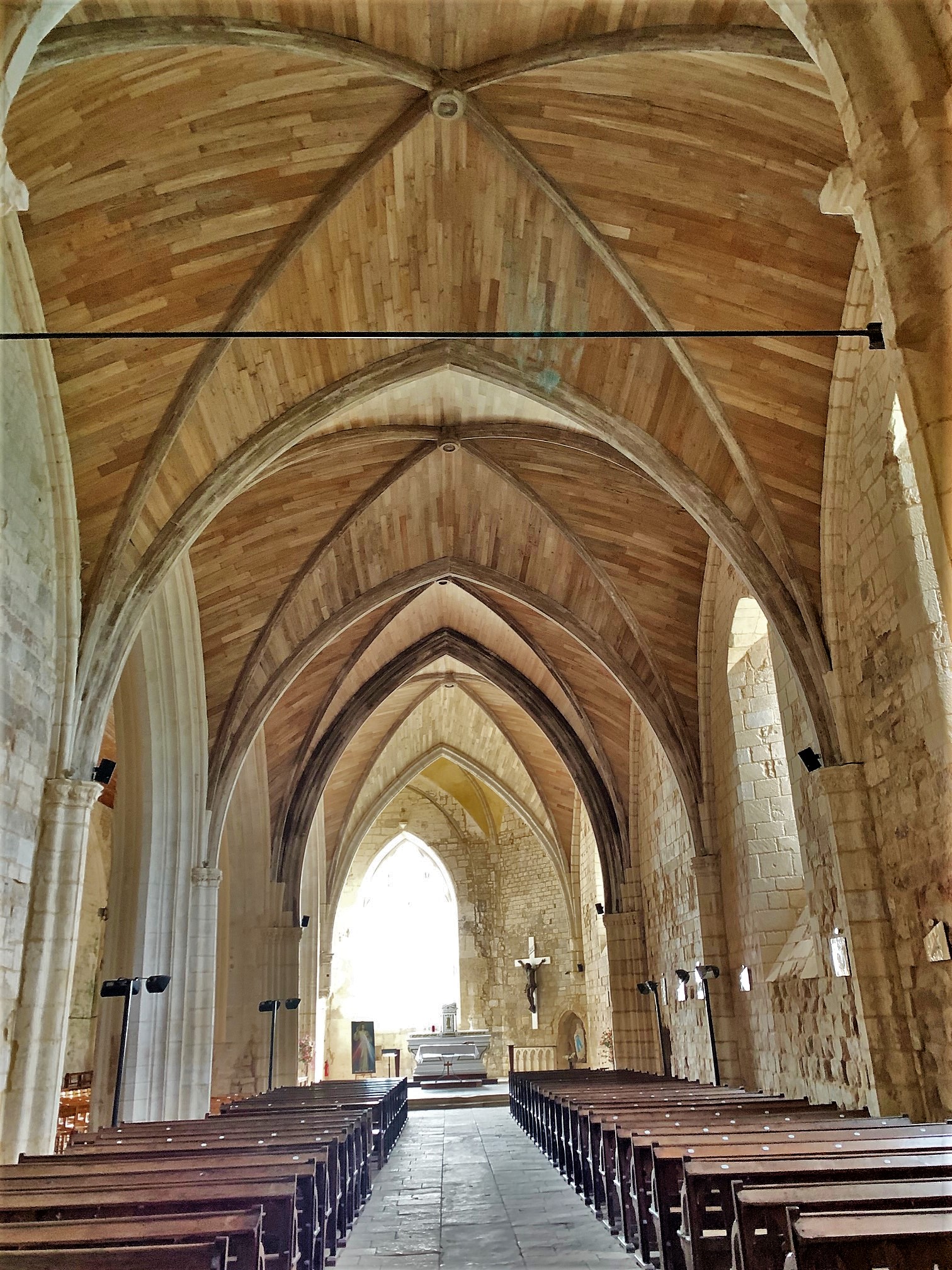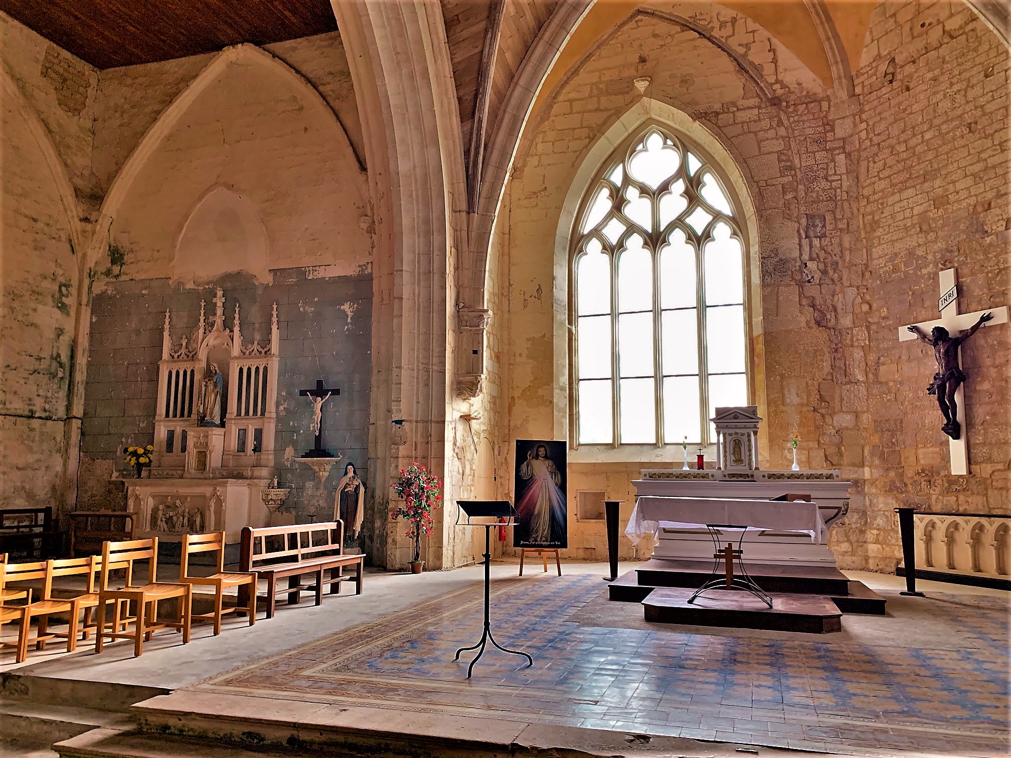 Pour la visiter, je suis allé chercher les clefs à la mairie, une personne très accueillante m'a reçu et m'a présenté rapidement l'édifice. En entrant dans cette église, construite du 12ème siècle au 14ème siècle et classée en 1985, j'ai été surpris par l'esthétique des lieux. Cette église médiévale restaurée est éclairée par des verrières, équipées de vitraux contemporains de l'artiste internationale Sylvie Blocher. L'un des vitraux décline des prénoms de femmes nées dans la commune depuis la révolution, semblant répondre aux bancs anciens qui meublent la nef et portent les patronymes (noms des familles des pères). Un autre décline les dénominations du prénom Marie, un autre porte un texte dédicacé décrivant la démarche et l'histoire de cette création. L'artiste a travaillé avec des vitraillistes. Ces maîtres verriers lui ont permis de mélanger une technique presque millénaire, la grisaille avec la sérigraphie, technique qui vit le jour au 19ème siècle. Le bas côté a reçu un plafond en bois et la nef une voûte en bois à croisée d'ogives, rappelant la voûte en pierre du 15ème siècle détruite pendant les guerres de religions. J'ai finalement trouvé beaucoup de cohérence et d'harmonie dans ces mélanges architecturaux. Ce lieu pour tous, reçoit des offices, mais aussi des concerts, une vie cultuelle et une vie culturelle qui lui assurent une pérennité.