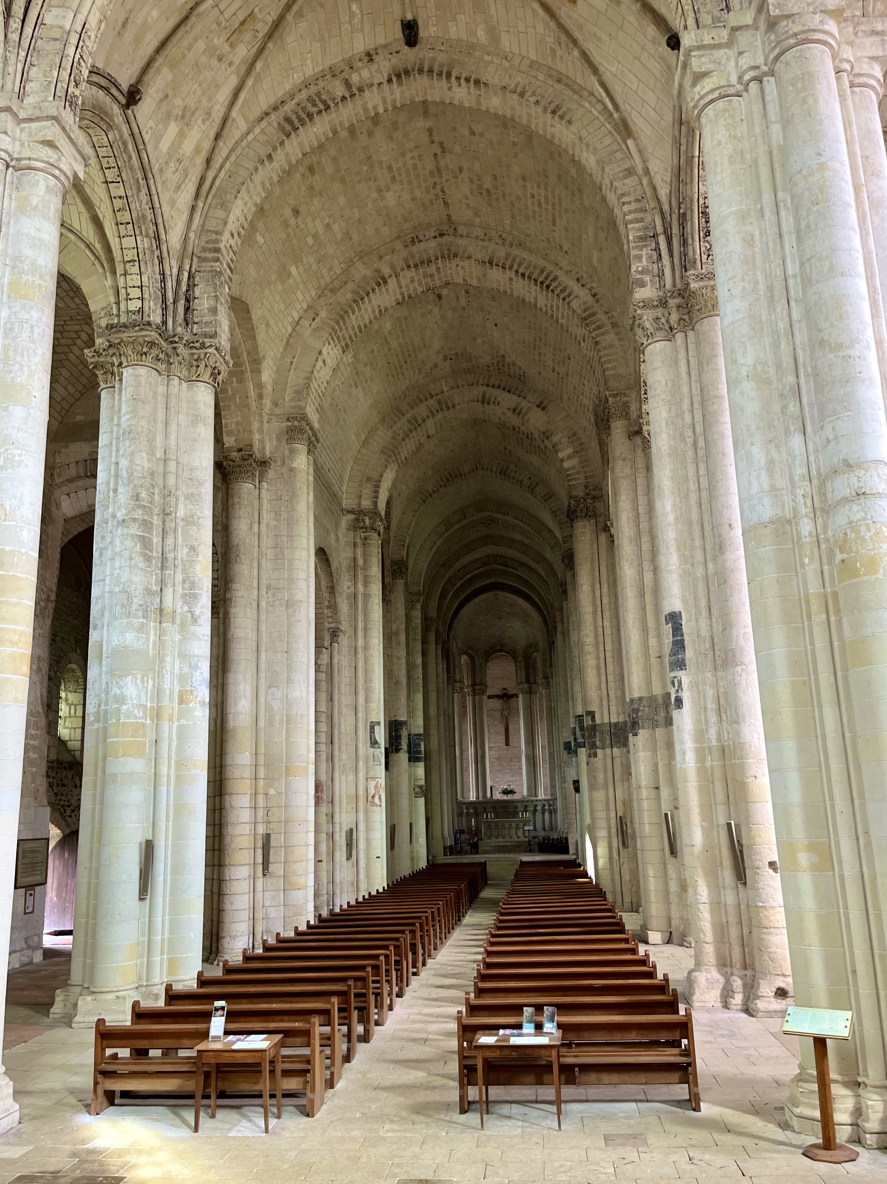 Joli témoignage du roman finissant. Les polychromies sont intéressantes. A noter les traces d'inachement soudain et encore visibles dans la sculpture. Le chœur et son déambulatoire sont très jolis. Les chapiteaux, bien que hauts, permettent de voir de beaux travaux de ciseaux. Le dépouillement intérieur laisse quand même un peu sur la faim.