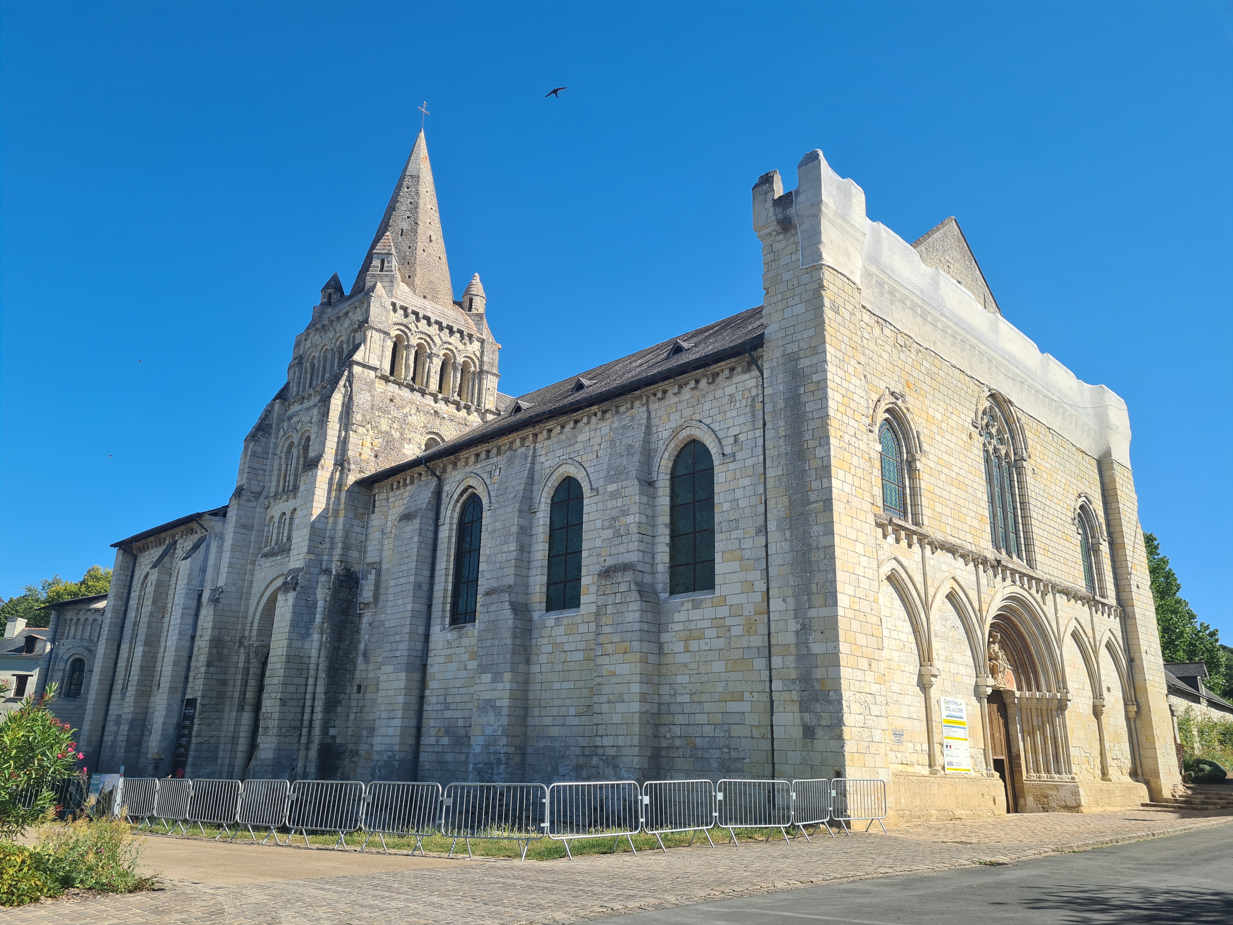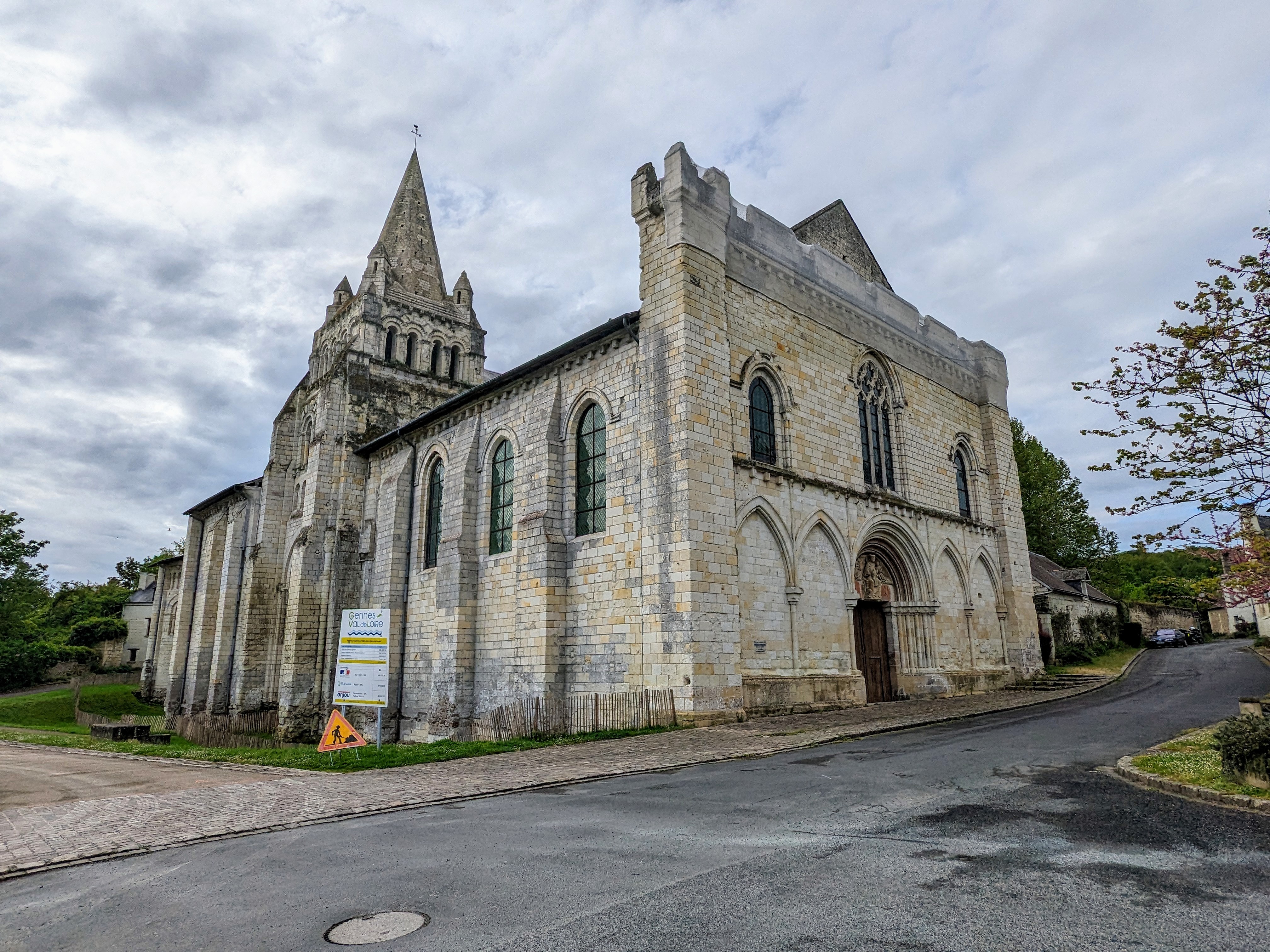 Une église incontournable qui possède l'une des nef romane les plus vaste de France, dotée de 223 chapiteaux sculptés en feuillages ou historiés. Construite du 11ème au 15ème siècle, les dernières travées de la nef sont de style gothique plantagenêt. Des objets précieux sont à découvrir, une châsse du 13ème siècle, un chapier, des statues, une Piéta du 15ème, entre-autres. La tour clocher est la plus ancienne d'Anjou. La façade est particulière, par son tympan roman riche d'un beau décor sculpté, surmonté d'une baie gothique et, tout en haut, les créneaux, traces de la fortification de l'édifice au 15ème siècle. Ce monument est classé depuis 1846.
