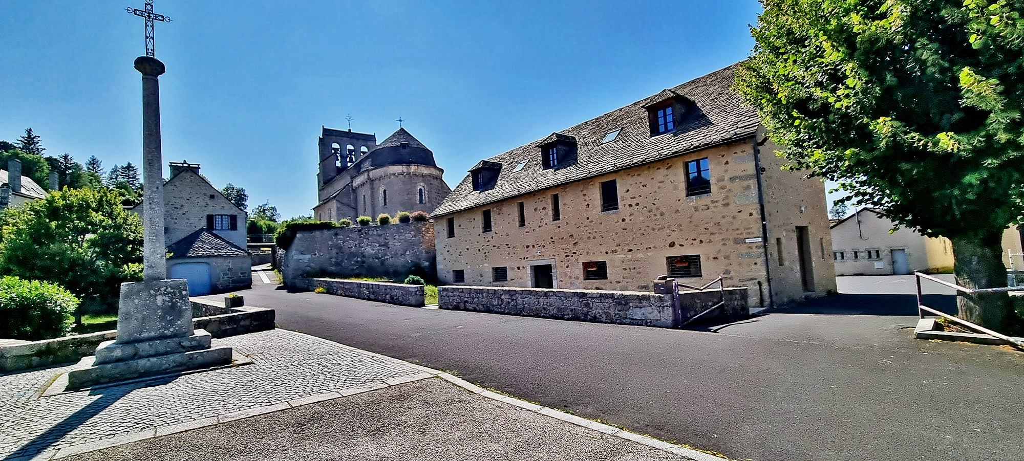 Belle église qui surplombe la.place du village.