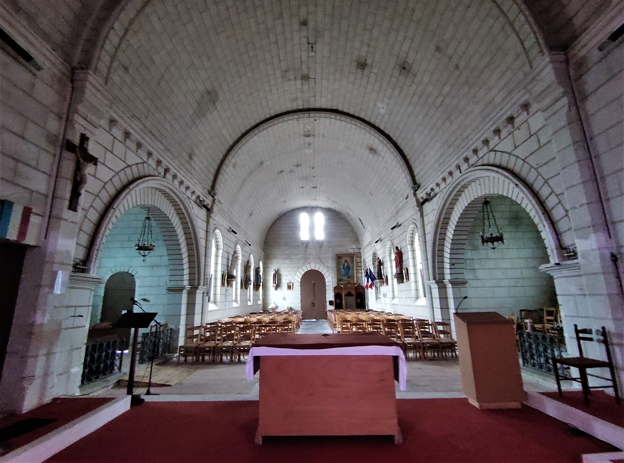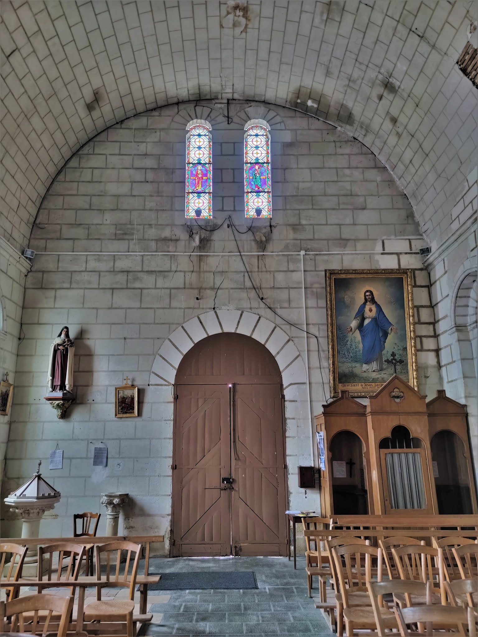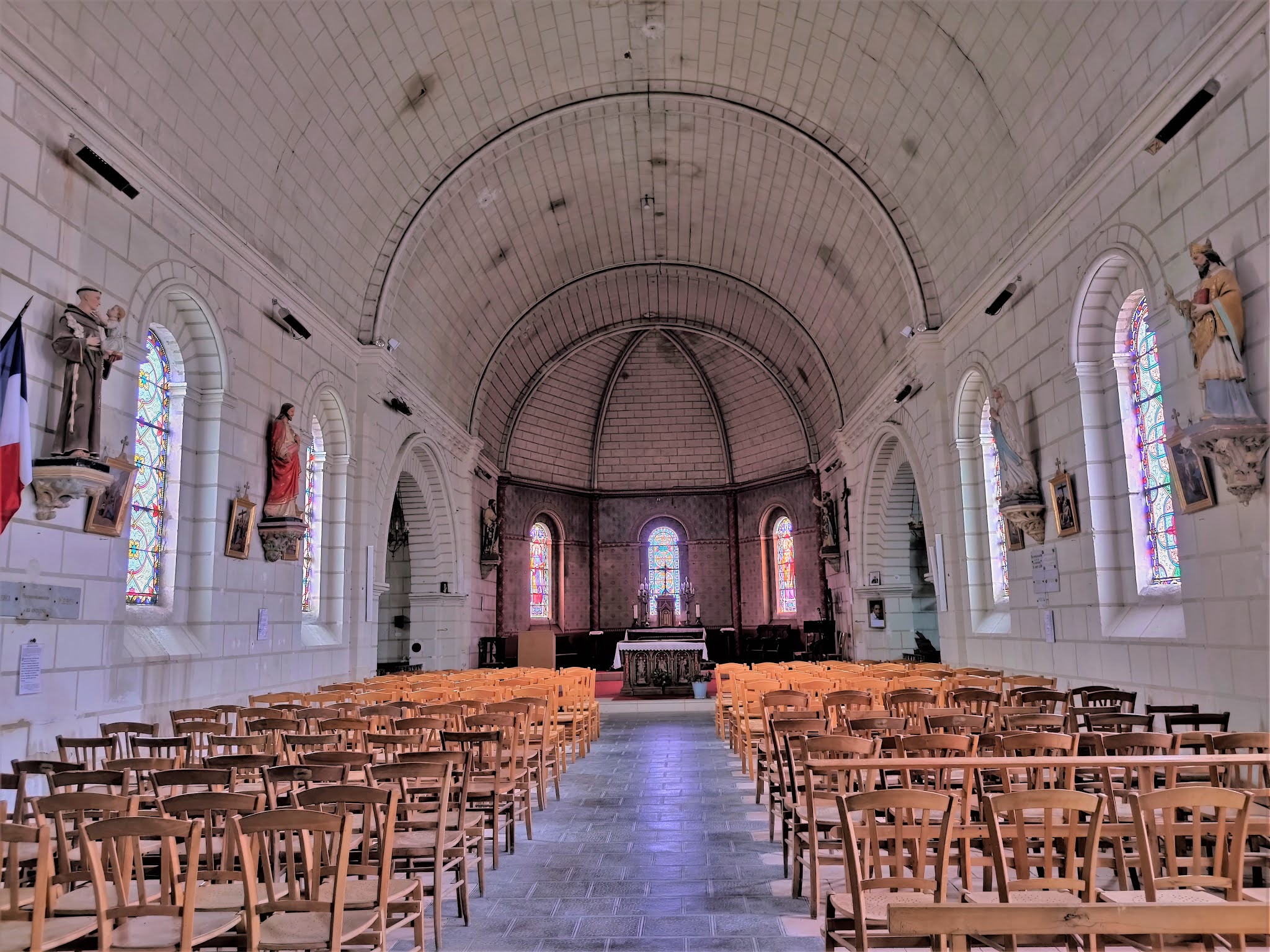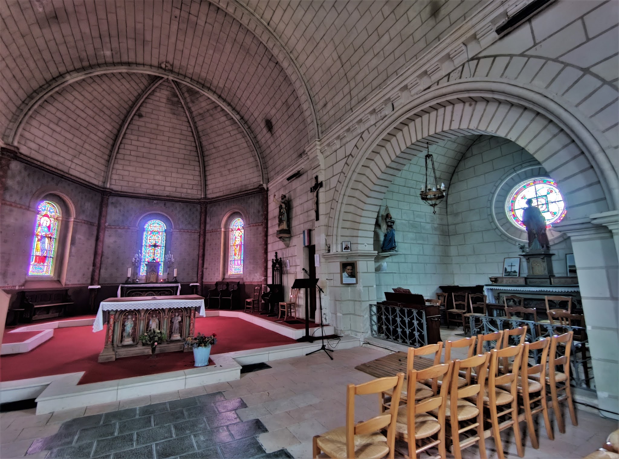 Petite église accueillante, elle est le seul patrimoine architectural de la commune. Il faut emprunter les clés à la mairie qui est située juste à côté. Le clocher du 15ème siècle, accolé au Nord de la façade, est ce qui reste de l'édifice primitif. La nef, le transept et le chœur, ont été construits au 19ème siècle. La travée du chœur et l'abside à trois pans a belle allure, deux autels y sont disposés. Des vitraux du 19ème siècle occupent toutes les ouvertures, ils offrent un éclairage de qualité. La voûte en plâtre du 19ème est en état médiocre, elle mériterait une réfection.