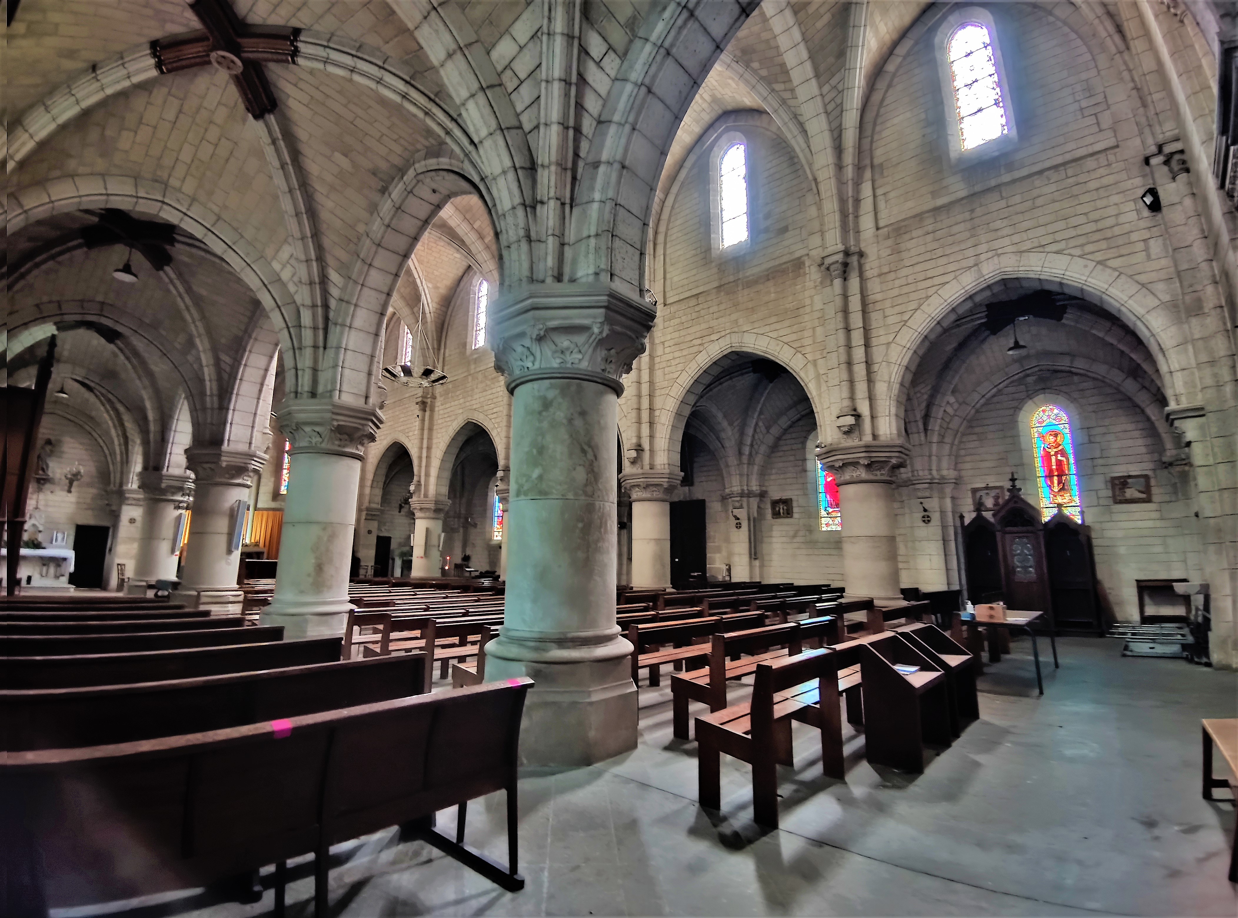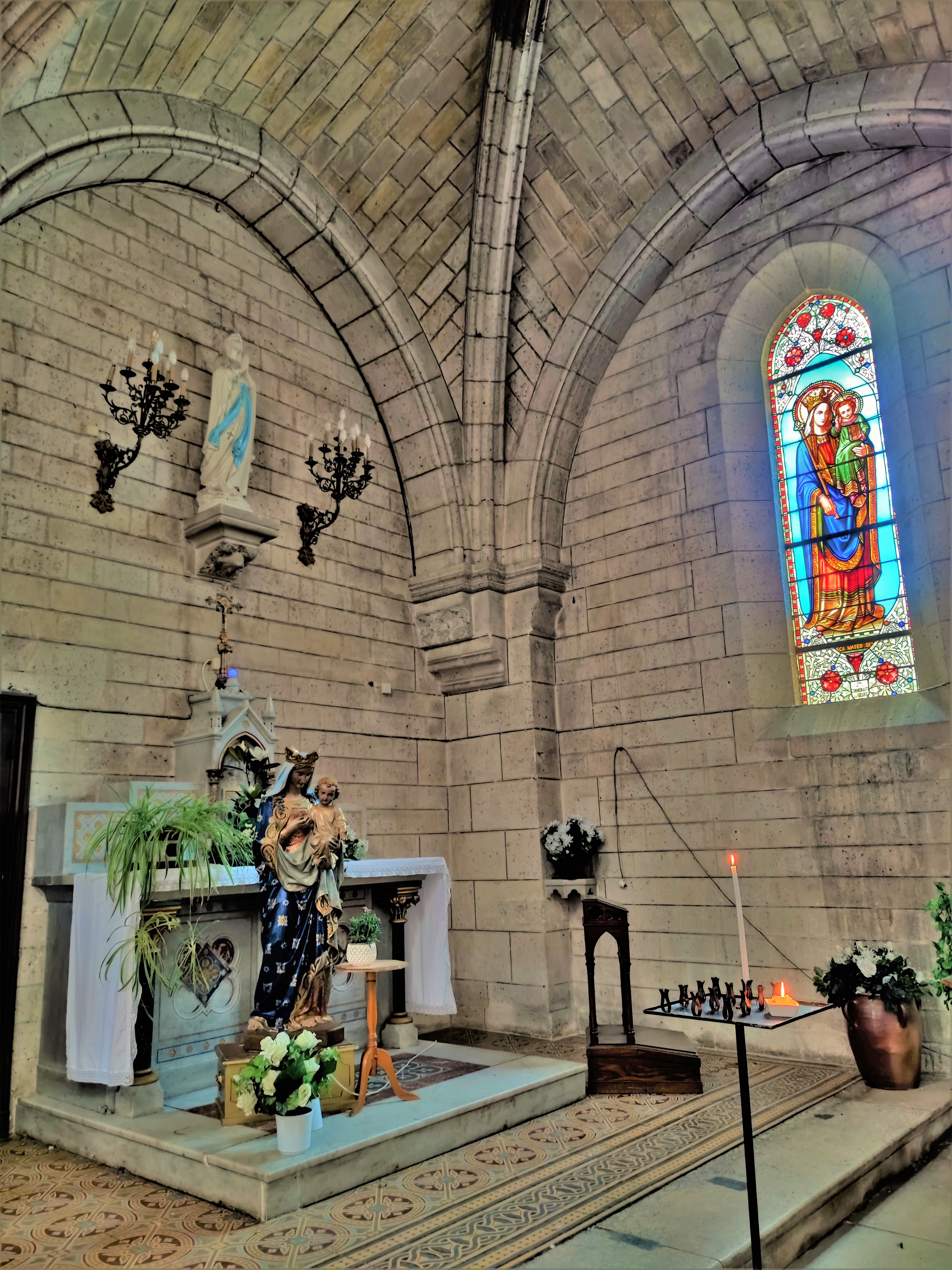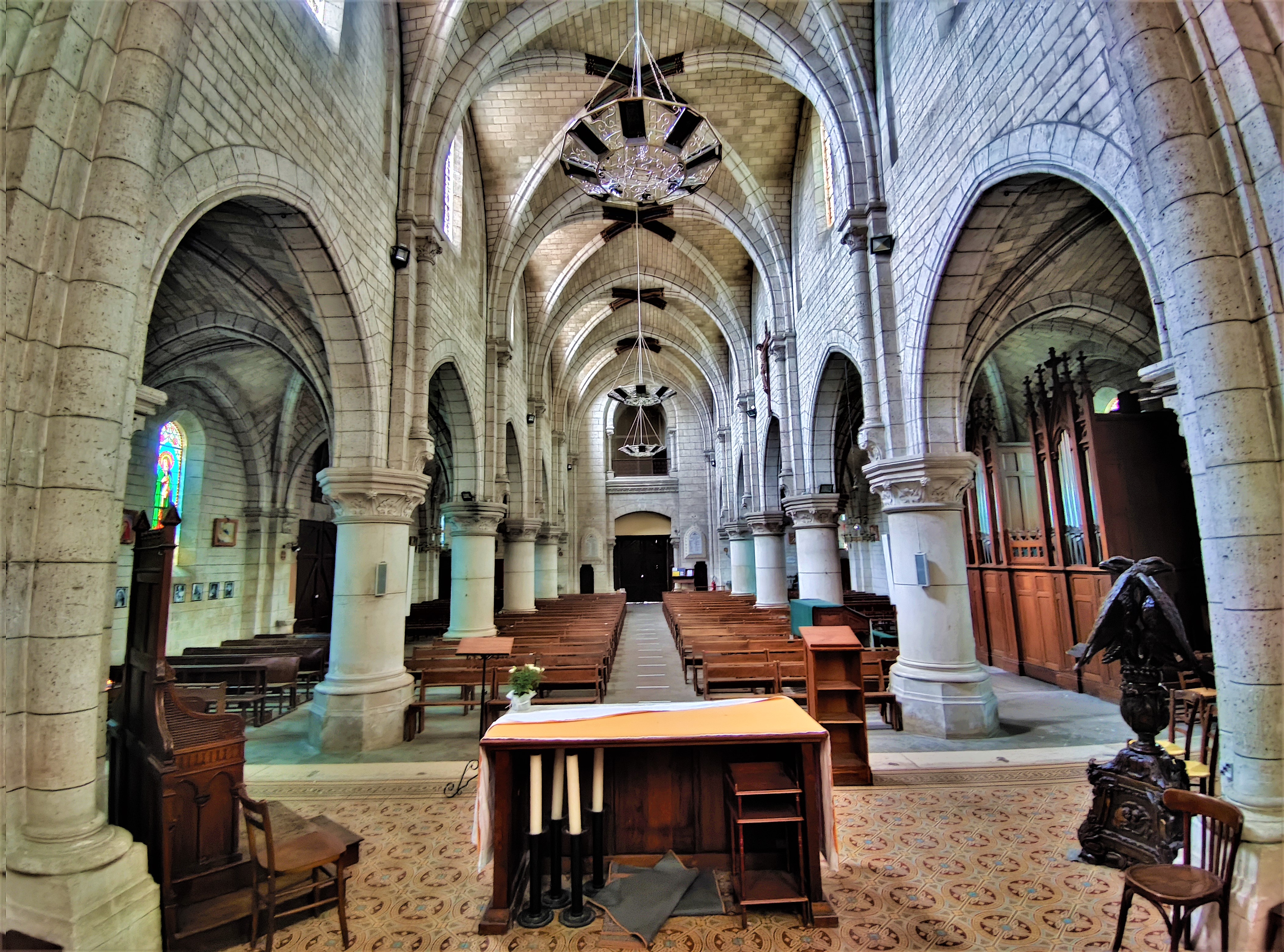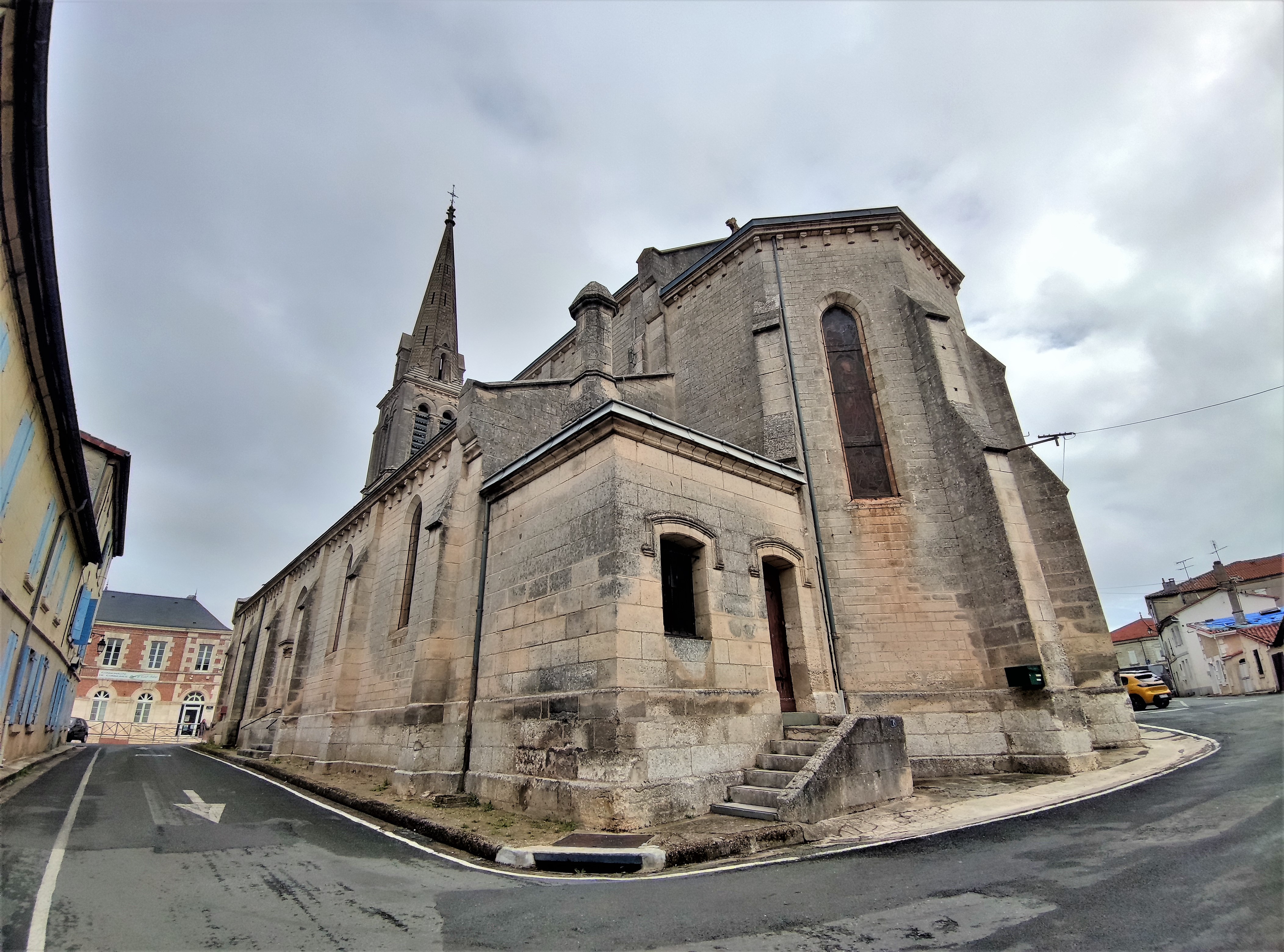 En 1789, de la Révolution une nouvelle paroisse naquit. La Roche-Chalais dut construire une église. Entre 1806 et 1810, la commune dressa pour cette paroisse l'église Saint-Napoléon ; pas Bonaparte mais un Saint-Napoléon ayant vécu au 3ème et 4ème siècles. Moins de 60 ans après sa construction, sans doute mal entretenue, probablement mal construite, l'église devenue trop petite tombait en ruine. On construisit alors l'édifice actuel entre 1868 et 1872, consacré à Notre-Dame ; clocher-porche, nef à 3 vaisseaux, croisées d'ogives, abside pentagonale et vitraux du 19ème. Une église bien agréable dans cette cité où se côtoient les 2 religions chrétiennes historiques de France, un temple fut aussi construit.