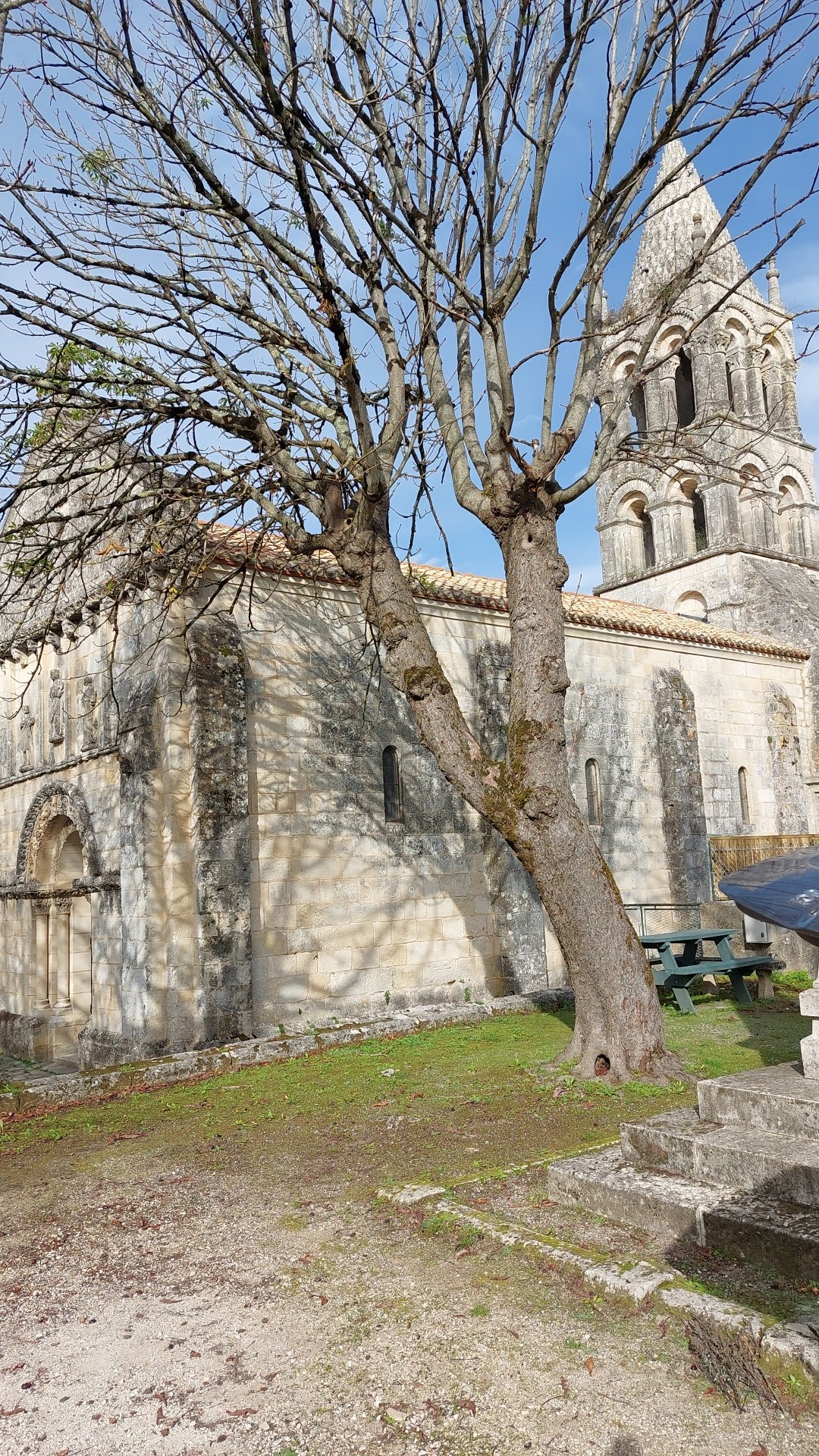 L'église Notre-Dame à Trois-Palis, construite au 12è siècle, possède d'intéressants décors sculptés. La façade attire le regard, construite sur trois niveaux, le pignon-fronton et le niveau intermédiaire sont pourvus de bas-reliefs, le niveau du bas est percé du portail dont les voussures sont richement décorées. Cette église est classée par les MH depuis le 12 juillet 1883. L'abside romane qui avait été remplacée par un chevet plat au 14è et les voûtes primitives effondrées au 18è ont été reconstruites au 19è. L'église était fermée lors de mon passage, la mairie aussi ; renseignements pris à mon retour, pour être sûr de la trouver ouverte, il faut contacter la mairie quelques jours avant de venir.