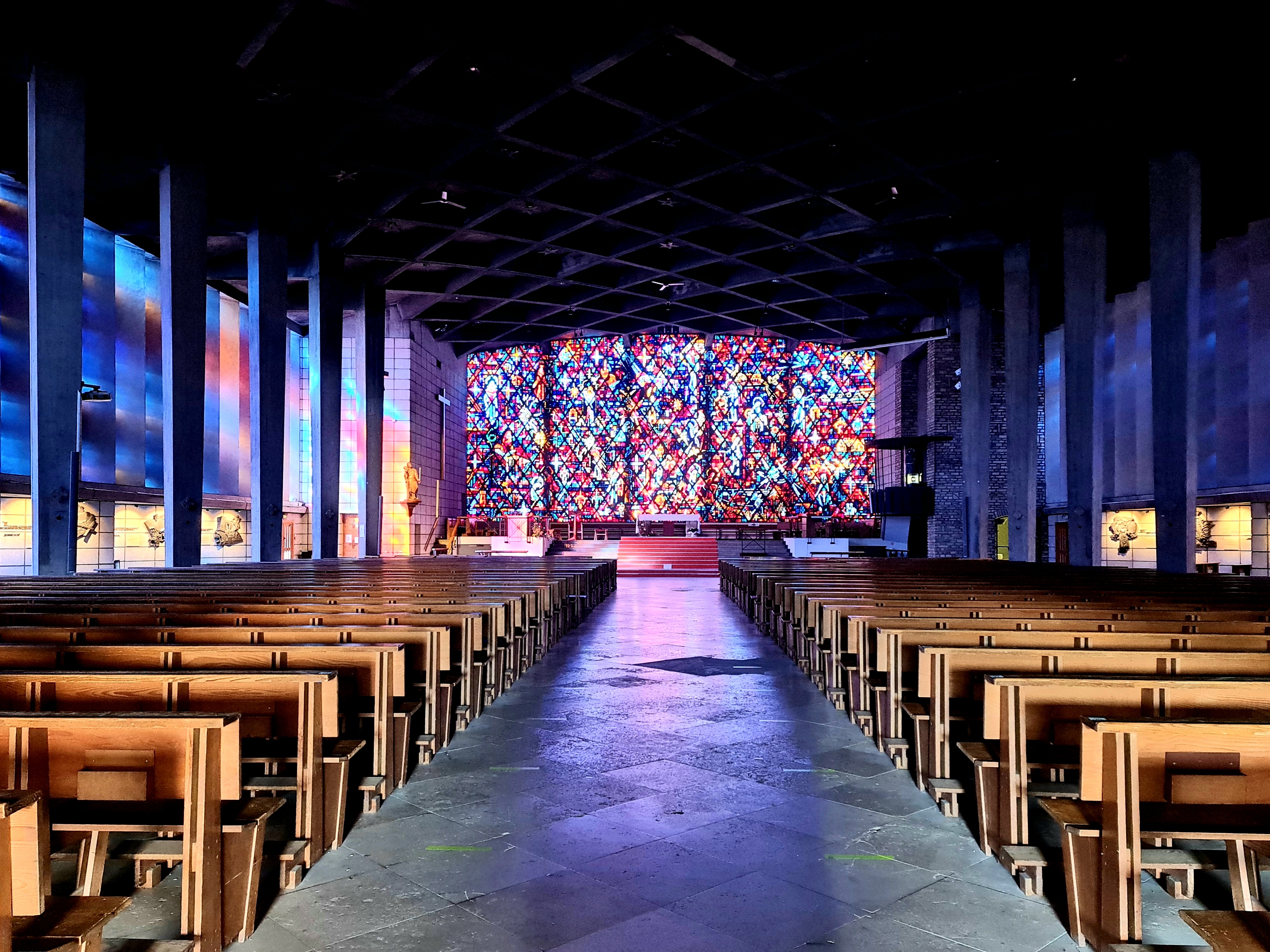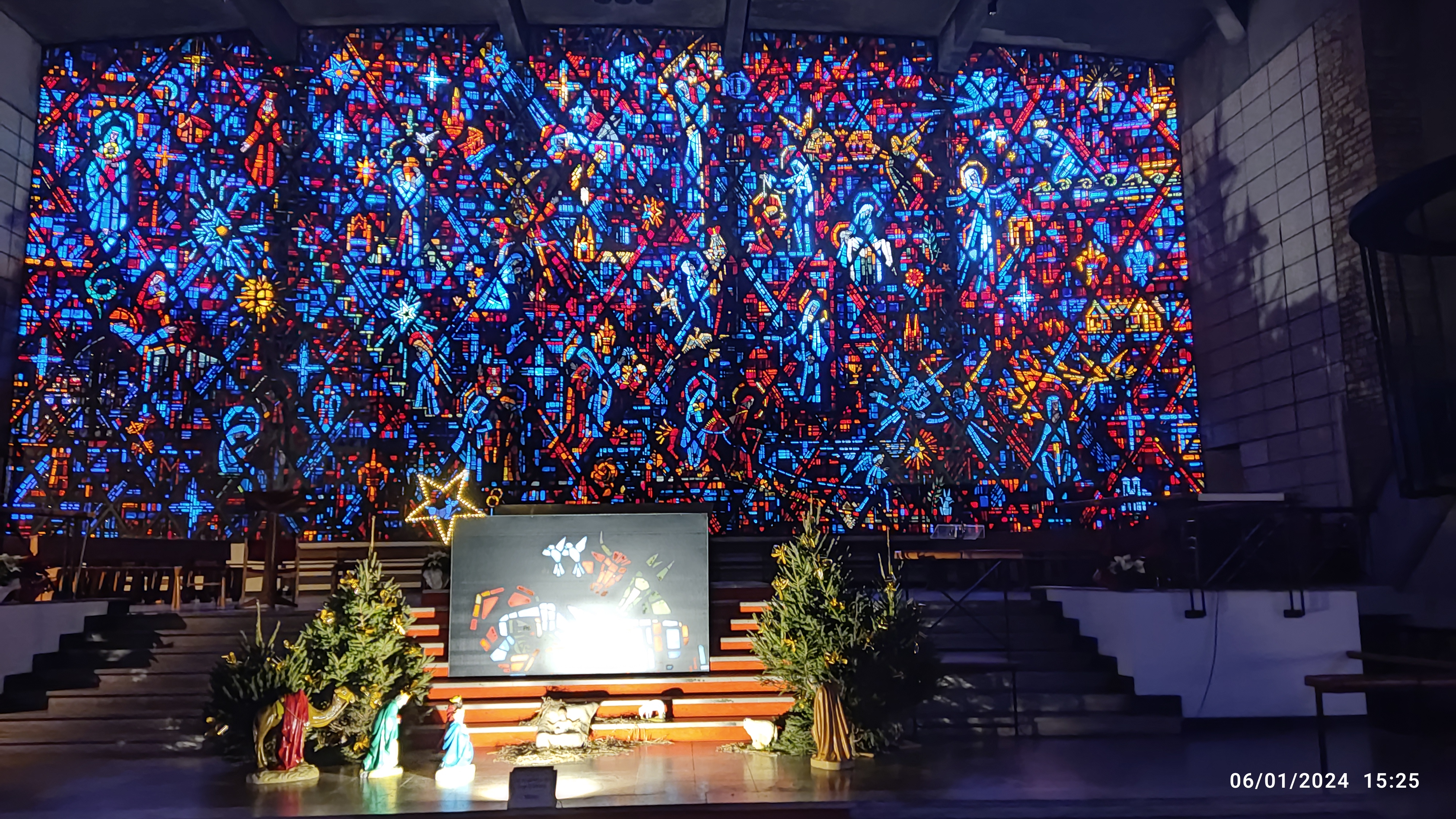 Une église particulièrement belle. Élégant et moderne mais très serein. De magnifiques vitraux représentant diverses églises du monde entier. Lorsque notre groupe a visité l'église, il n'y avait personne d'autre et la cloche a commencé à sonner. Qui vaut la peine d'être visité.