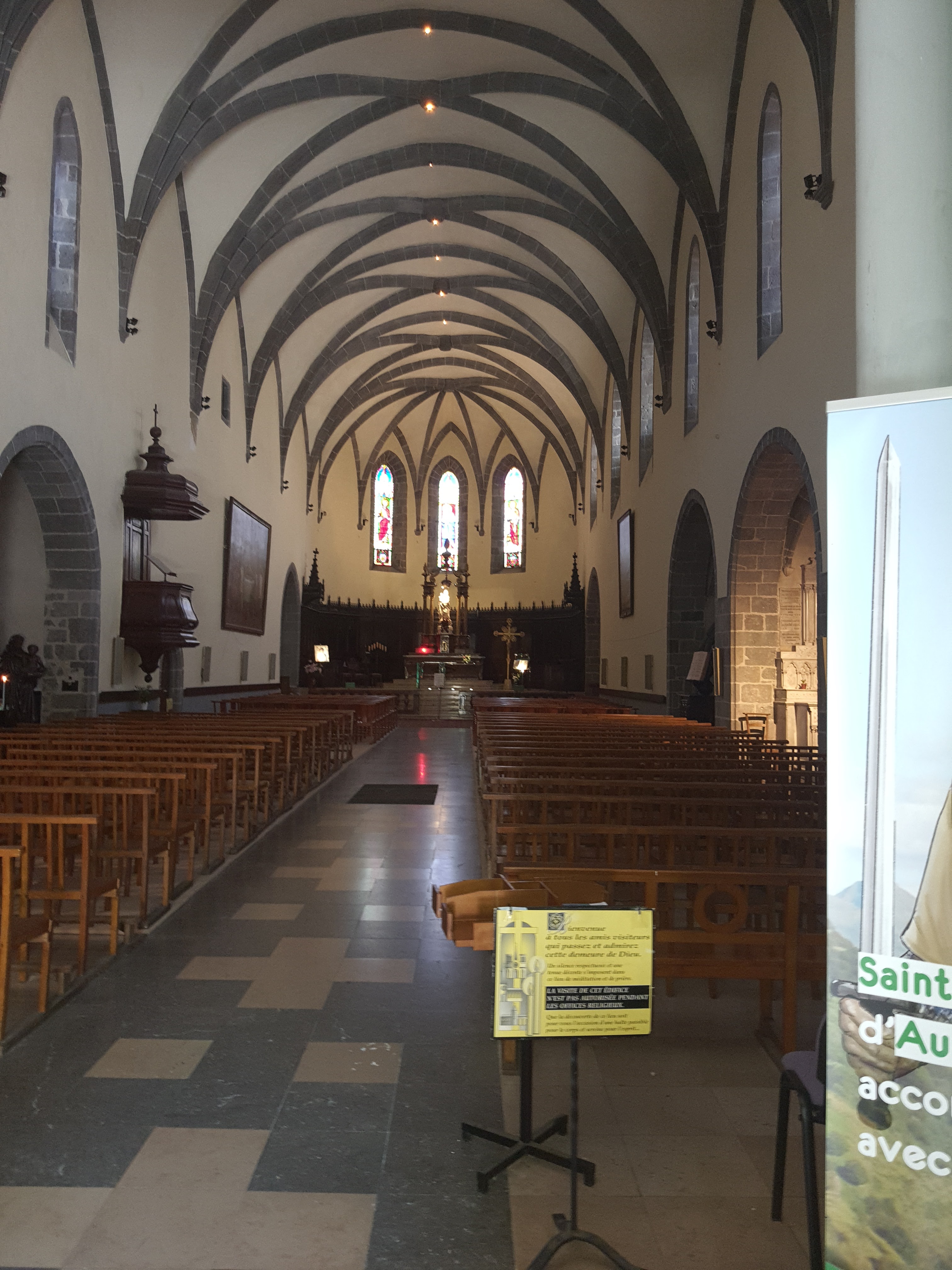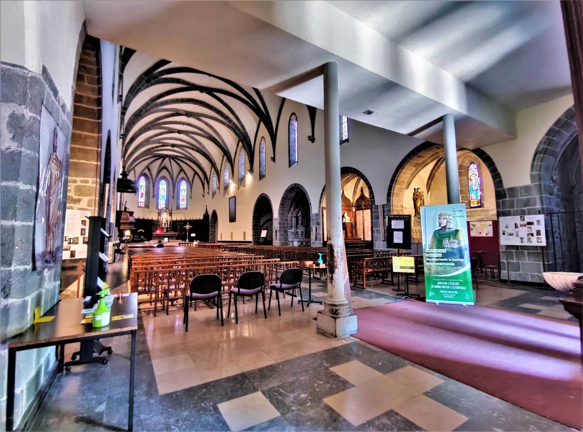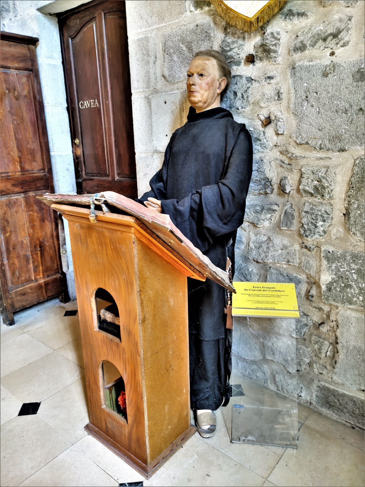 Son nom commémore une victoire improbable et une Vierge Noire ou Noircie est visible dans la salle des Cordeliers. Durant la nuit du 4 au 5 août 1581, les protestants qui avaient envahi la cité furent mis en déroute par les habitants d'Aurillac. Ces derniers bénéficièrent d'un phénomène microclimatique ou d'un miracle, selon les sources, à l'origine du nom de cette église. Une épaisse couche de neige tomba, déconcertant les agresseurs qui ne pouvaient se dissimuler. Eglise à nef unique du début 13ème siècle, inscrite par les M.H. en 1977, elle fut modifiée au 14ème et au 17ème siècles. A ces périodes, elle est agrandie d'un ensemble de chapelles formant comme des collatéraux. Les styles architecturaux propres à chaque période se côtoient dans une belle harmonie. Ancienne chapelle d'un couvent des Cordeliers, cette église fut dévastée par les protestants en 1569 comme les autres bâtiments religieux de la ville. Restaurée au 16ème et 17ème siècles, d'autres campagnes de restaurations suivirent, le clocher fut reconstruit au 19ème siècle et le chevet restauré. La salle des Cordeliers, ouverte du lundi au samedi de 14h30 à 17h mérite à elle-seule une visite. Un monsieur charmant accueille les visiteurs, ses commentaires enrichissent grandement cette découverte. Cette pièce du 14ème siècle se présente comme une salle du trésor, ou caverne d'Ali Baba. De toutes les richesses présentées, la Vierge Noire est la plus intrigante. La statue d'Aurillac est donnée comme la meilleure copie de la Vierge de Puy en Velay d'après l'eau-forte de Veyrenc. J'ai découvert à l'occasion de cette visite, que ces Vierges noires, celles de Aurillac, Rocamadour, ou Puy en Velay, par exemple, étaient à l'origine, en bois polychrome et/ou recouvertes de pierres et de métal. Elles furent furent noircies pour évoquer l'image des vierges brûlées, pendant les guerres de religions ou la révolution française. Détruire les images pour se débarrasser des superstitions et des traditions, fut une pratique commune aux réformés et aux républicains ; les deux s'inspirèrent de l'inquisition et de ses bûchers purificateurs.