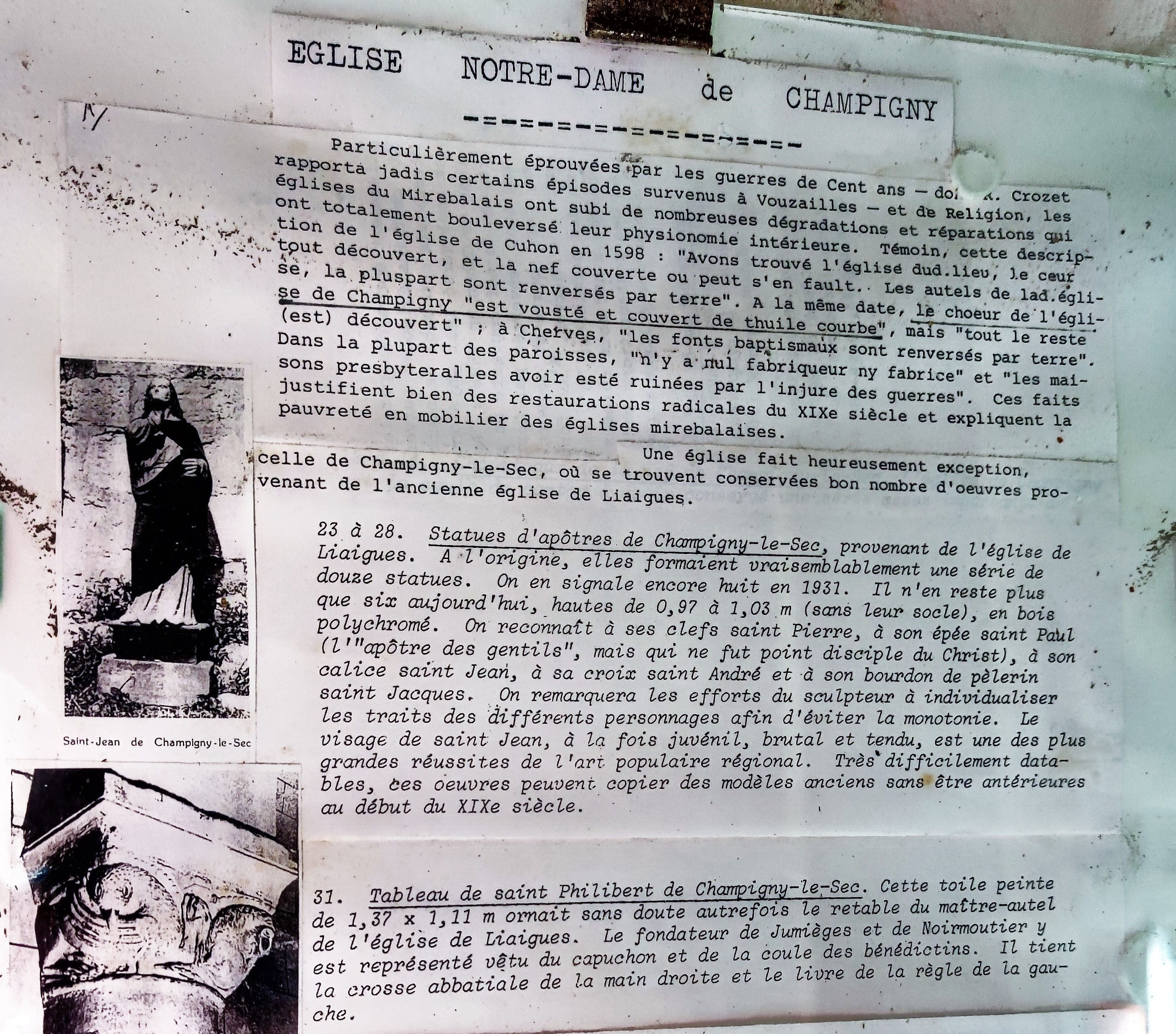 Une église romane préservée, abritée, enserrée dans une église du 19ème siècle. J'encourage cette visite. Deux églises originales et accueillantes sont à découvrir dans cette commune de Champigny en Rochereau. L'église Saint-Vincent, de Le Rochereau, du 19ème et 20ème, témoignage d'une paroisse volontaire et cette église Notre-Dame de Champigny-Le-Sec, qui, elle, s'inscrit dans l'histoire longue. Voilà presque 1000 ans que s'éleva un édifice roman en croix latine que l’on retrouve à l'intérieur, nef voûtée en berceau brisée, coupole sous clocher dans le croisillon Nord, etc... Entouré de collatéraux et autres agrandissements du 19ème siècle. Des coins et des recoins, 3 vaisseaux pour la nef et autant pour le chœur, une église surprenante mais aussi jolie en dehors qu’en dedans. Merci aux premiers bâtisseurs d’avoir bâti une église belle et solide, détruite pour partie pendant les guerres de religions, et si bien restaurée et reconstruite par leurs successeurs. Bel endroit pour s’éloigner des stimulus constants à la surconsommation, cette église peut être aussi un refuge pour une pause spirituelle, quelle que soit sa place sur l’échelle des croyances. Sur le site indiqué ou celui de la mairie, de nombreuses informations sont à découvrir.