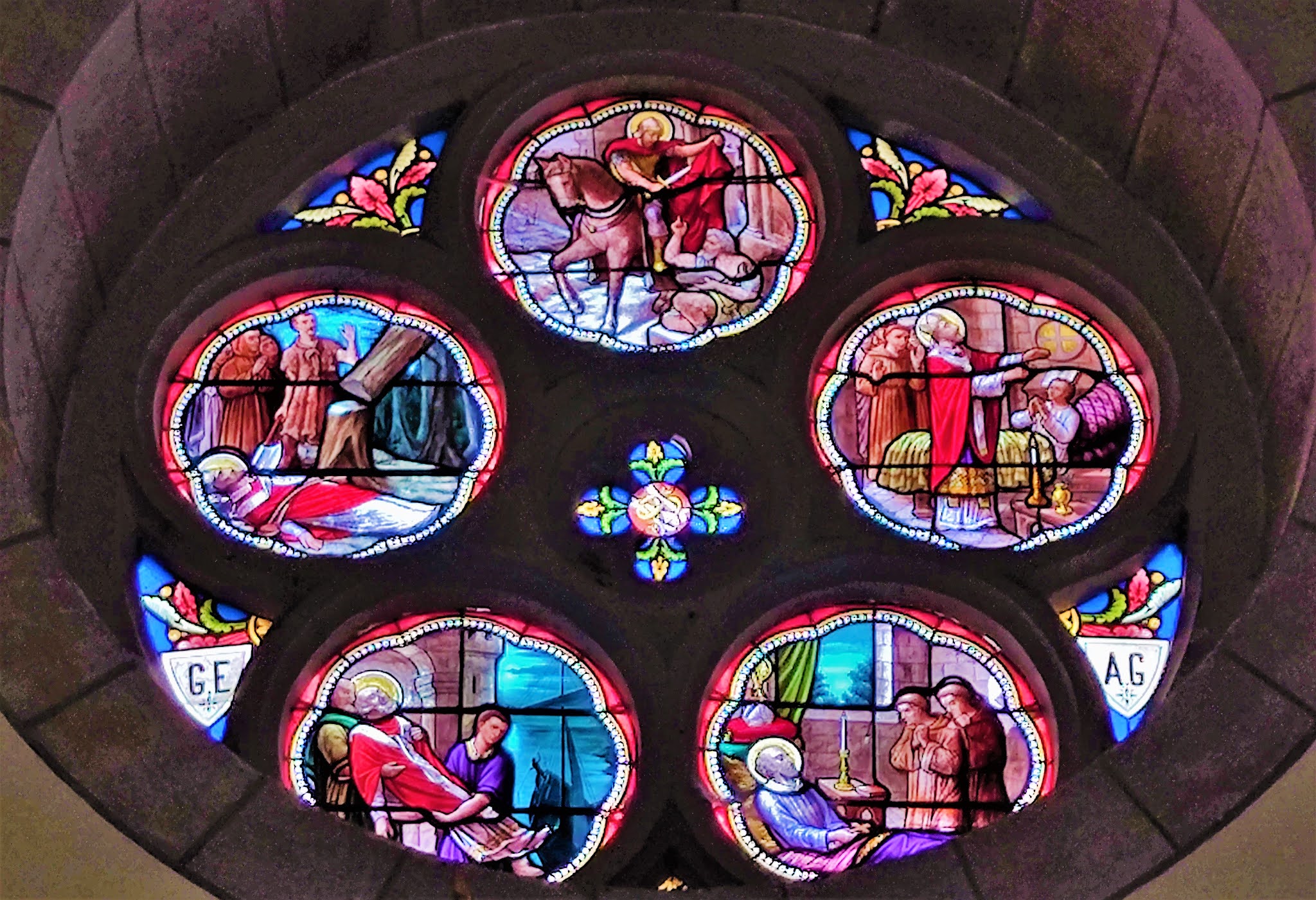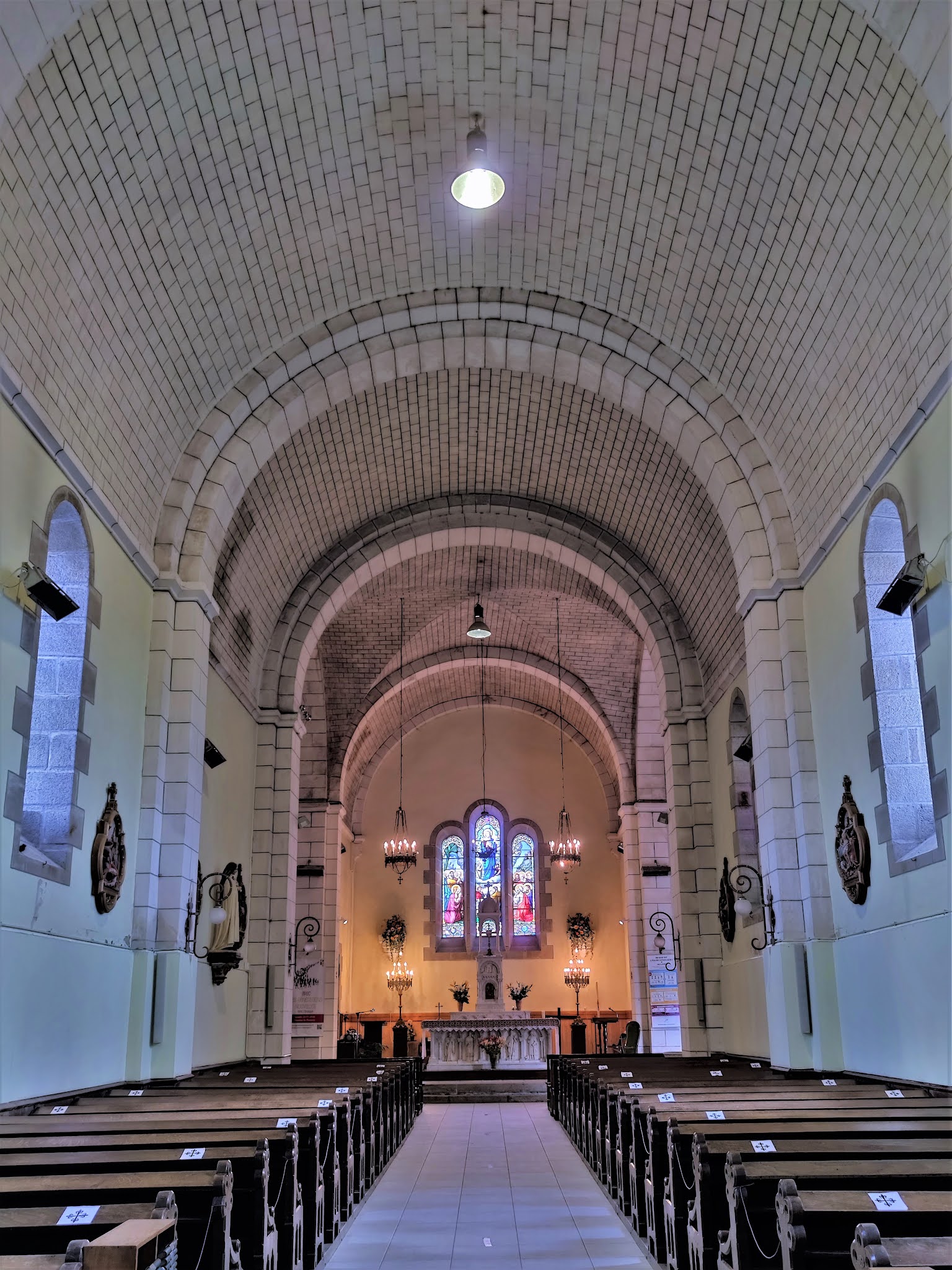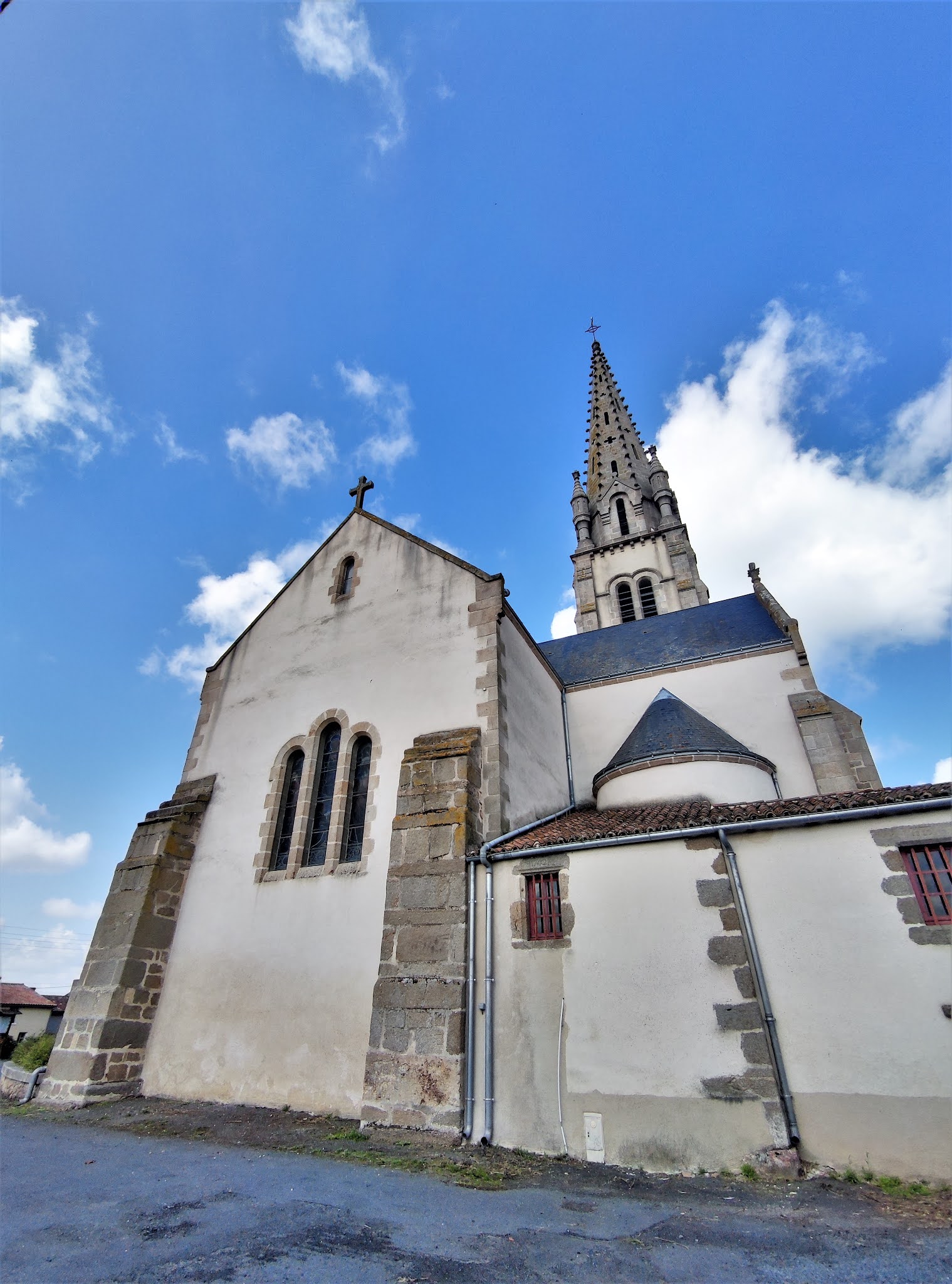 L'église primitive s'appelait église de Sancta-Maria au 11ème siècle, qui devint Notre-Dame 12ème siècle. Devenue millénaire, la structure de l'édifice roman donna de graves signes d'affaiblissement, son clocher s'écroula en 1885. La reconstruction fut actée. C'est donc une église néo romane de la fin du 19ème siècle qui se présente aujourd'hui. Le plan en croix avec transept et chevet plat est classique. Les croisillons possèdent chacun une absidiole, les arcs et ouvertures sont de plein cintre et les voûtes en berceau. L'ensemble est harmonieux, les vitraux se déclinent en rosace, diptyques, triptyque ou verrières simples, ils éclairent fort joliment l'église. Pour visiter cette dernière, il faut s'adresser à la mairie, qui vous redirige vers une paroissienne responsable de l'édifice. Lors de mon passage, la mairie était fermée, des citoyens disponibles ont tout fait pour répondre à ma demande et mon mis en contact avec la paroissienne. L'église est bien mise en valeur, au milieu du village, sur la place éponyme qu'elle domine.