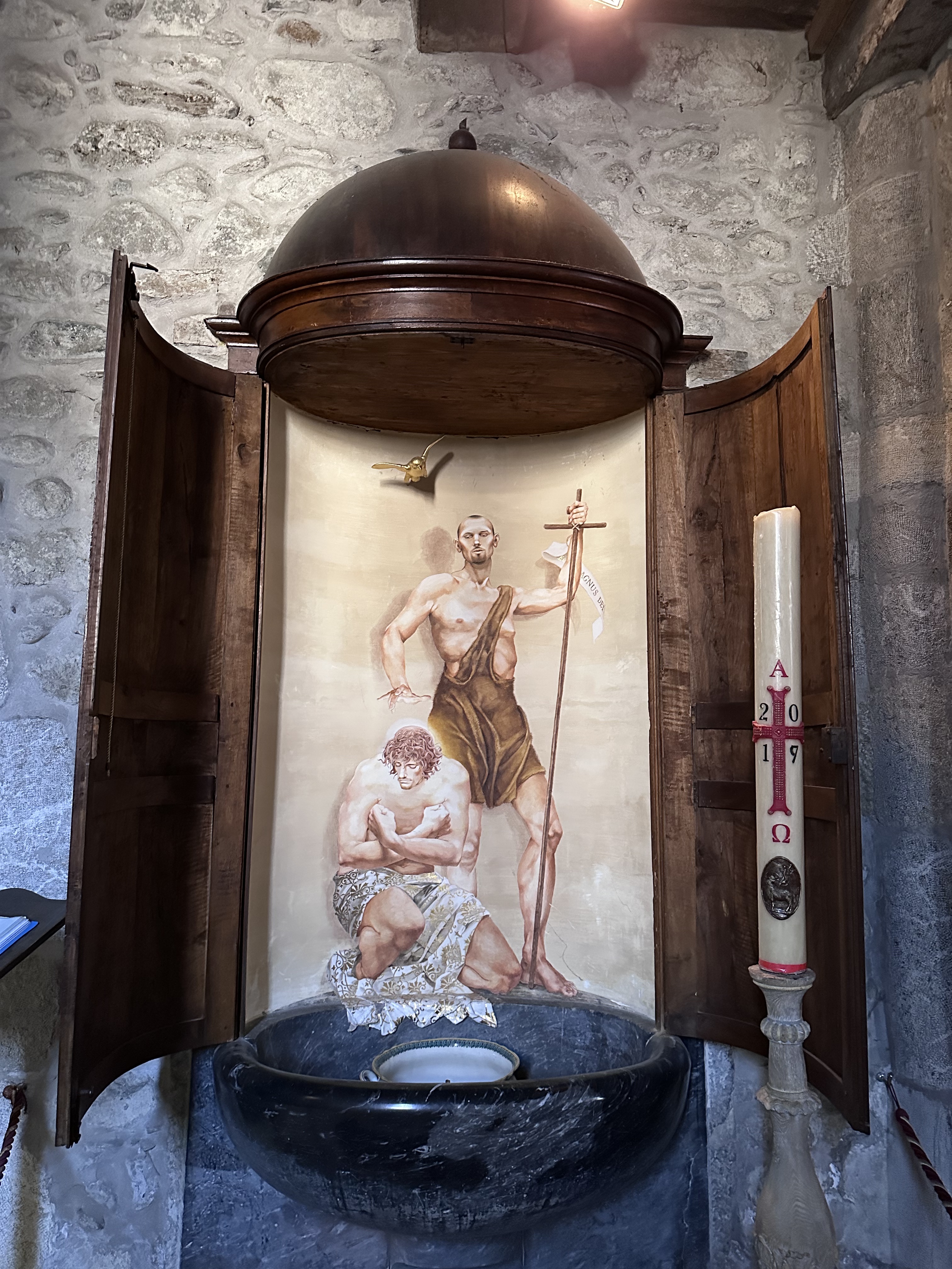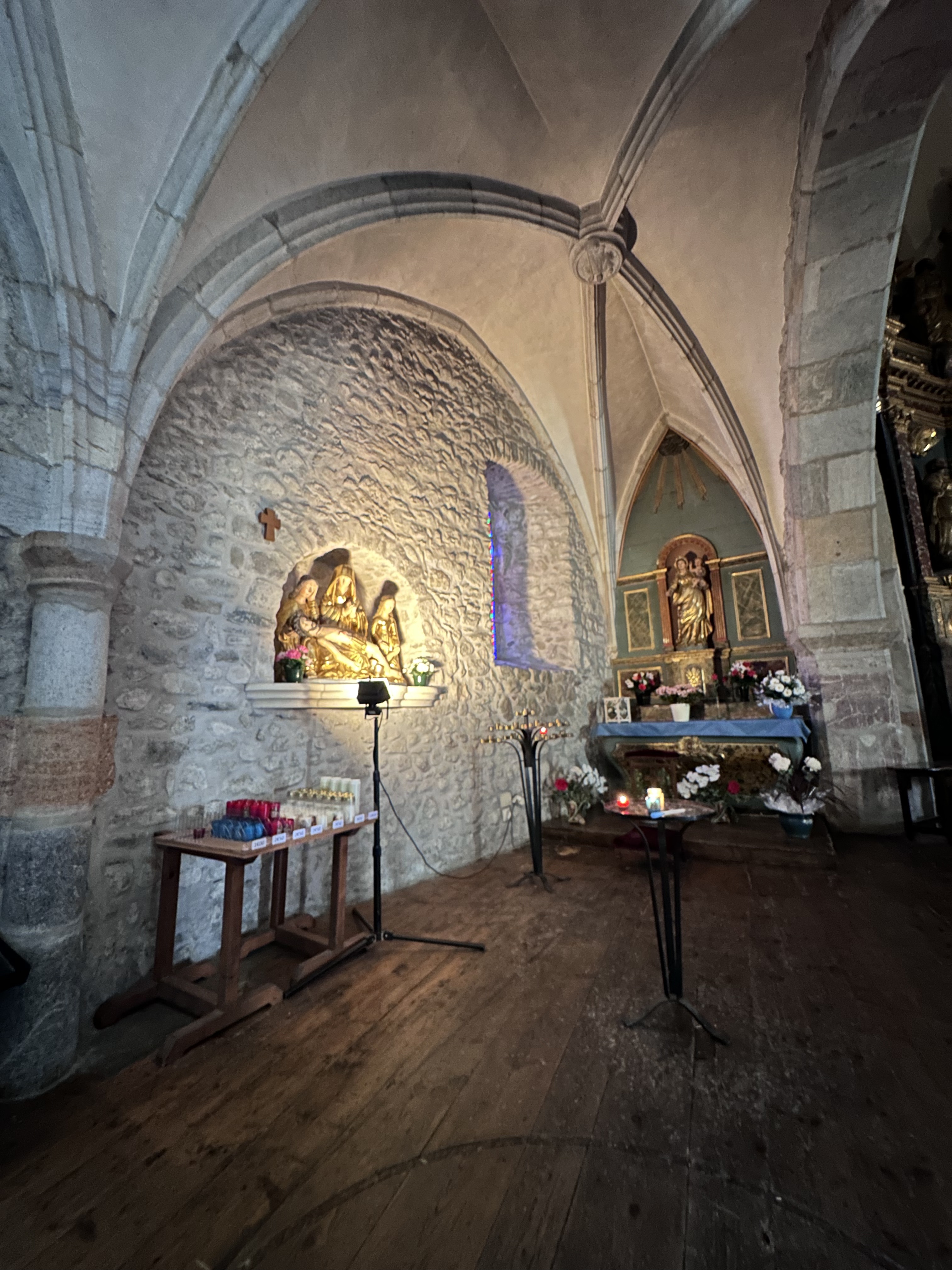 Jolie église avec une pietat ancienne. Tryptique en bois peint.